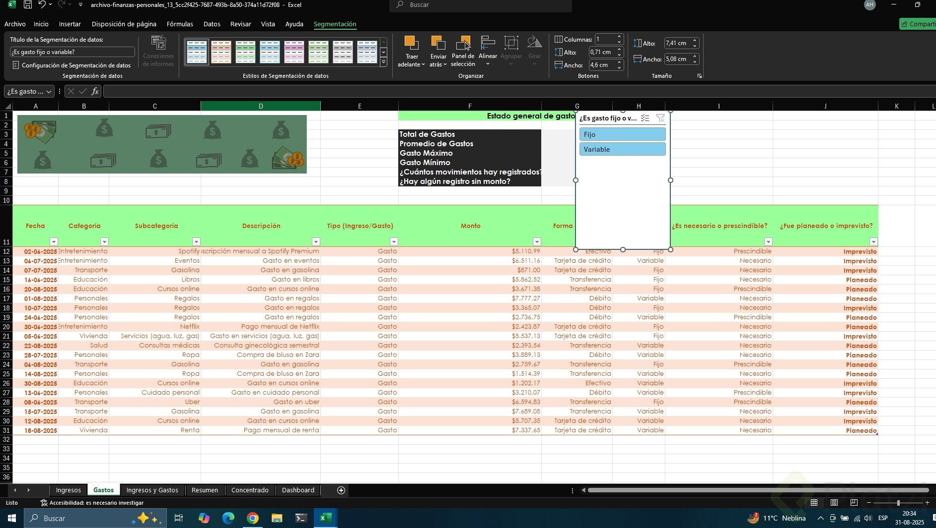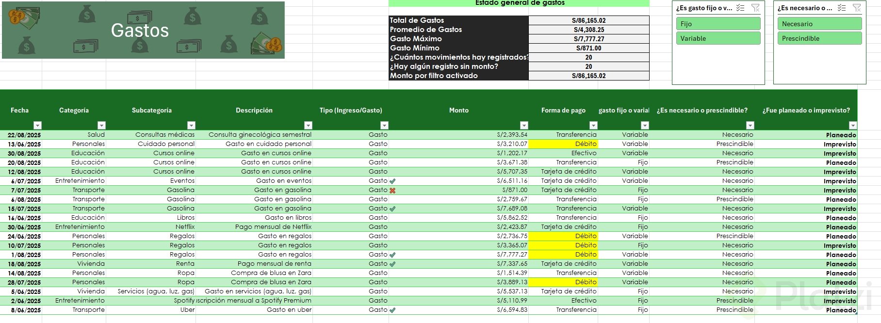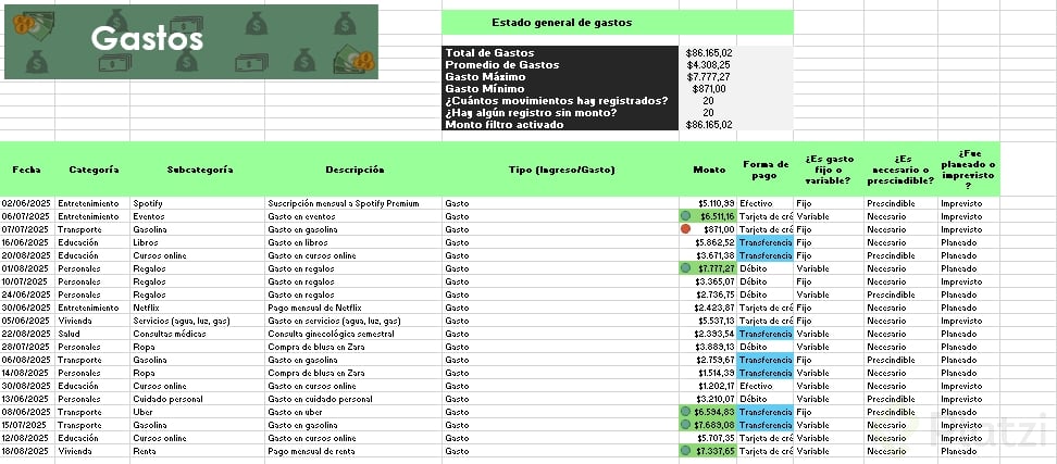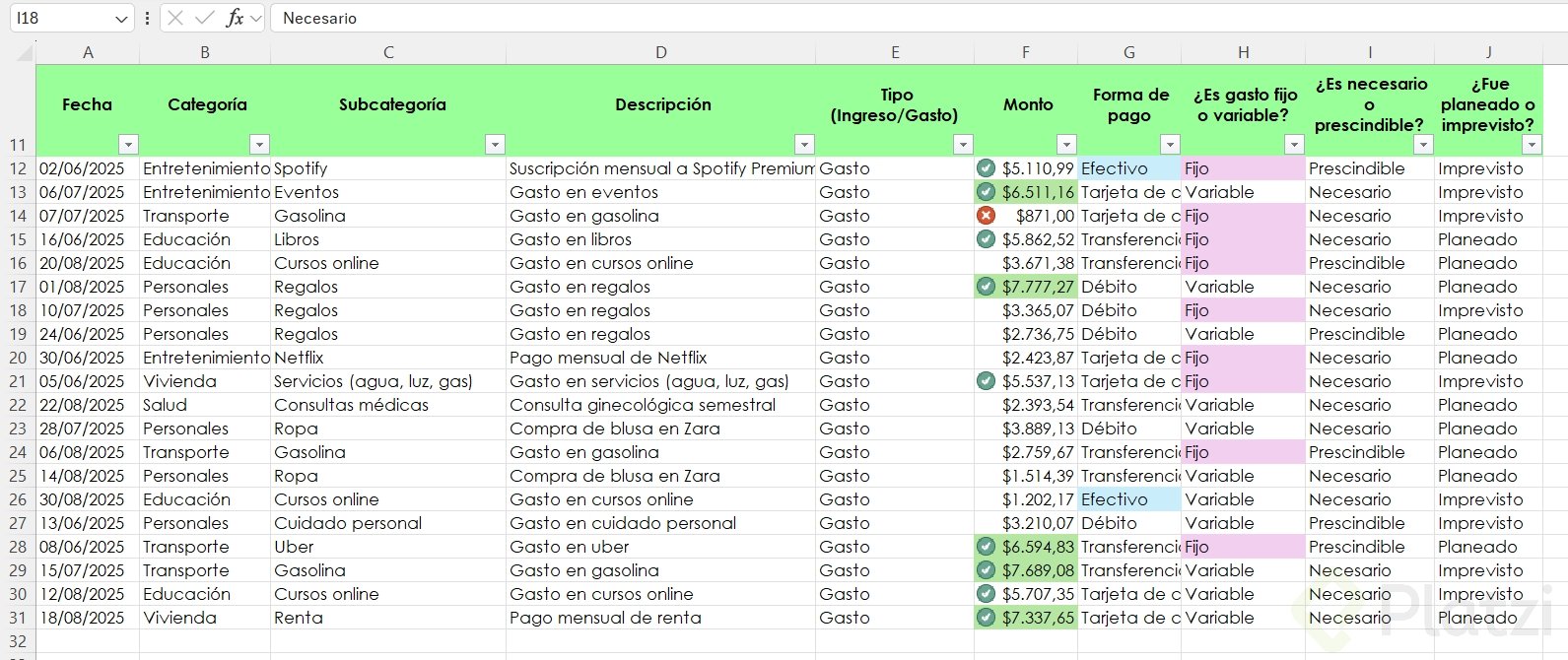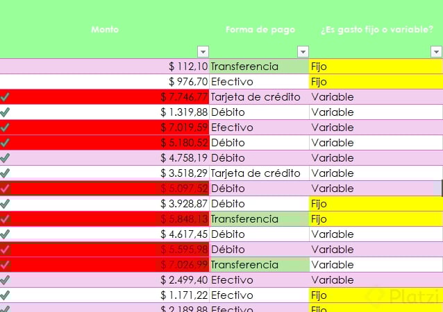 Puedes usar el formato condicional para distinguir, por ejemplo, entre gastos fijos y variables: