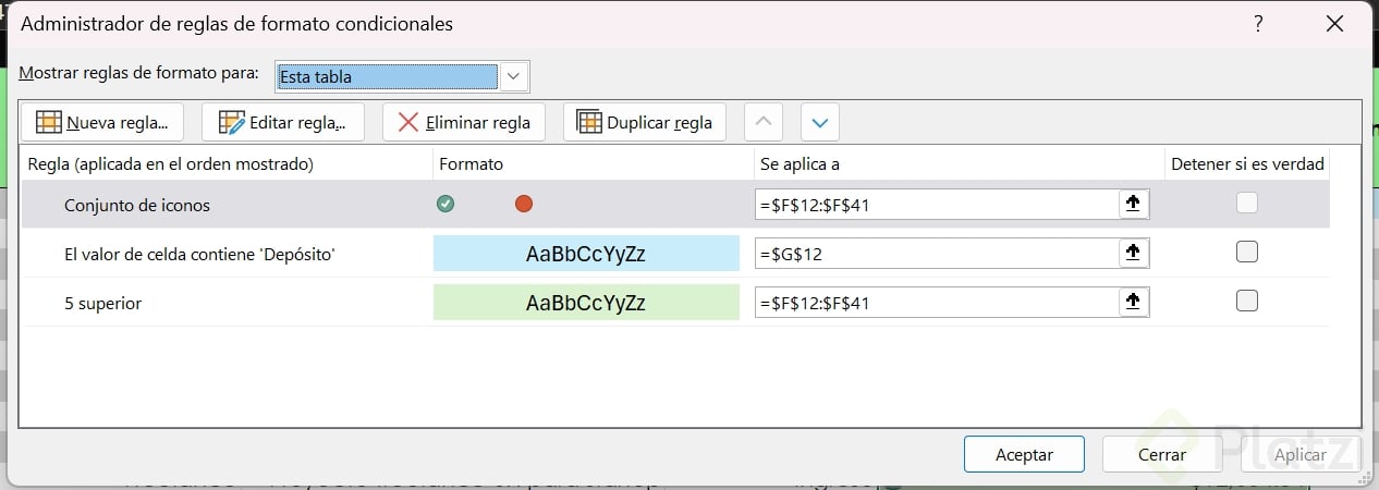 Si necesitas que una celda cambie de color cuando contiene un texto como ‘depósito’:
