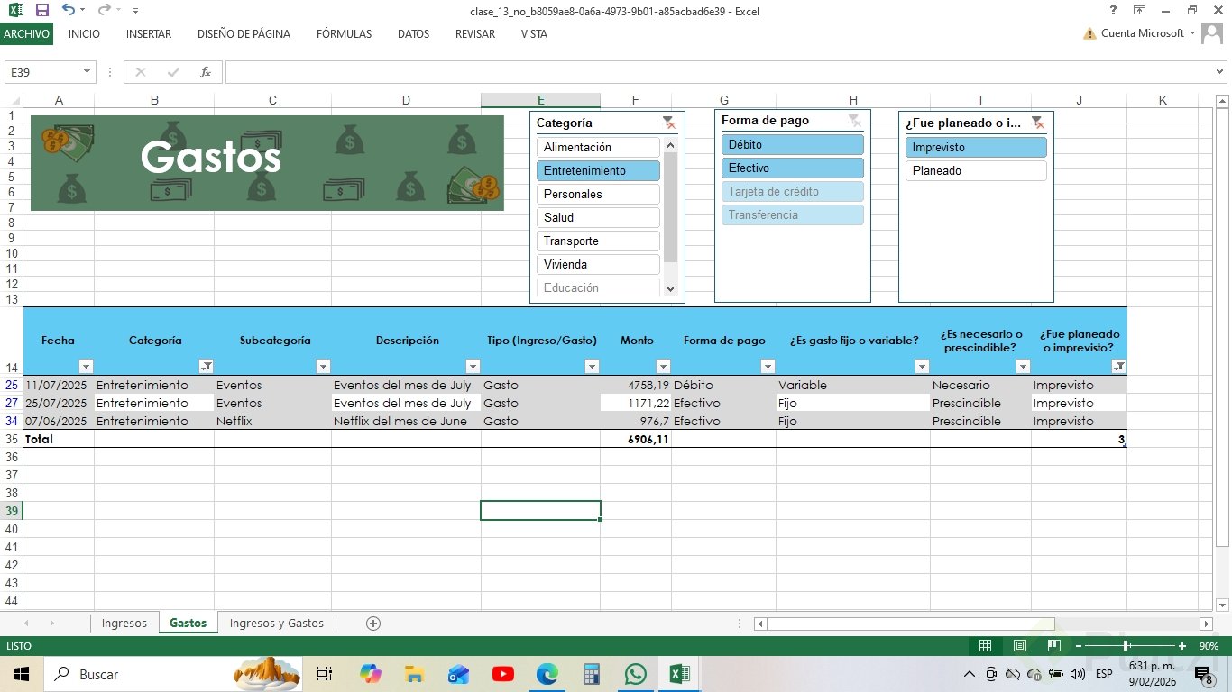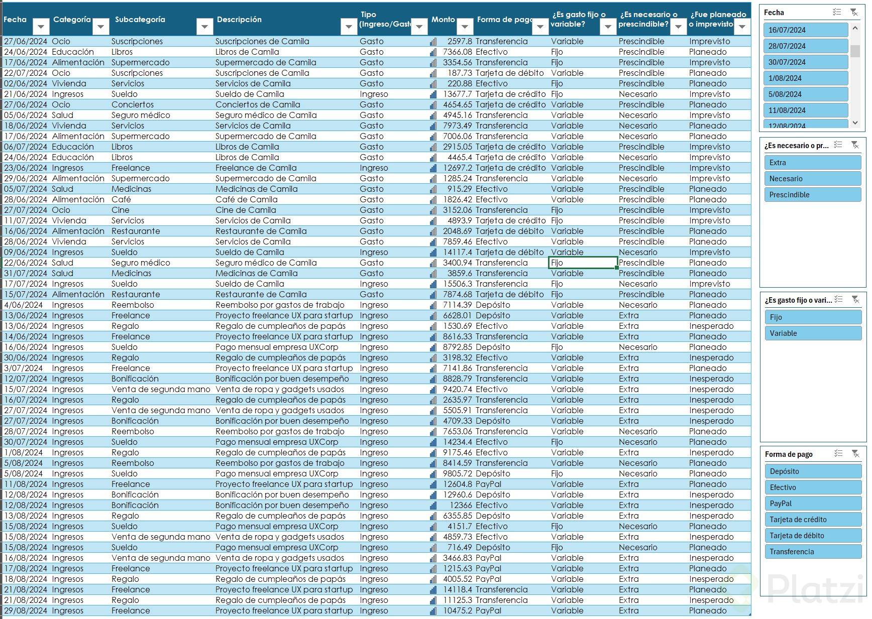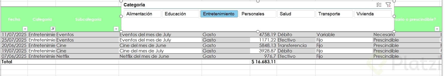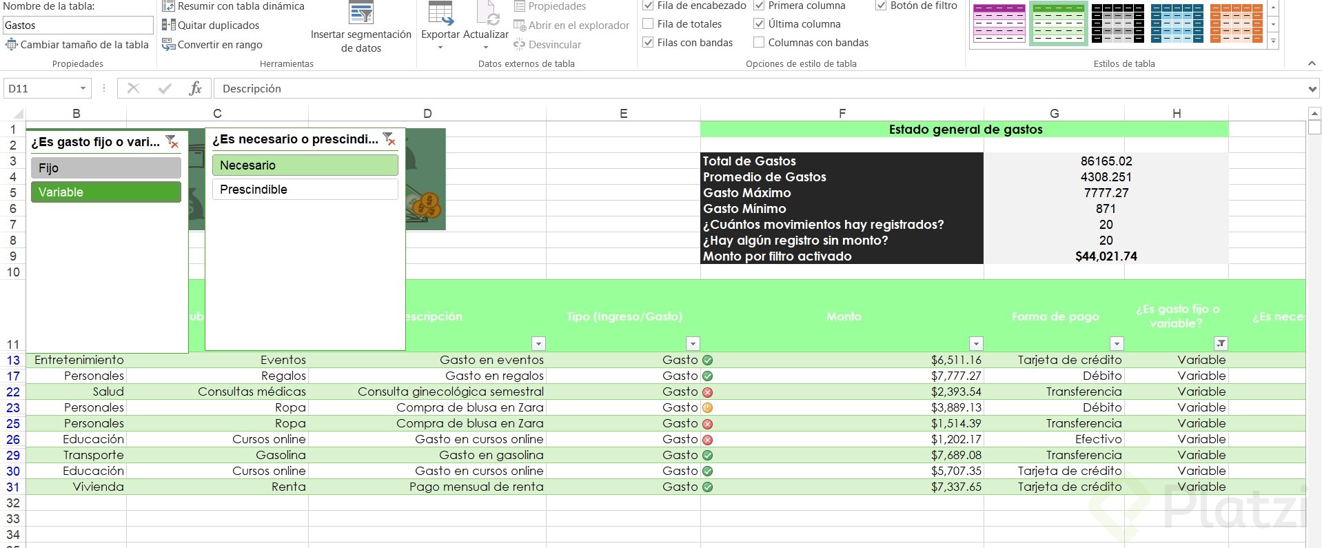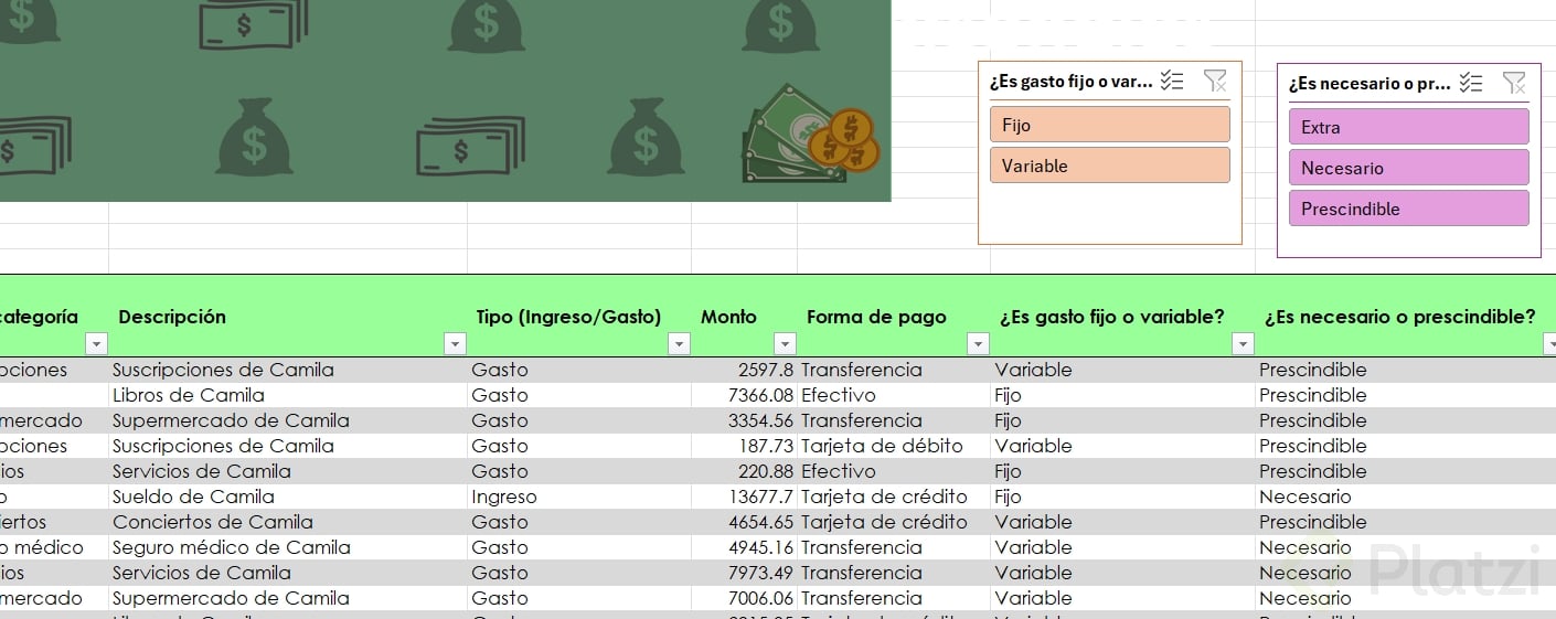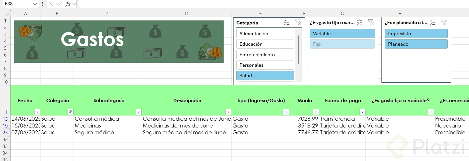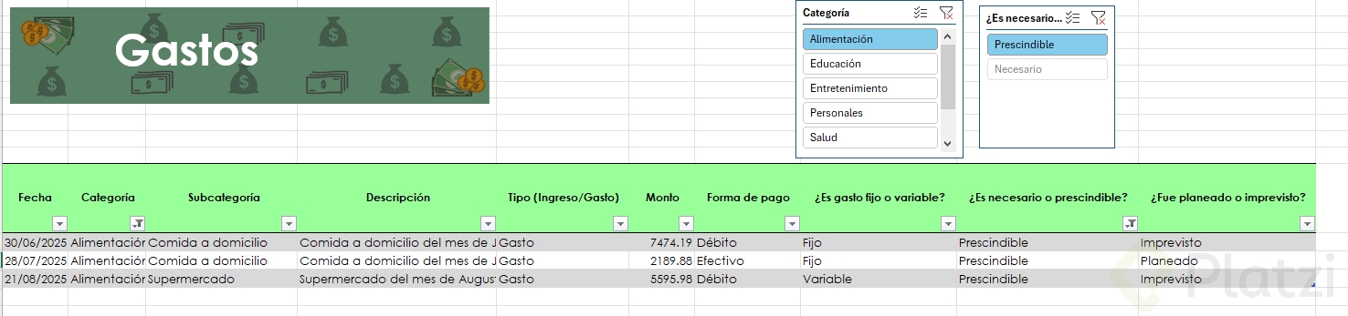 Uno de los beneficios más útiles es la posibilidad de agregar segmentadores de datos. Esta funcionalidad muestra filtros visuales para categorías, permitiendo seleccionar rápida y visualmente distintos atributos (como tipo de gasto o si es necesario/prescindible), optimizando el análisis.