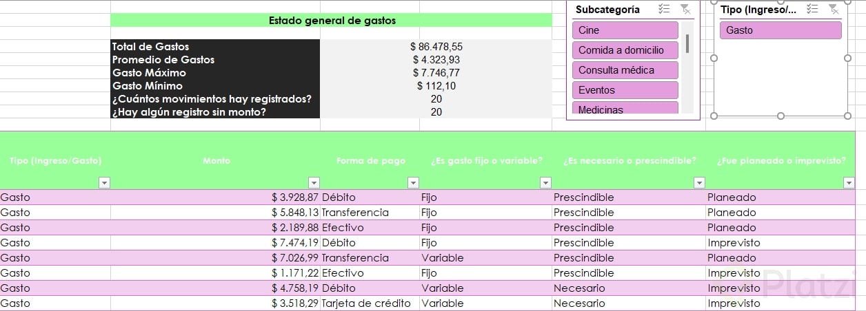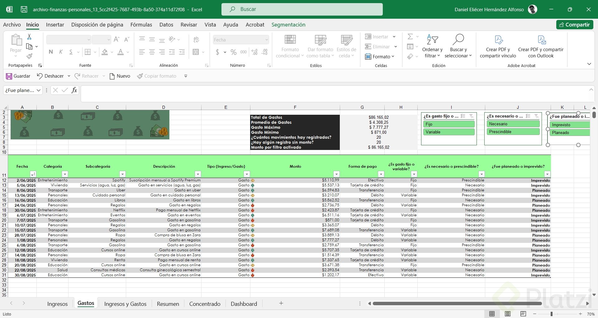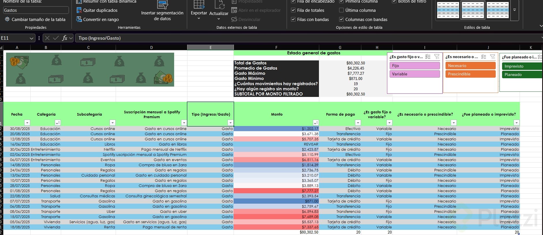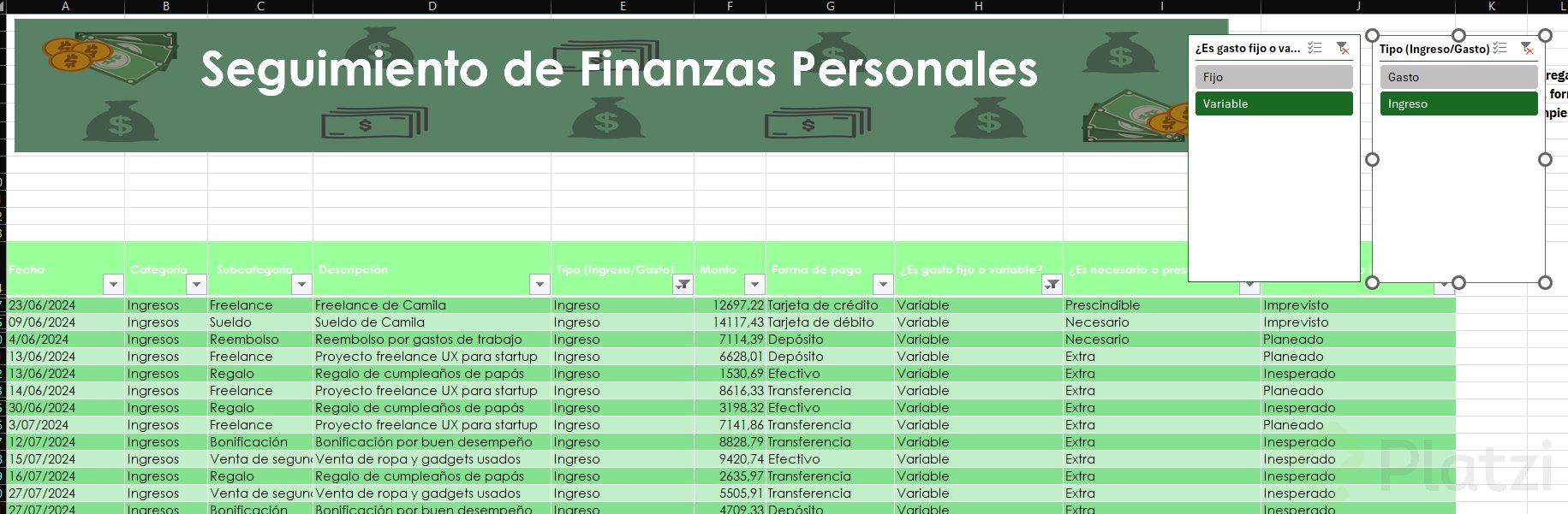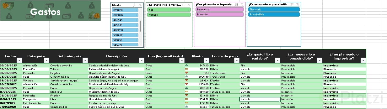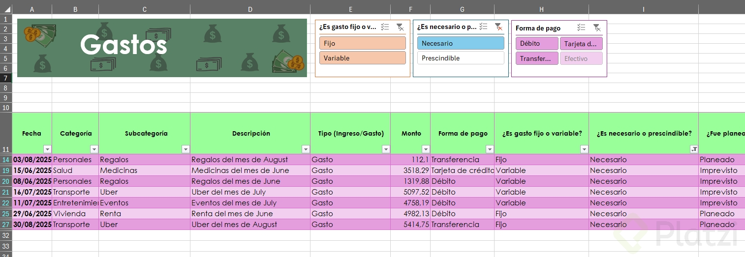 Uno de los beneficios más útiles es la posibilidad de agregar segmentadores de datos. Esta funcionalidad muestra filtros visuales para categorías, permitiendo seleccionar rápida y visualmente distintos atributos (como tipo de gasto o si es necesario/prescindible), optimizando el análisis.