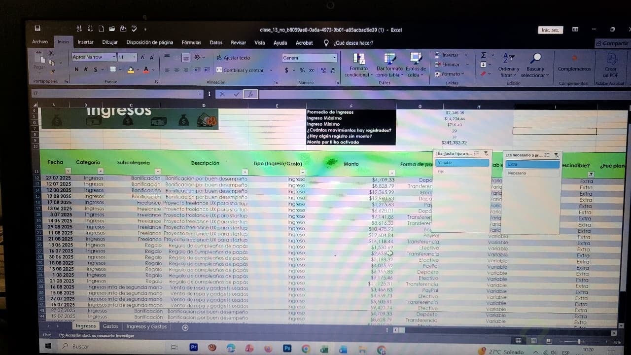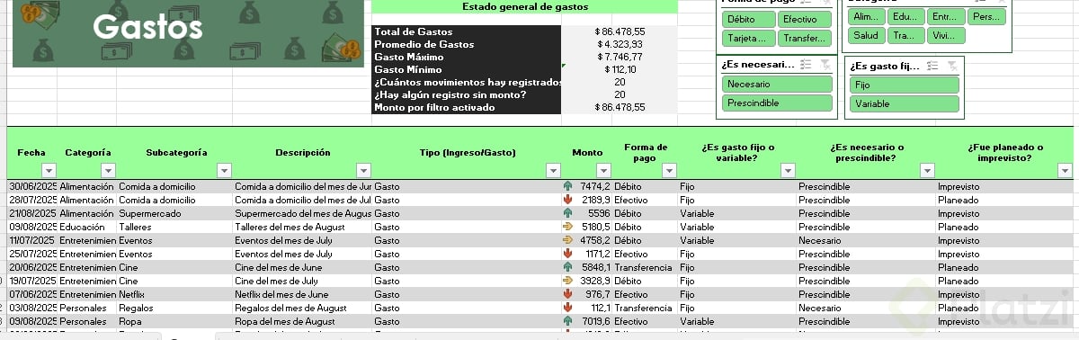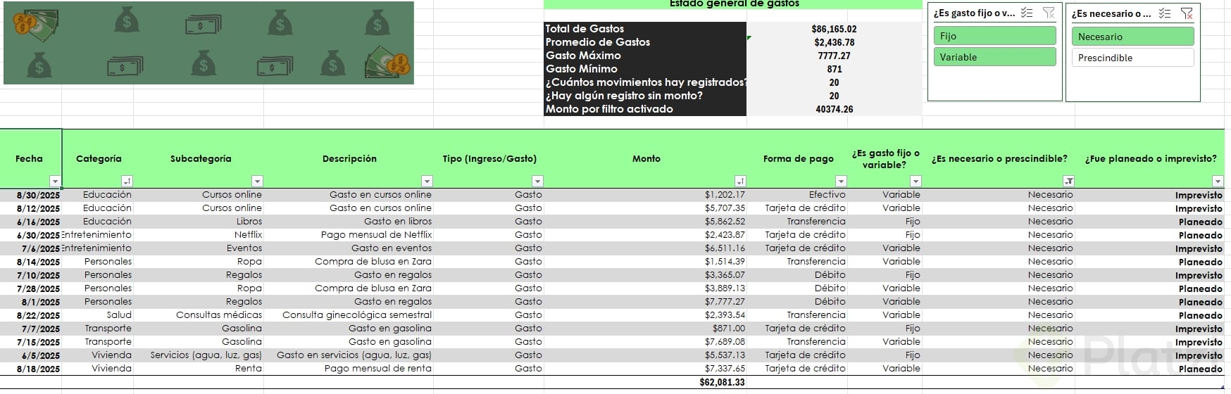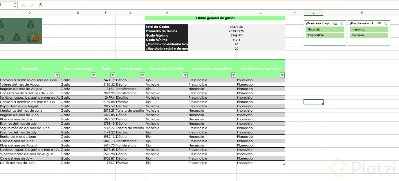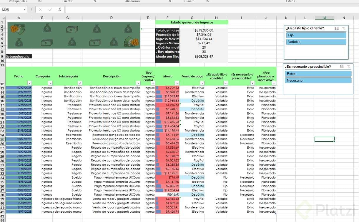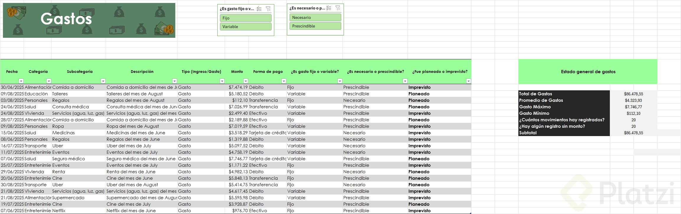 Uno de los beneficios más útiles es la posibilidad de agregar segmentadores de datos. Esta funcionalidad muestra filtros visuales para categorías, permitiendo seleccionar rápida y visualmente distintos atributos (como tipo de gasto o si es necesario/prescindible), optimizando el análisis.