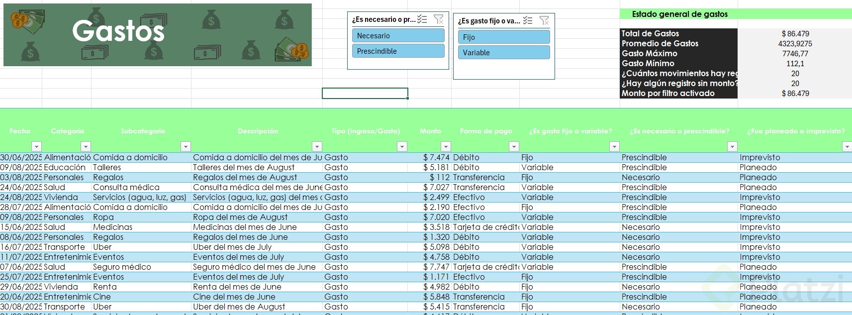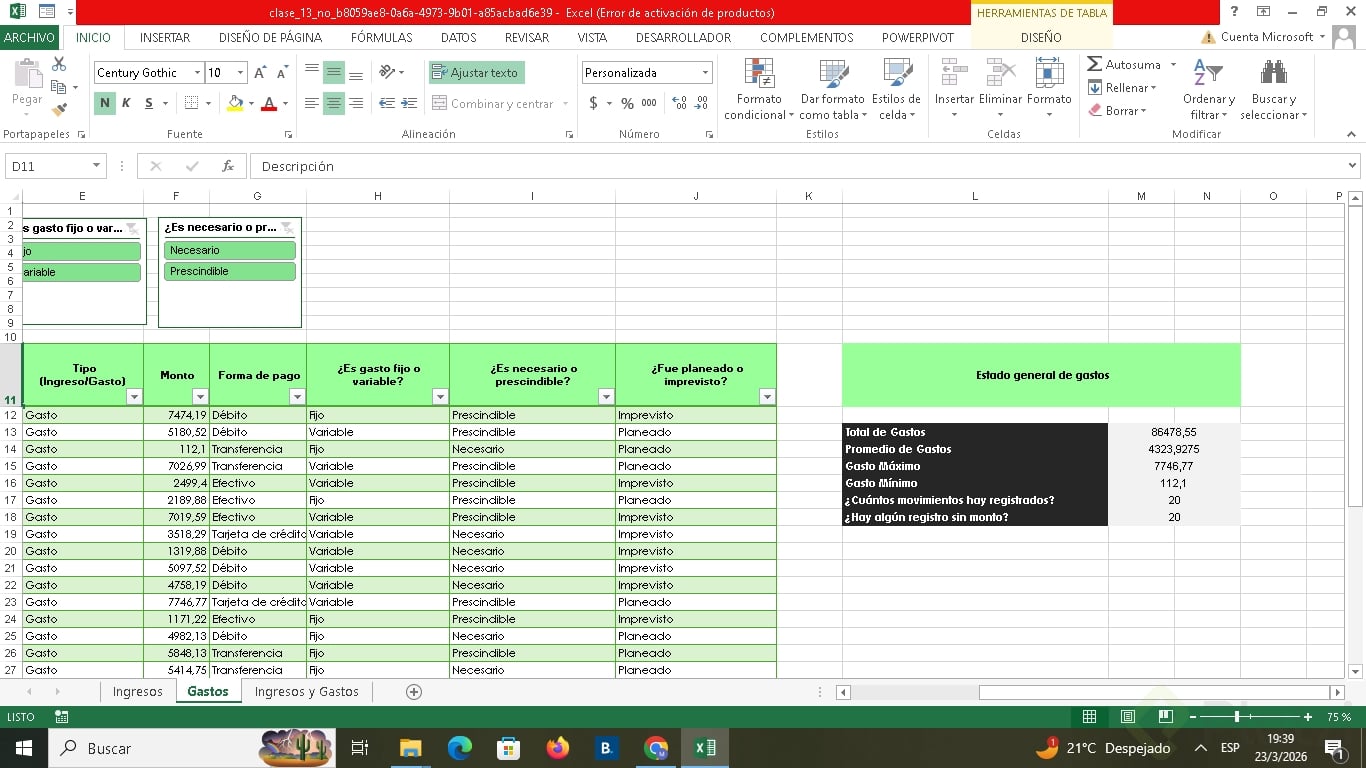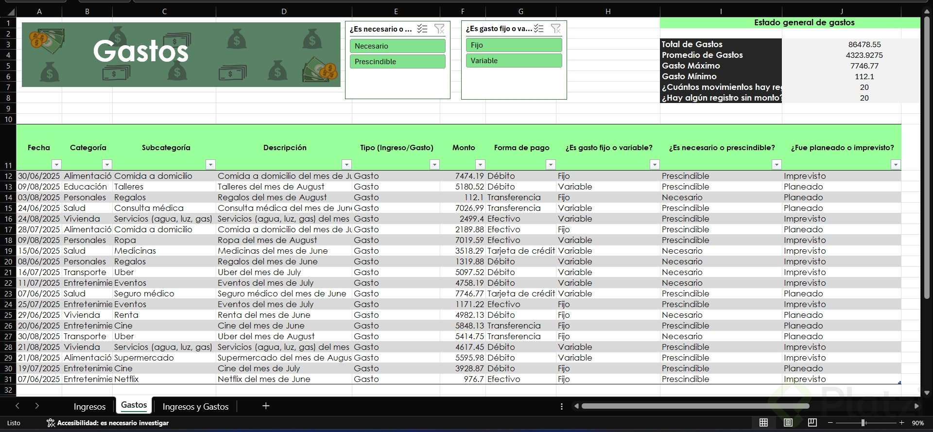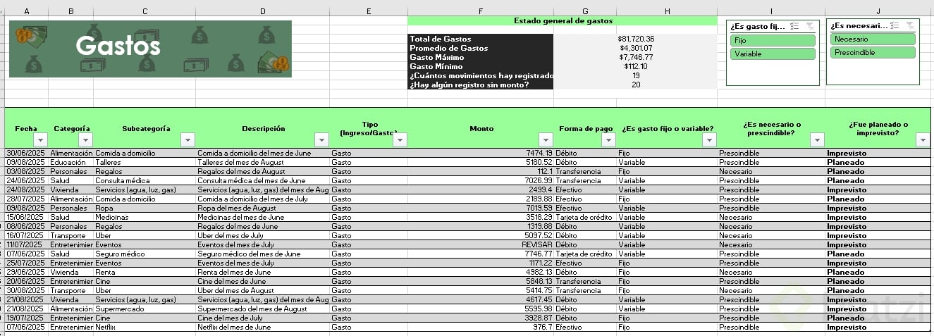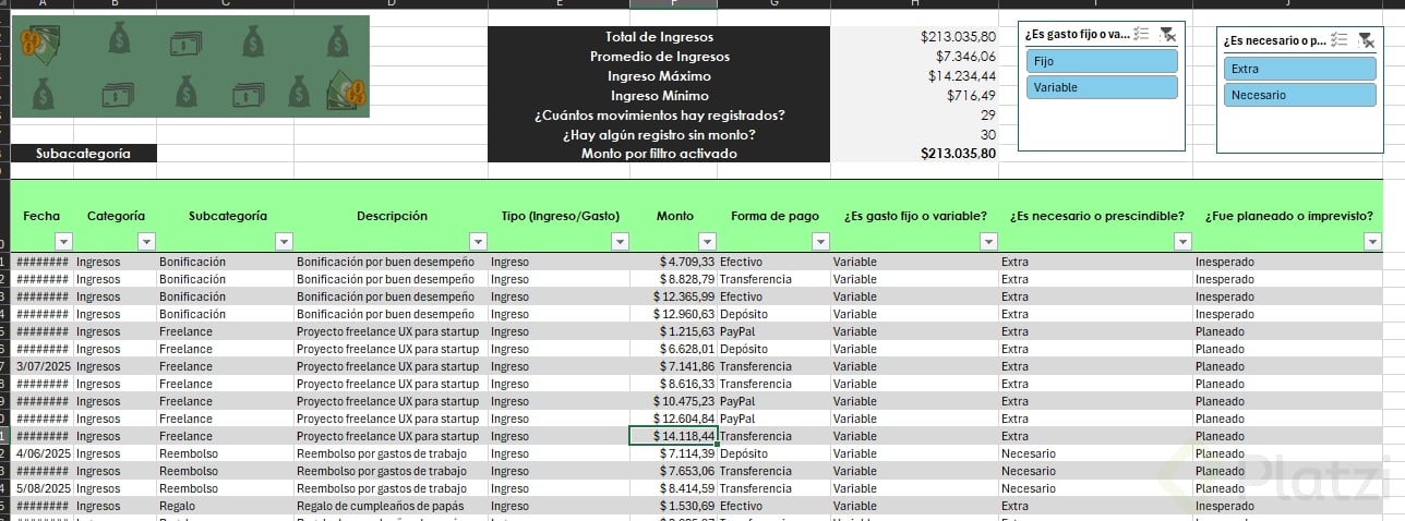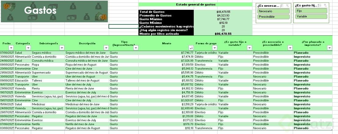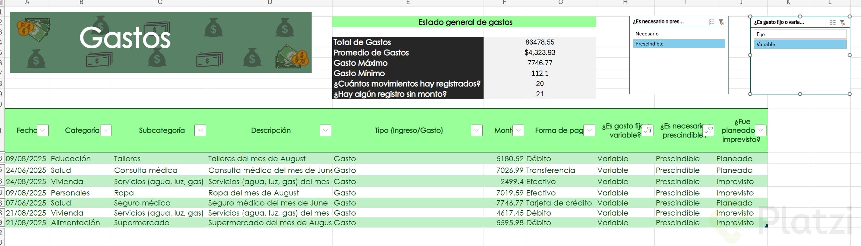 Uno de los beneficios más útiles es la posibilidad de agregar segmentadores de datos. Esta funcionalidad muestra filtros visuales para categorías, permitiendo seleccionar rápida y visualmente distintos atributos (como tipo de gasto o si es necesario/prescindible), optimizando el análisis.