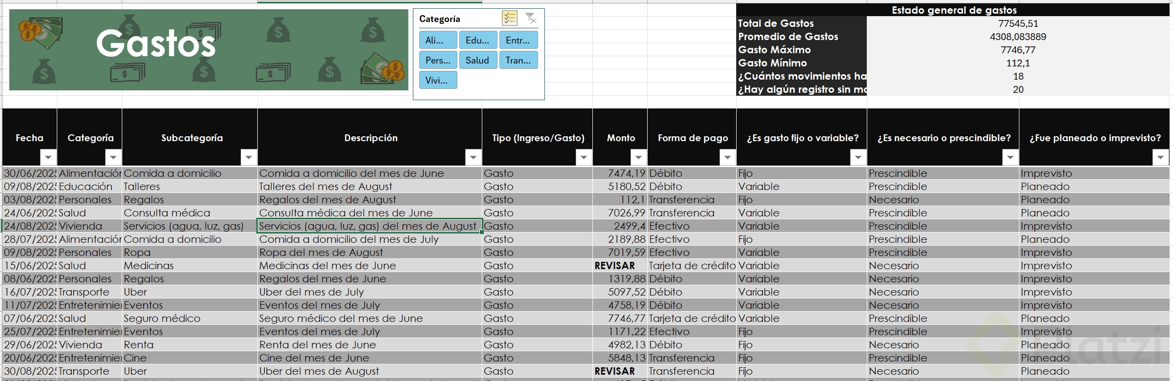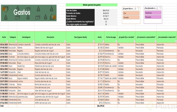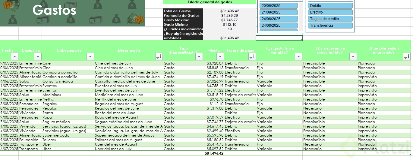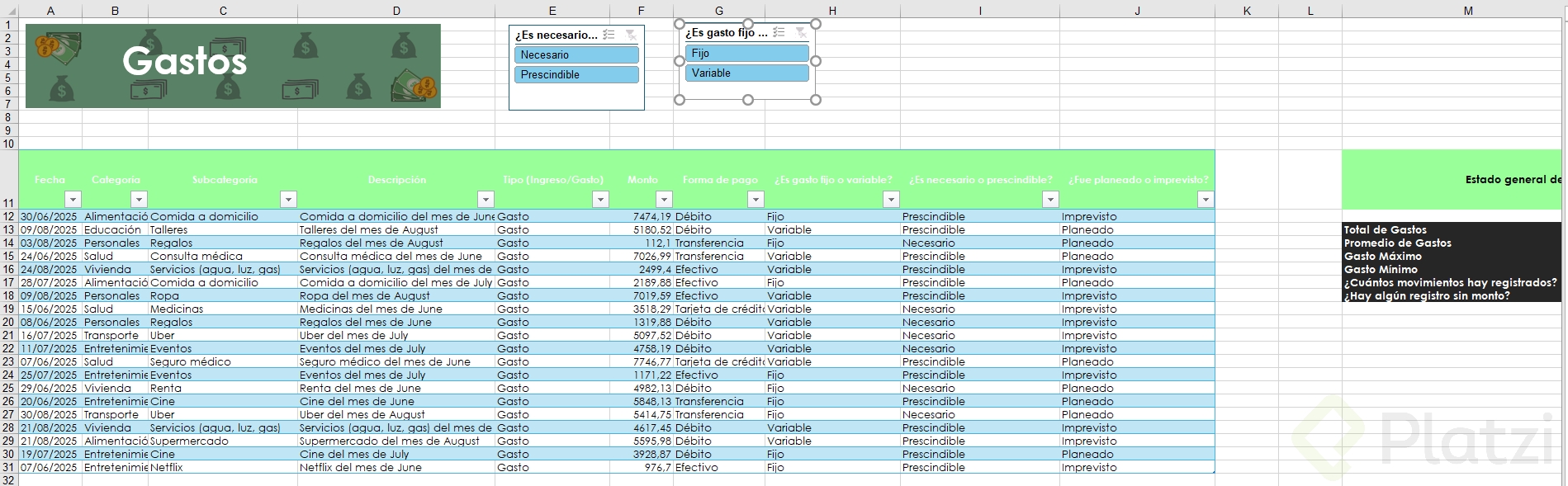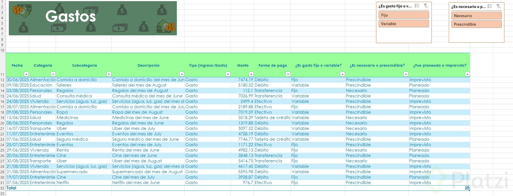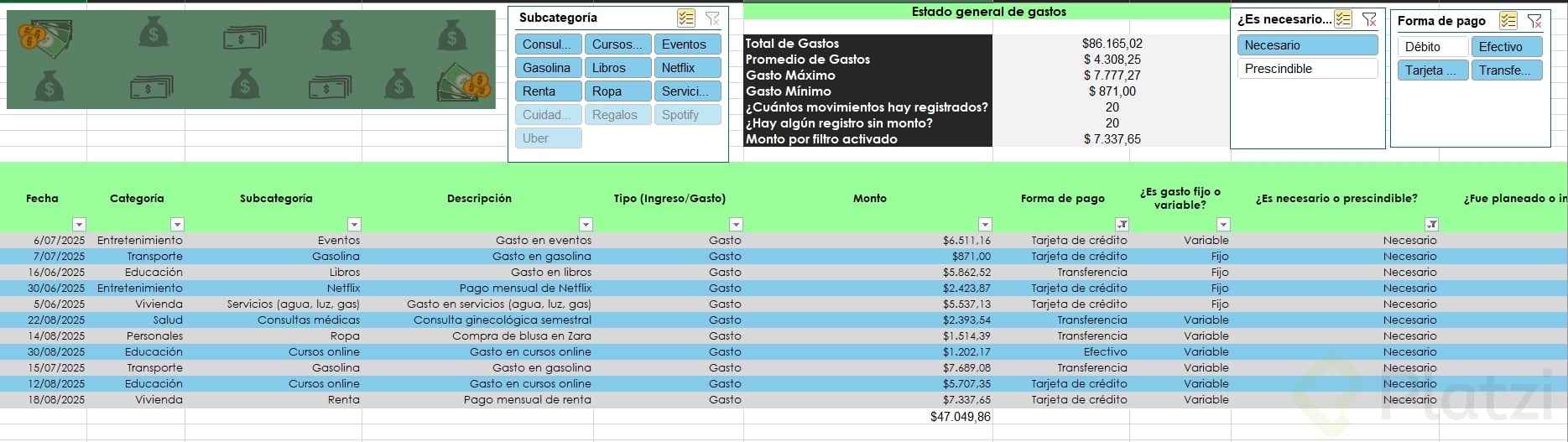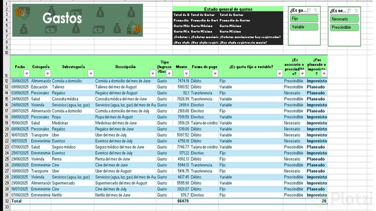 Uno de los beneficios más útiles es la posibilidad de agregar segmentadores de datos. Esta funcionalidad muestra filtros visuales para categorías, permitiendo seleccionar rápida y visualmente distintos atributos (como tipo de gasto o si es necesario/prescindible), optimizando el análisis.