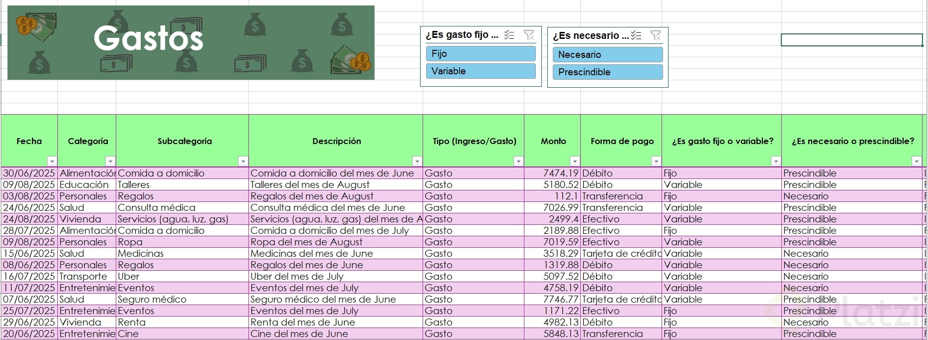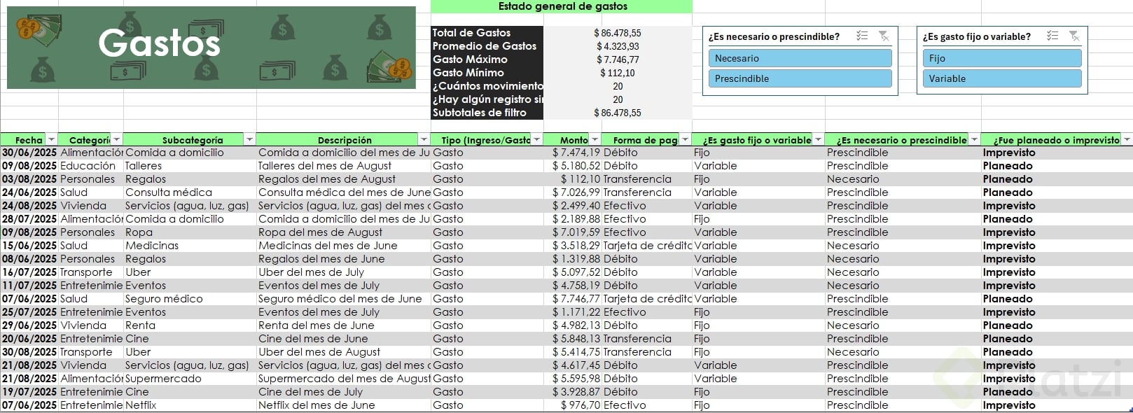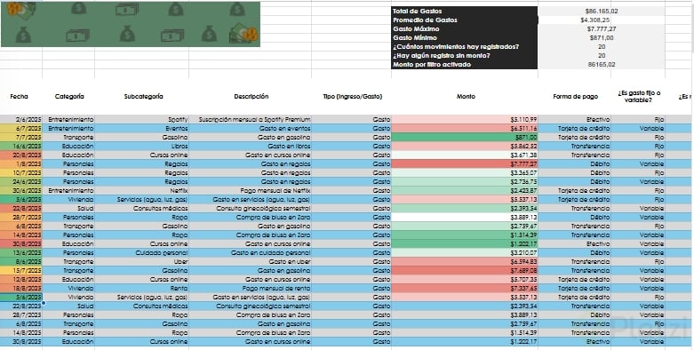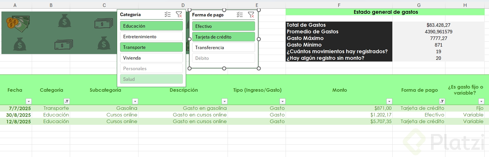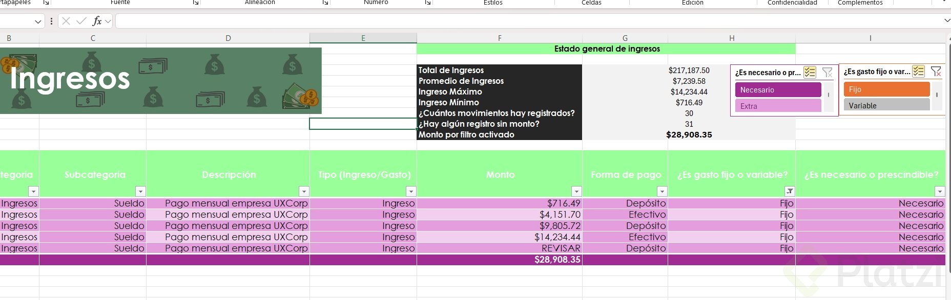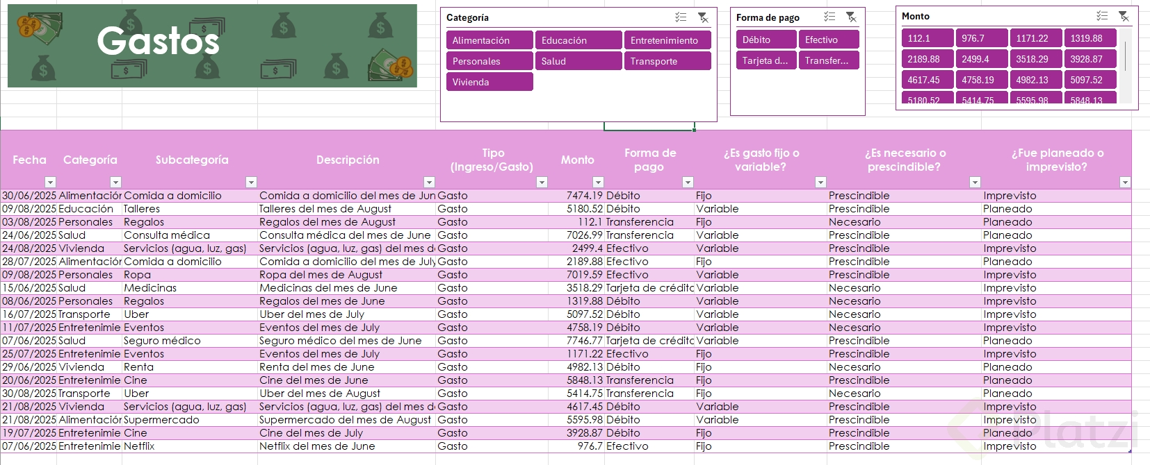 Uno de los beneficios más útiles es la posibilidad de agregar segmentadores de datos. Esta funcionalidad muestra filtros visuales para categorías, permitiendo seleccionar rápida y visualmente distintos atributos (como tipo de gasto o si es necesario/prescindible), optimizando el análisis.