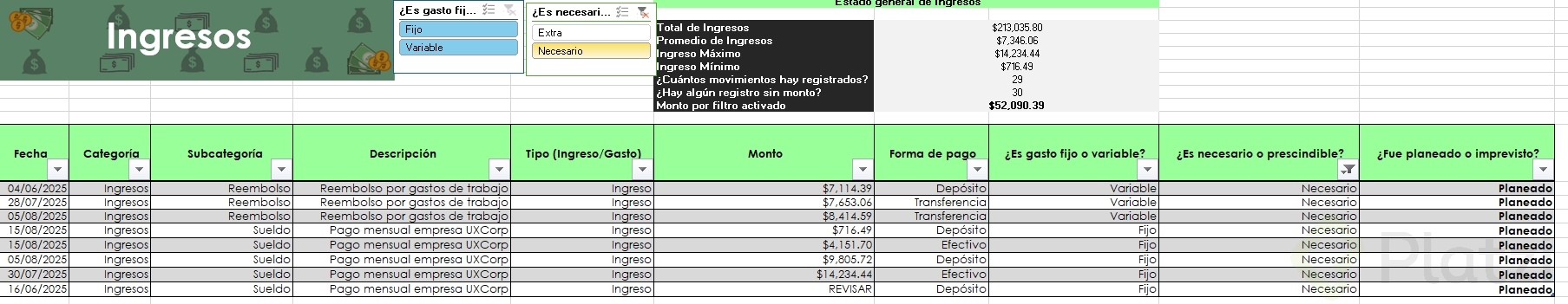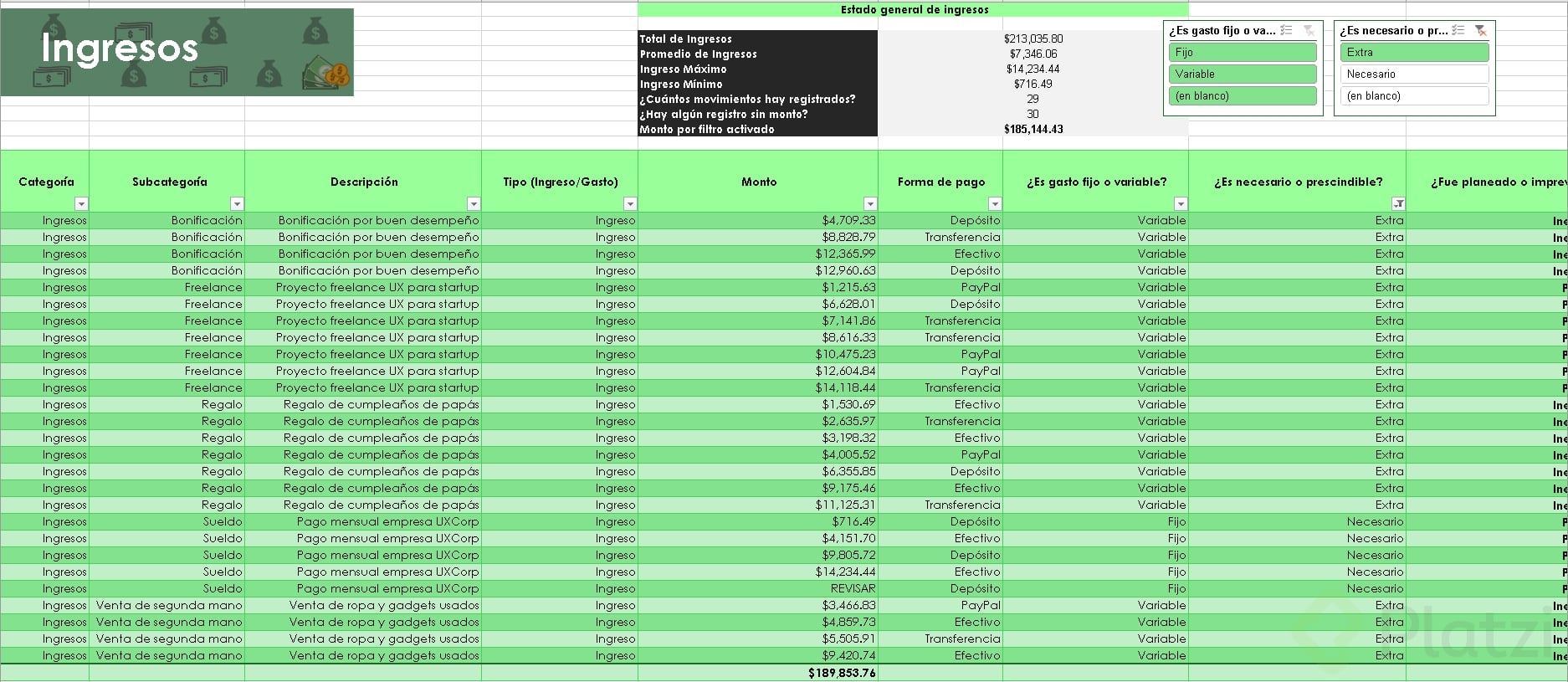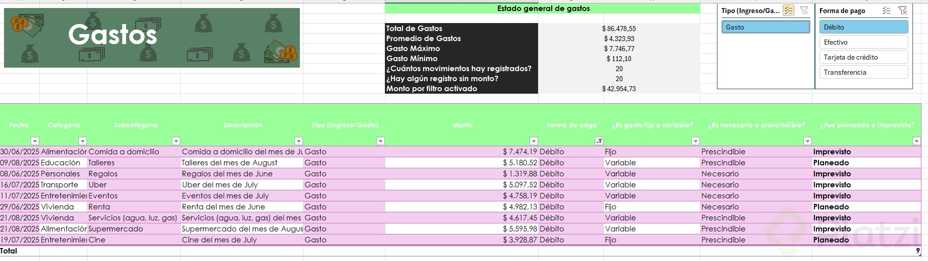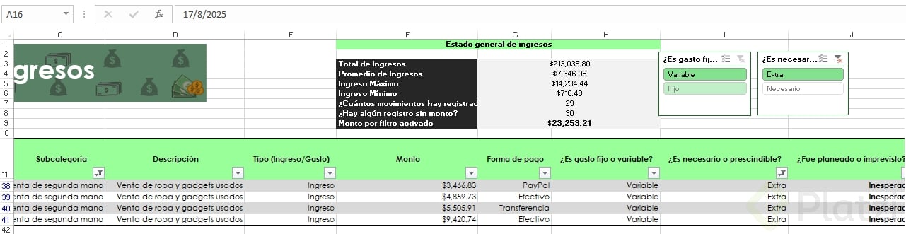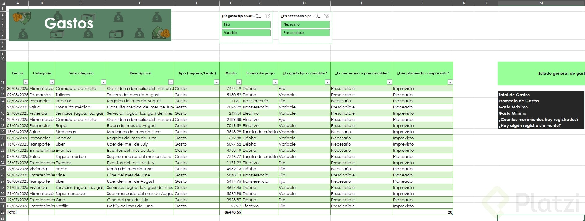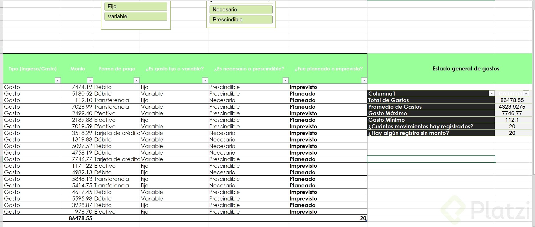 Uno de los beneficios más útiles es la posibilidad de agregar segmentadores de datos. Esta funcionalidad muestra filtros visuales para categorías, permitiendo seleccionar rápida y visualmente distintos atributos (como tipo de gasto o si es necesario/prescindible), optimizando el análisis.