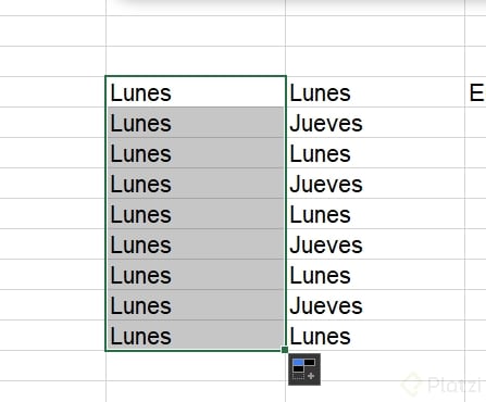 Existen formas prácticas para seleccionar y llenar datos: - Para seleccionar un rango completo, usa Control + Shift + flecha hacia abajo; esto selecciona hasta la última celda con datos. - El autorrelleno permite ahorrar mucho tiempo: escribe un dato inicial (como "lunes"), selecciónalo y arrastra el cuadro verde en la esquina de la celda hacia abajo. Excel completa la secuencia por ti (lunes, martes, miércoles, etc.). - Puedes definir patrones específicos: si ingresas "enero" y "abril" y arrastras, Excel identifica que quieres avanzar por trimestres y sigue la secuencia (enero, abril, julio...). - Para repetir el mismo dato en vez de una secuencia, selecciona la opción de "copiar celdas" en el autorrelleno.