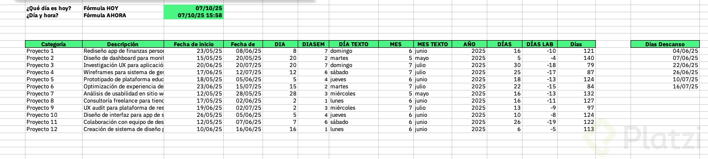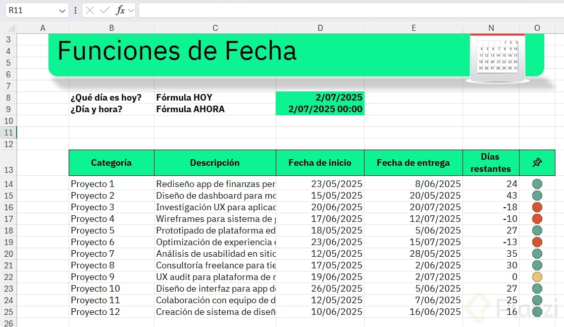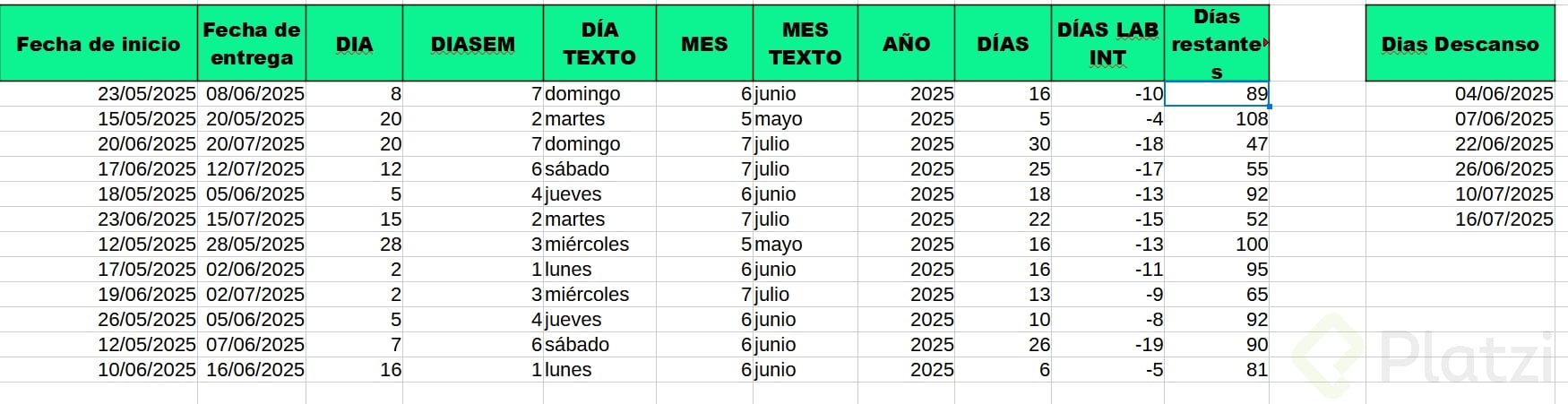- Calcula la diferencia entre la fecha actual y la entrega para saber rápido el avance de tus proyectos.