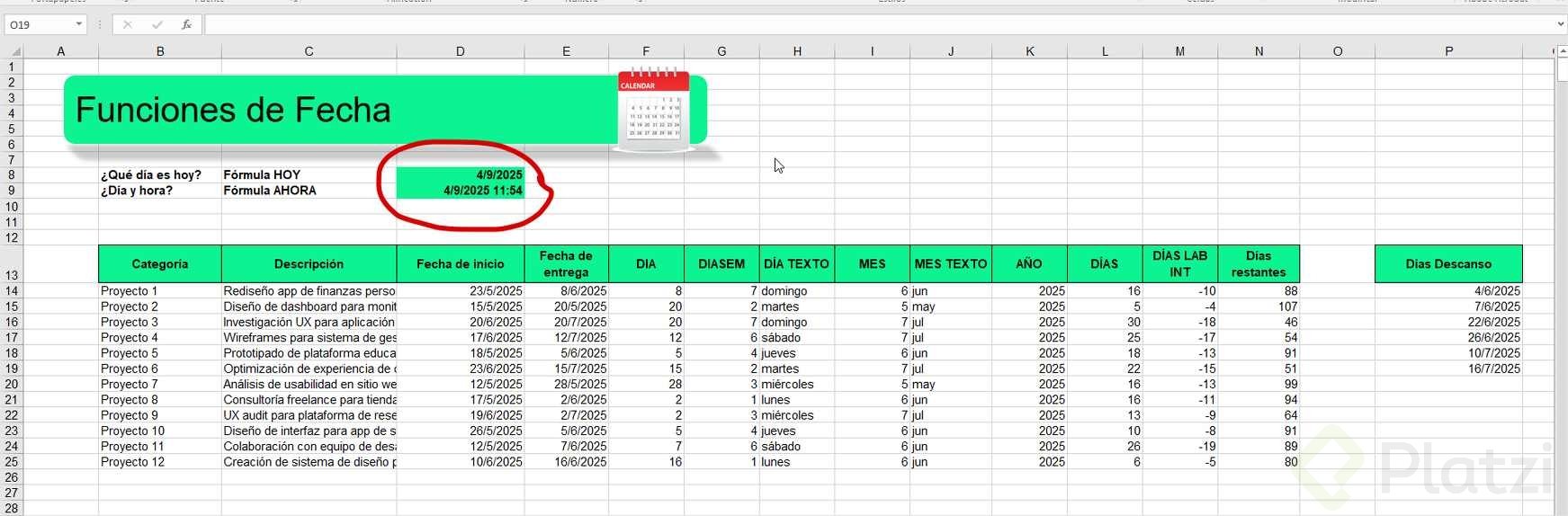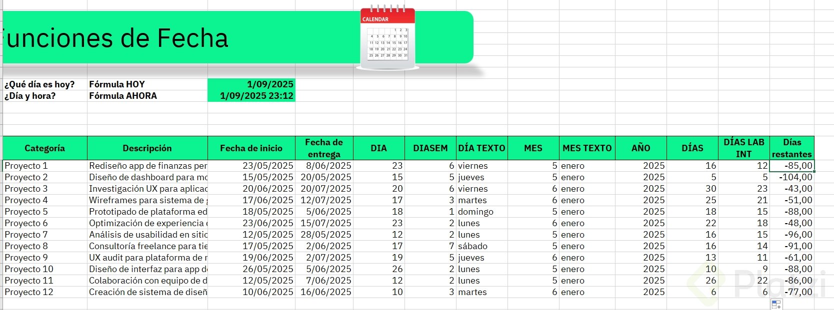 Utilizar la función HOY te muestra la fecha actual con solo escribir =HOY(). Esto facilita comparar plazos, ya que puedes restar la fecha de entrega de un proyecto con la fecha actual para saber cuántos días faltan o han pasado.