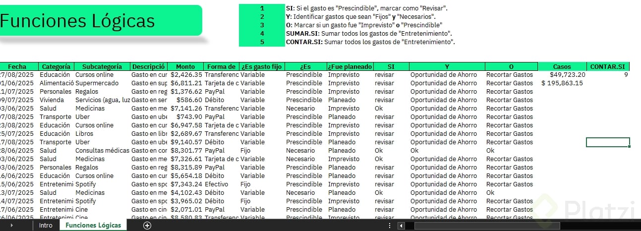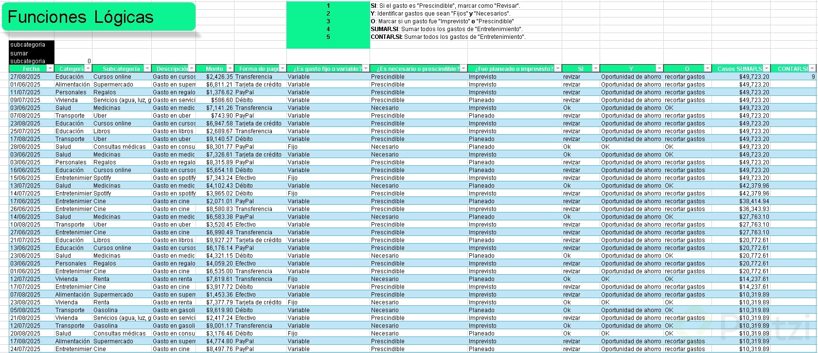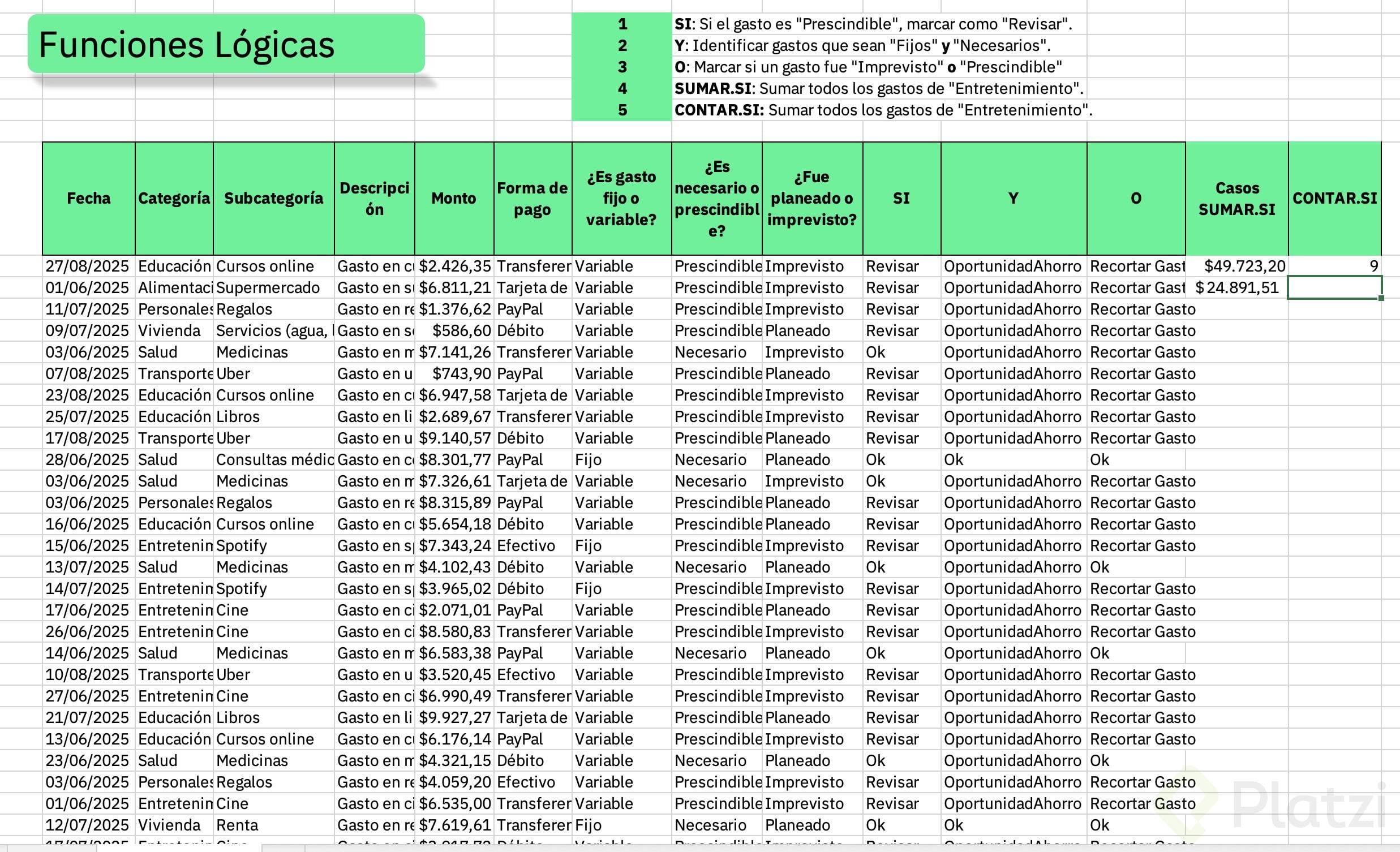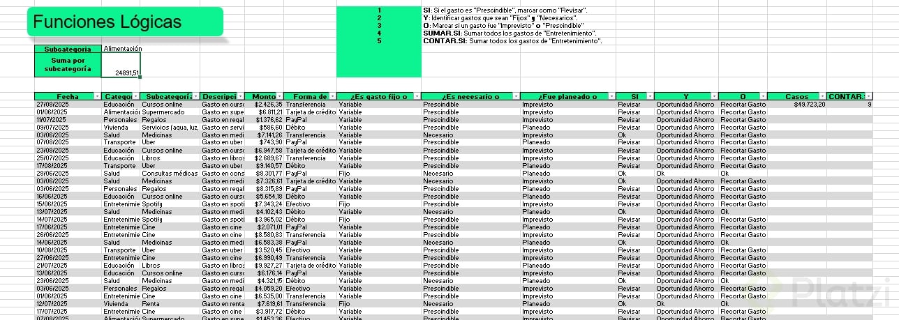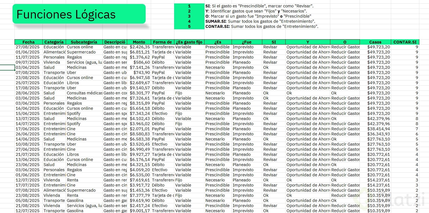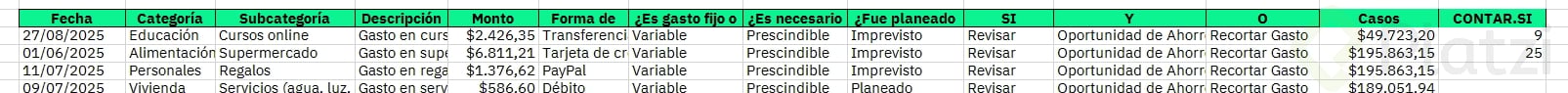 Las funciones lógicas como SI, Y y O facilitan detectar patrones de consumo y oportunidades de ahorro. Por ejemplo, Camila puede marcar automáticamente gastos como “prescindibles” o “no planeados” para tener señales claras de lo que puede eliminar.