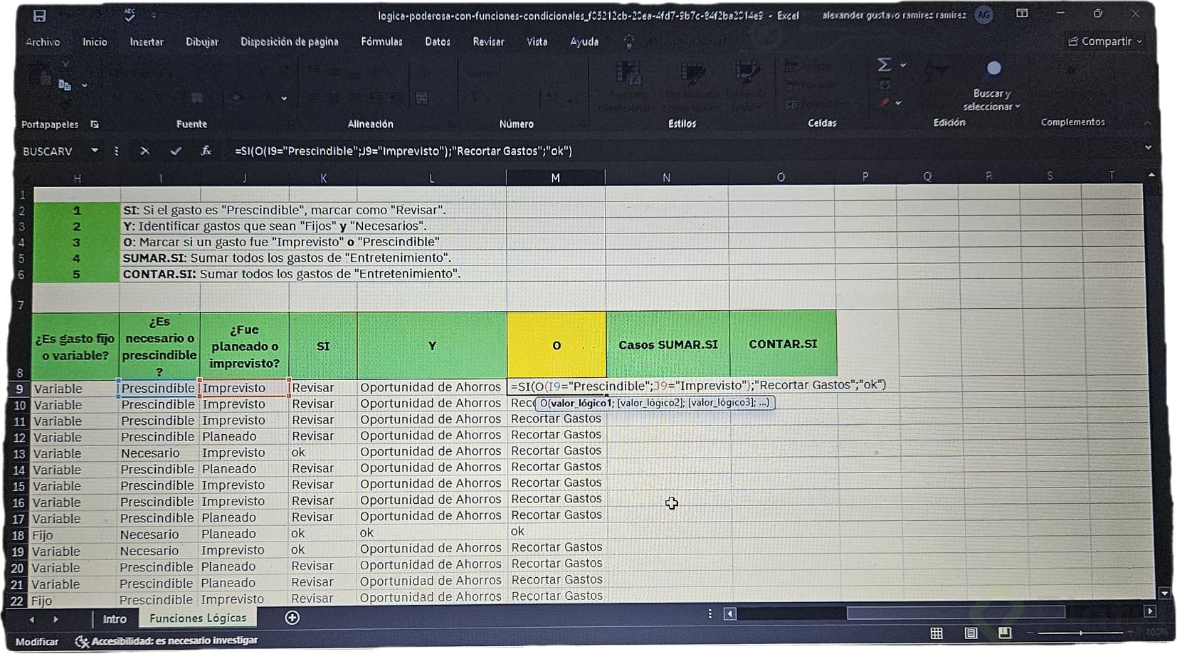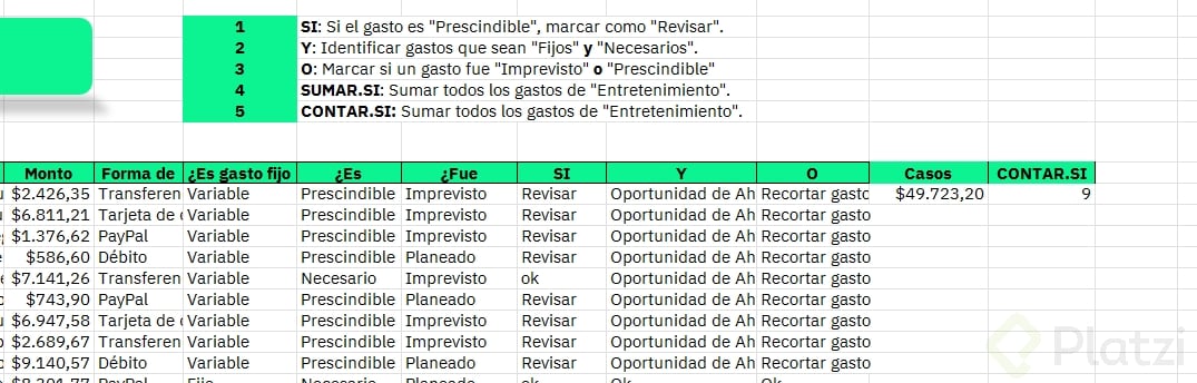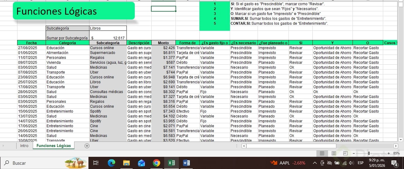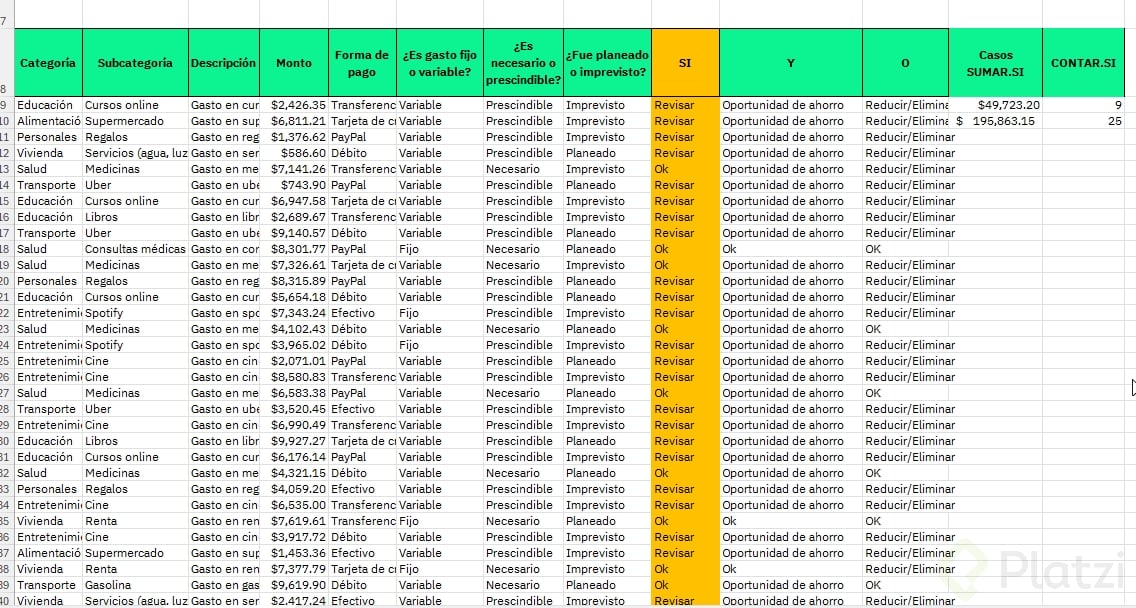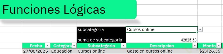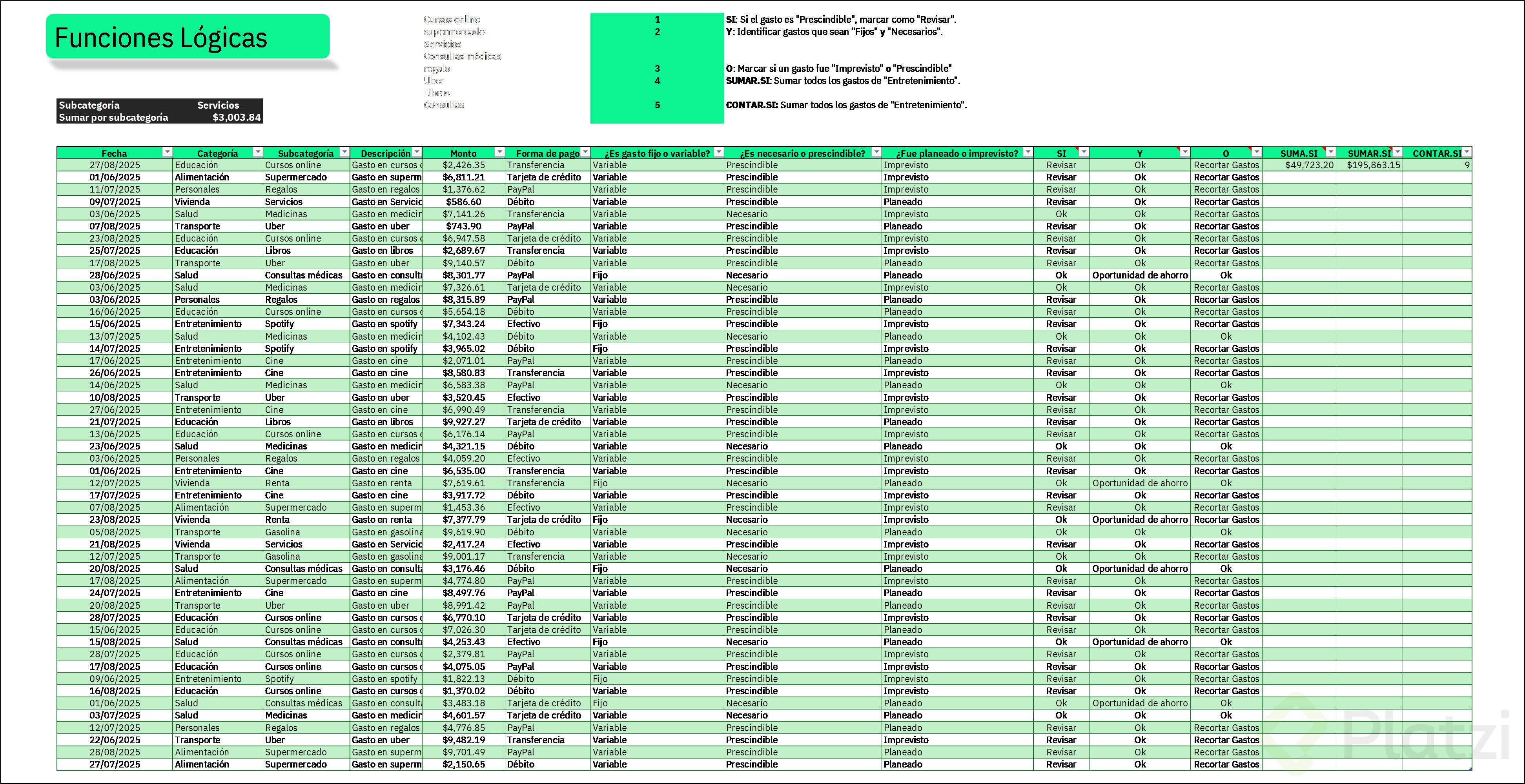 Las funciones lógicas como SI, Y y O facilitan detectar patrones de consumo y oportunidades de ahorro. Por ejemplo, Camila puede marcar automáticamente gastos como “prescindibles” o “no planeados” para tener señales claras de lo que puede eliminar.