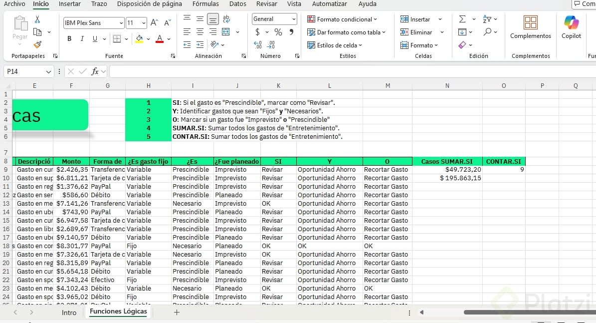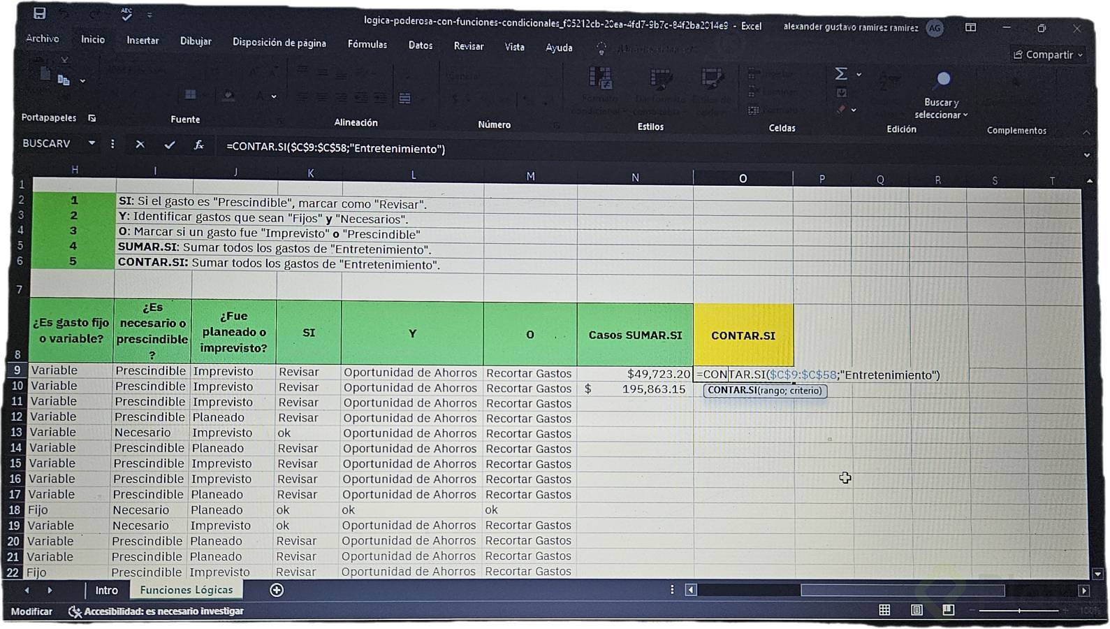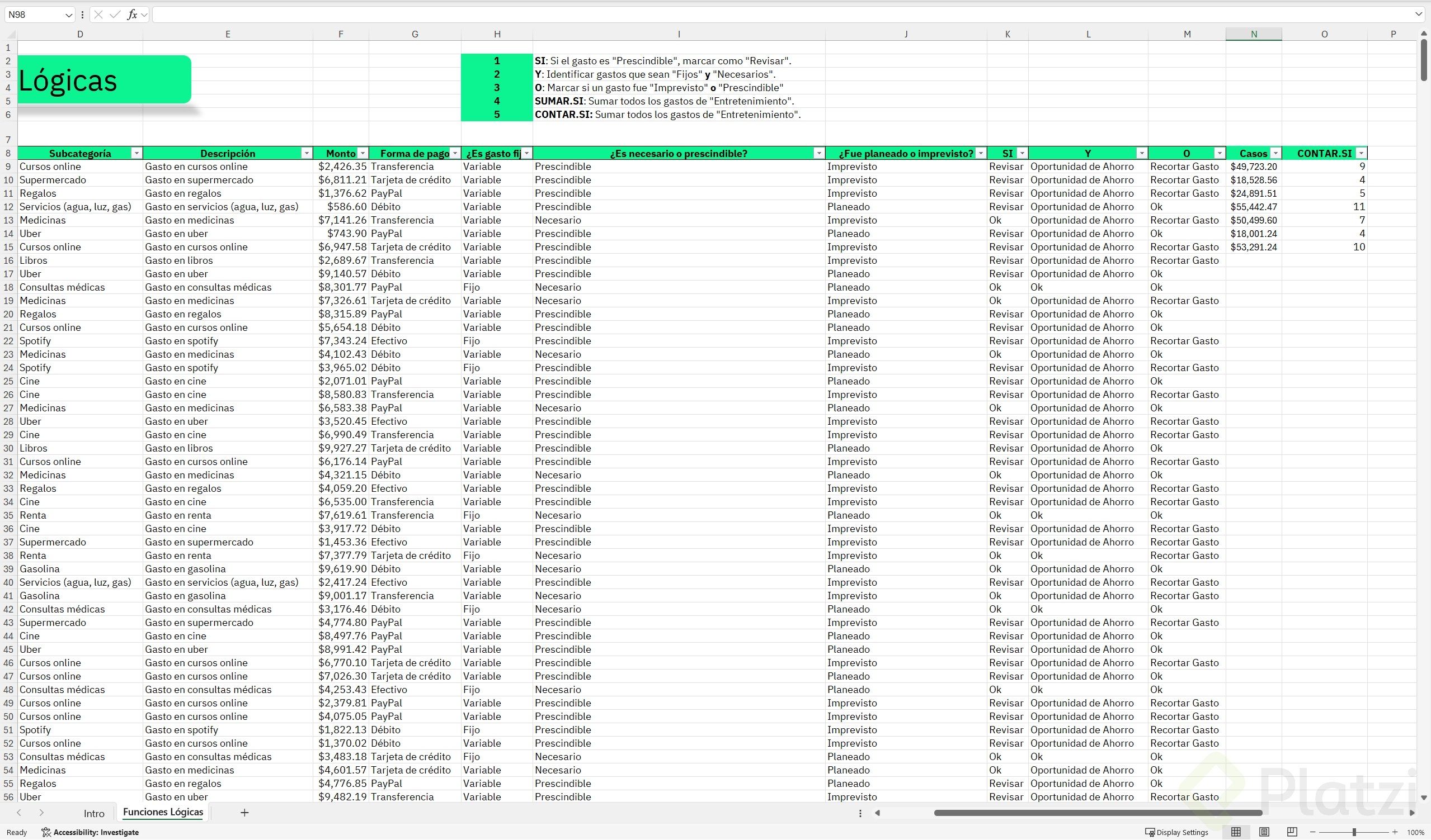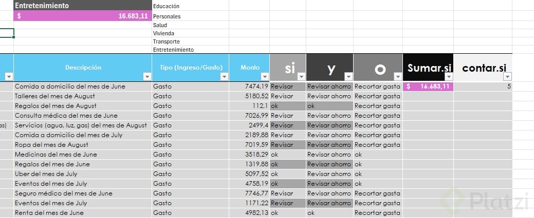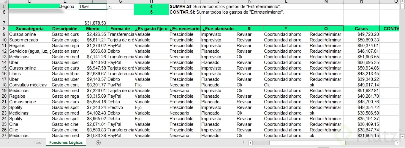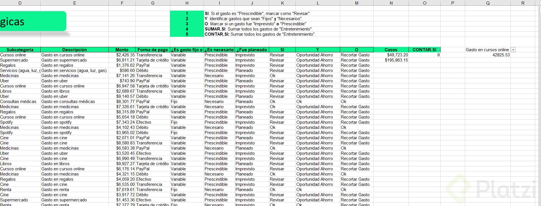 Las funciones lógicas como SI, Y y O facilitan detectar patrones de consumo y oportunidades de ahorro. Por ejemplo, Camila puede marcar automáticamente gastos como “prescindibles” o “no planeados” para tener señales claras de lo que puede eliminar.