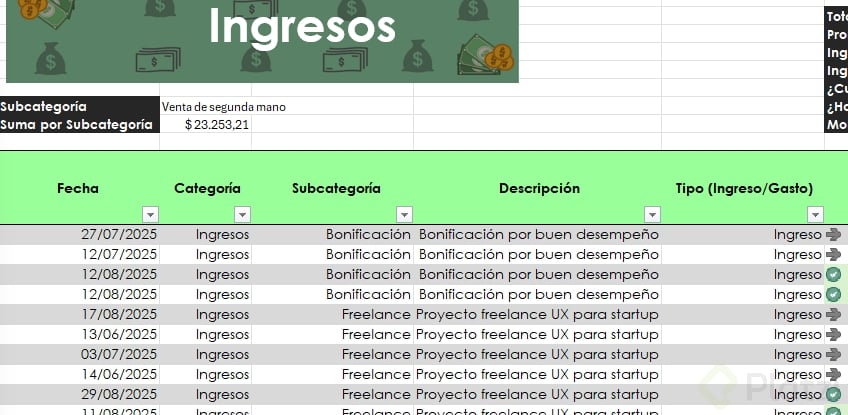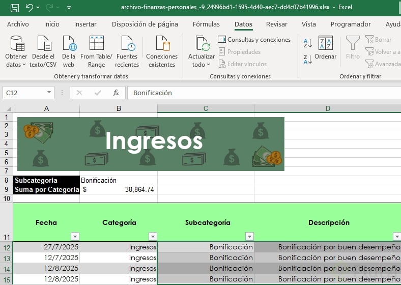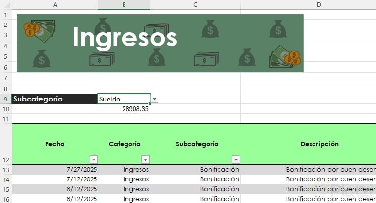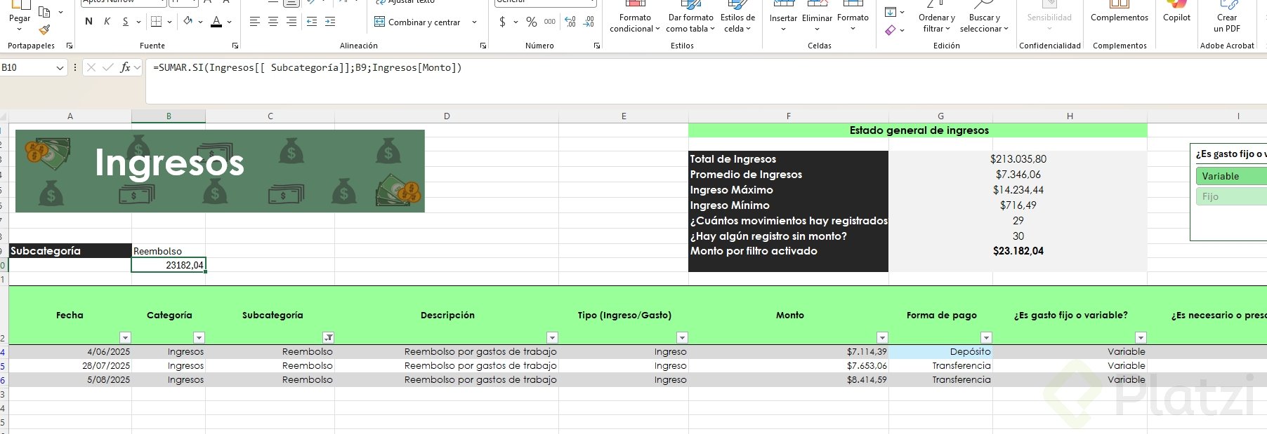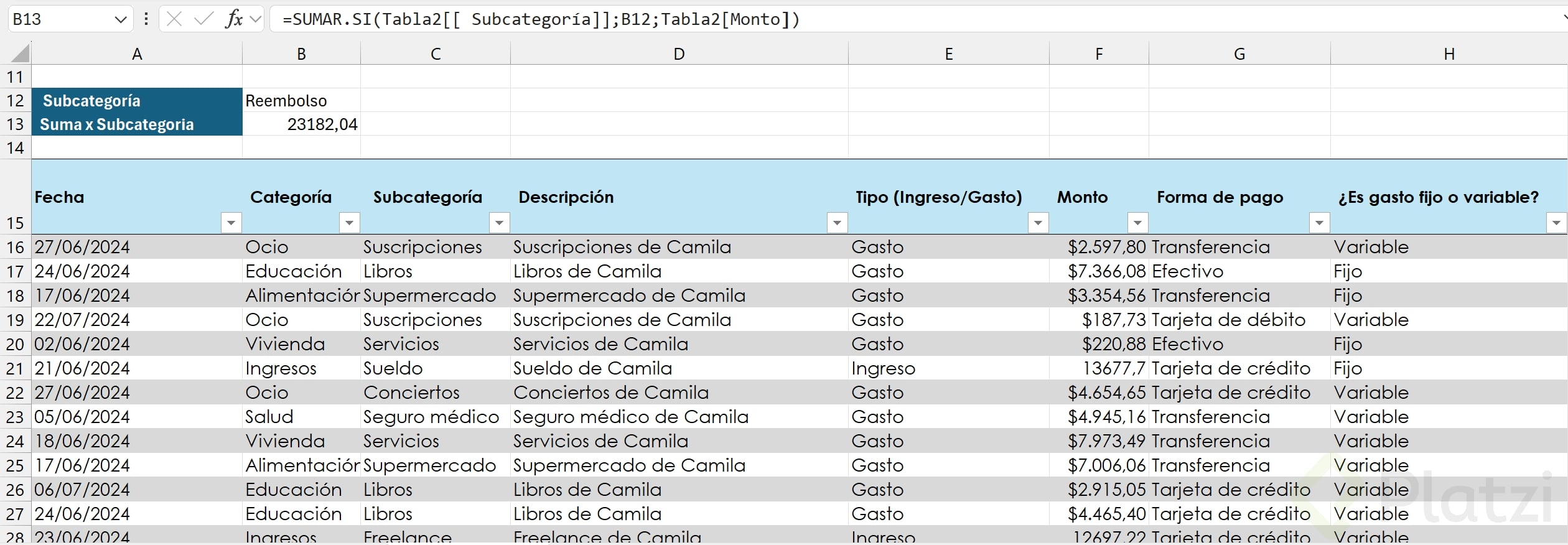 Excel ofrece funciones específicas para sumar y contar movimientos según criterios personalizados. Así, Camila puede cuantificar en qué rubros está gastando más y cuántas transacciones realiza en cada uno.