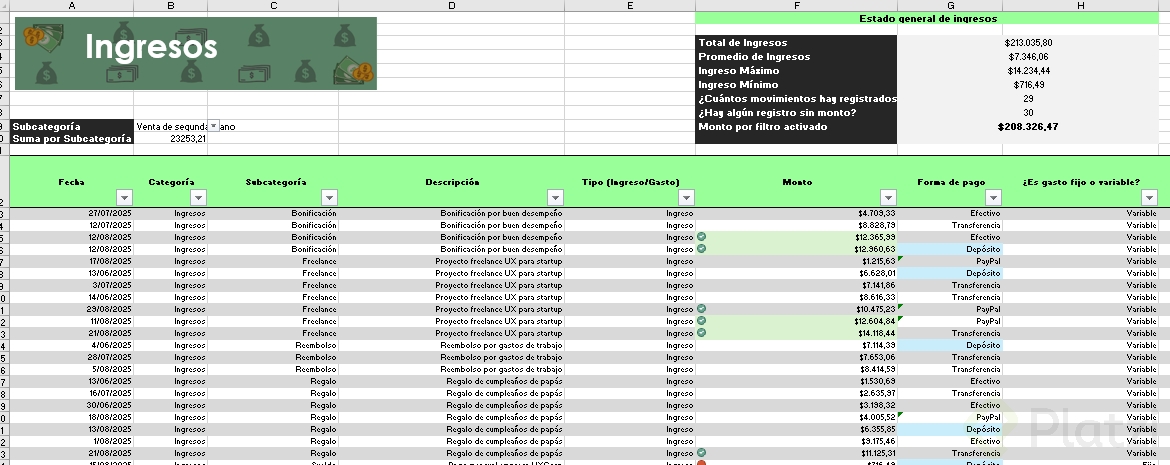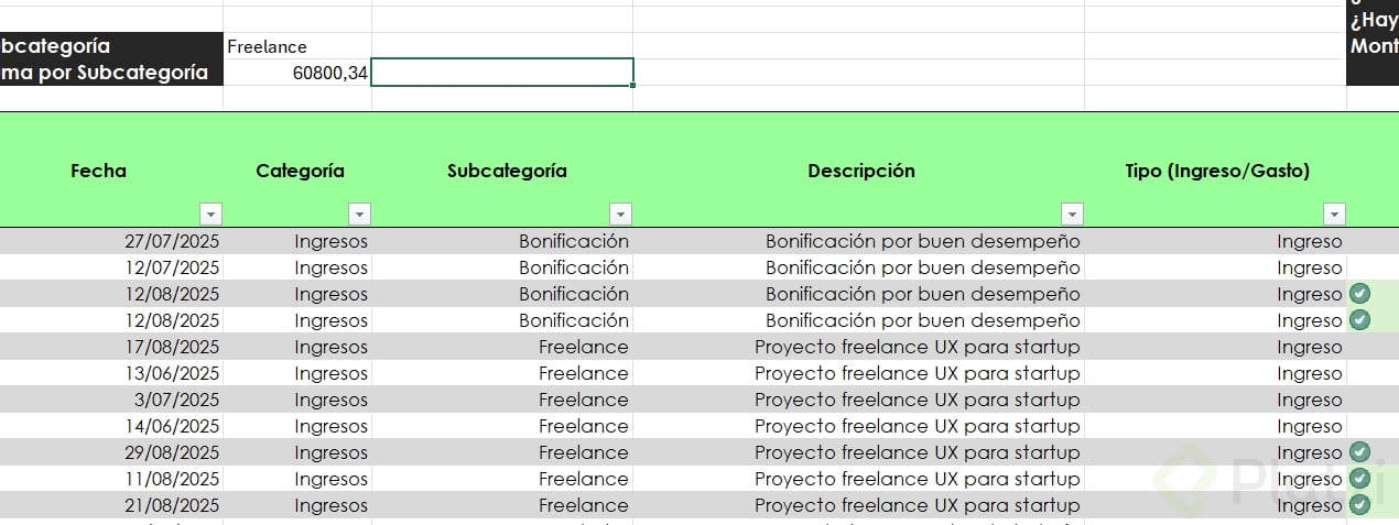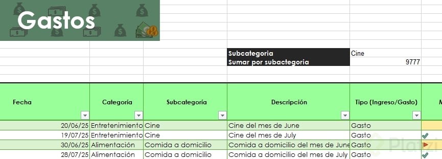 Al combinar formatos condicionales y listas dinámicas, es posible hacer que las alertas y sumas se actualicen automáticamente. Esto provee una vista rápida de gastos según categorías o subcategorías y permite tomar decisiones informadas al instante.
