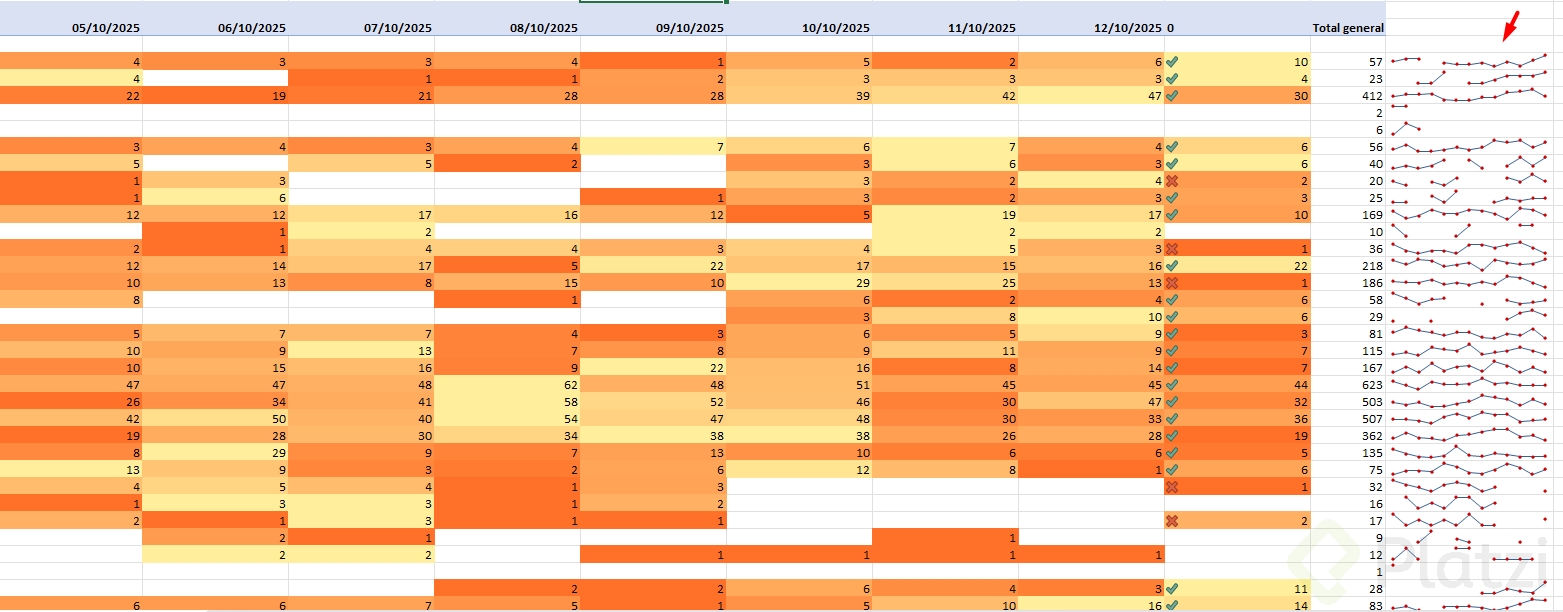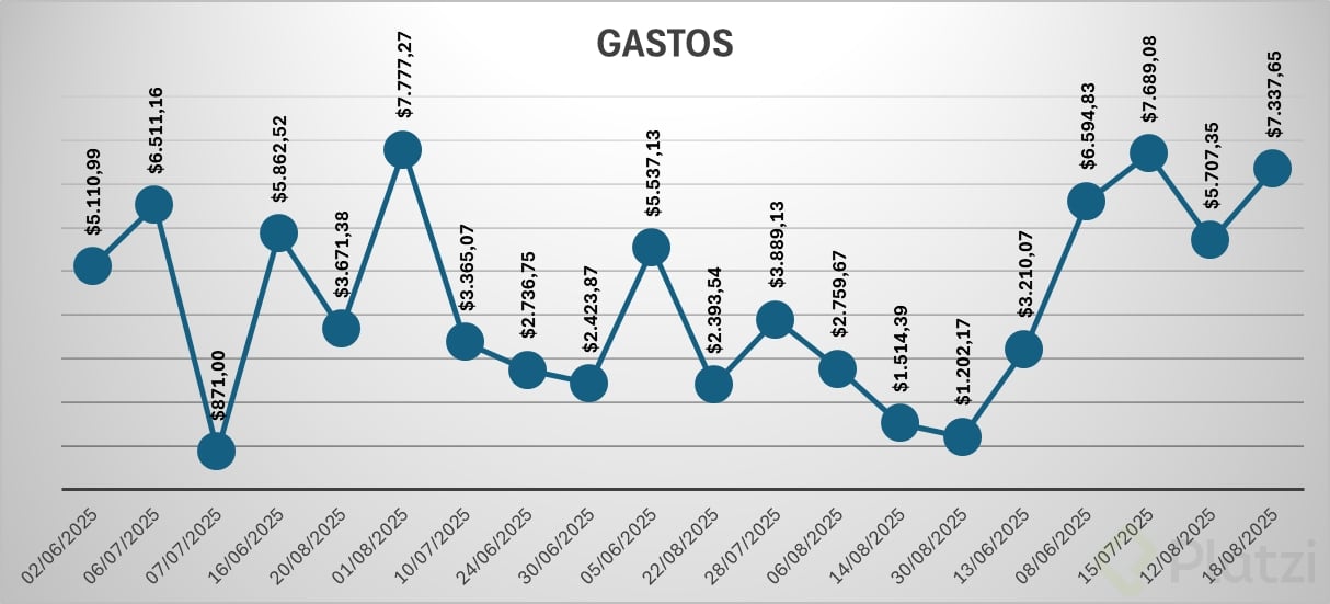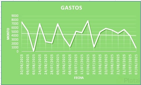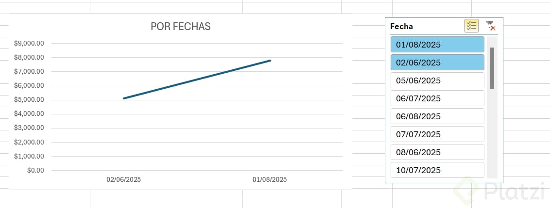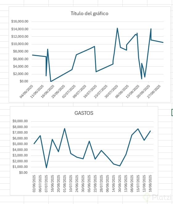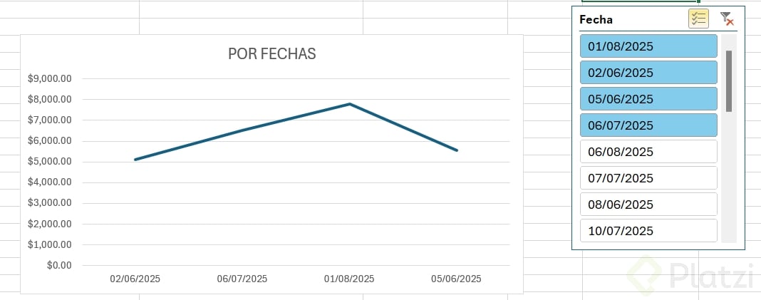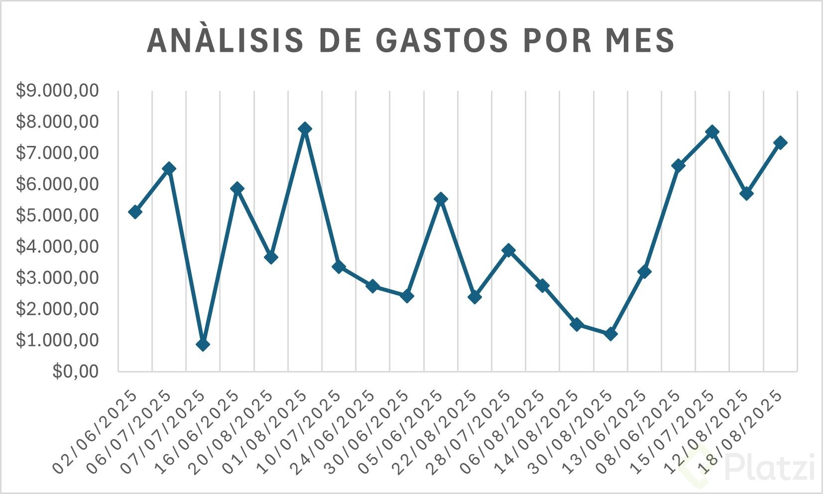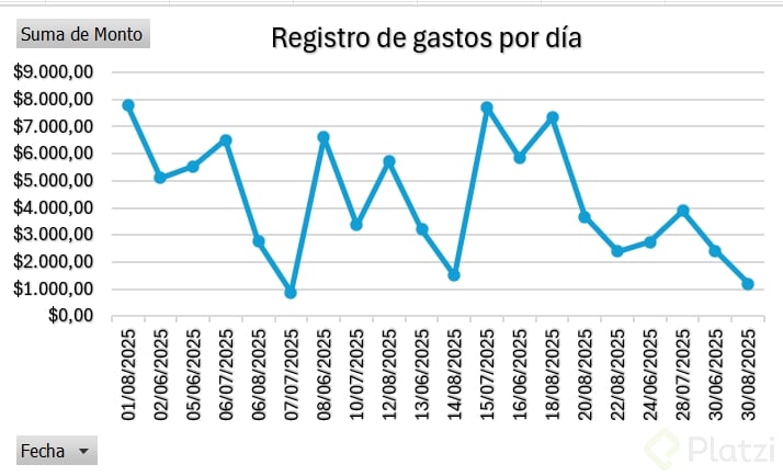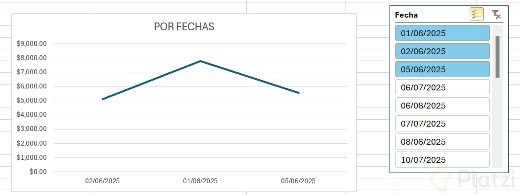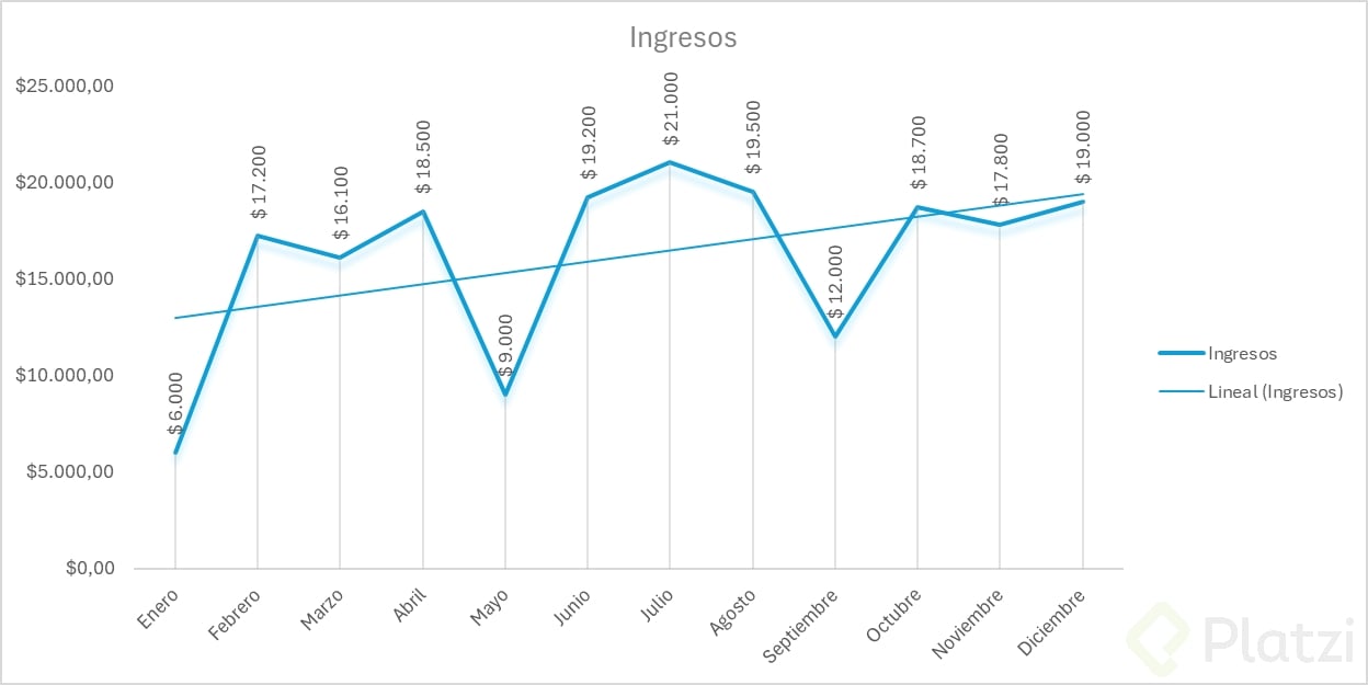 Para conseguir esa agrupación automática tendrás que emplear tablas dinámicas, que se explicarán en la próxima clase. Por ahora, reconoce que el gráfico de líneas es ideal cuando la prioridad es ver la evolución temporal.