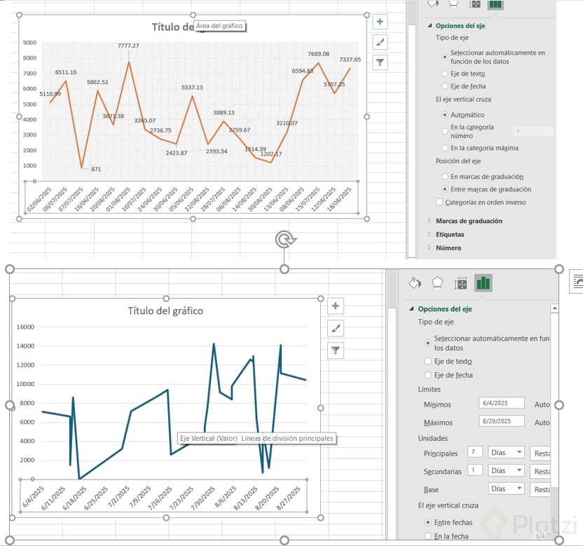 Haz clic derecho sobre el eje del gráfico para acceder a las opciones de formato. Una característica útil es elegir el intervalo de tiempo que deseas mostrar: puedes agrupar por días, meses o años, según el análisis requerido. Esto ajusta la visualización a tus necesidades específicas y mejora la interpretación de la información.