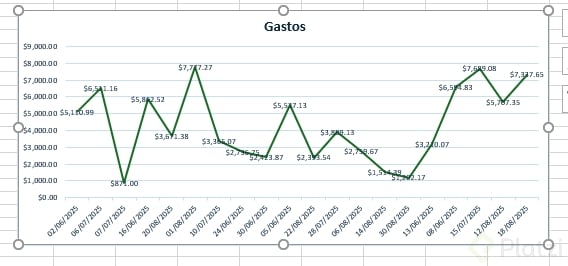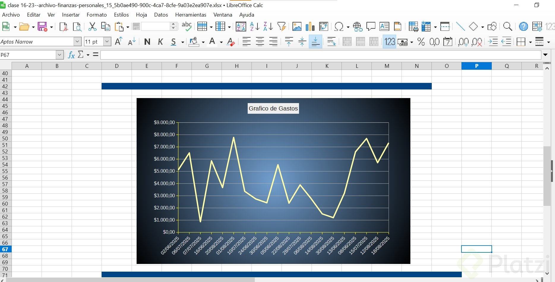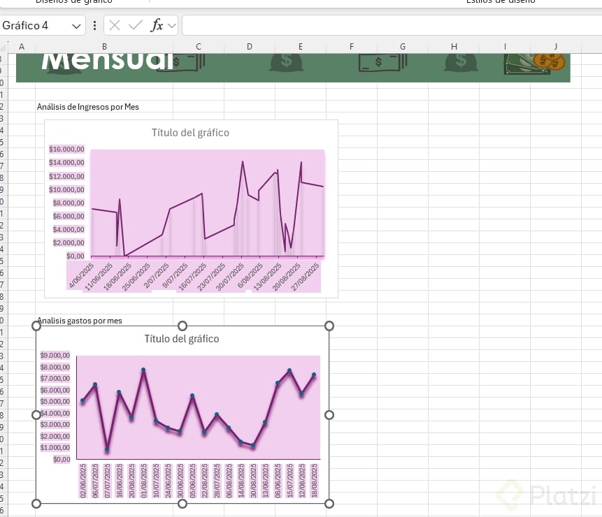 Selecciona tu gráfico de líneas creado y cópialo (Control C) a la pestaña de resumen de tu archivo, pégalo con Control V y prueba todos los formatos de visualización y colores que Excel ofrece. Luego, repite este proceso usando tus datos de gastos para comparar tendencias.