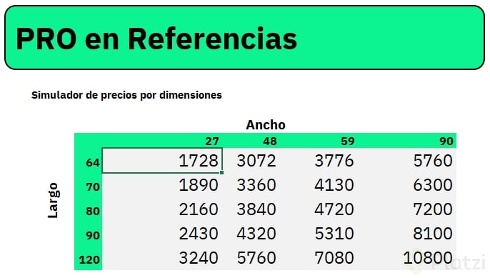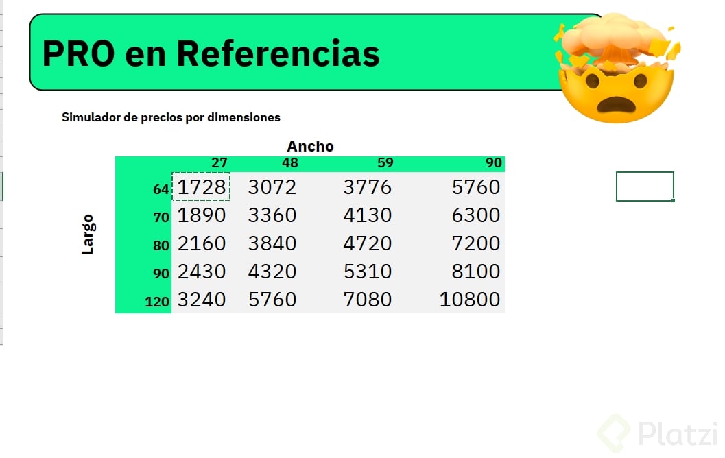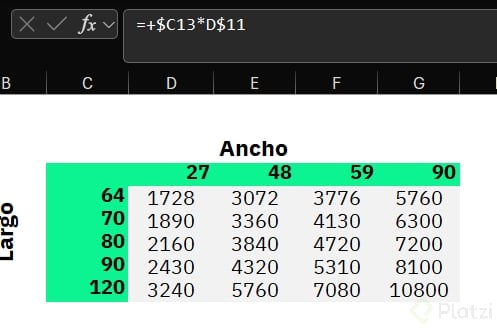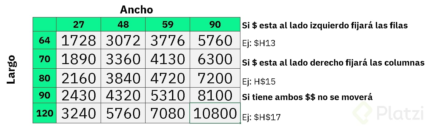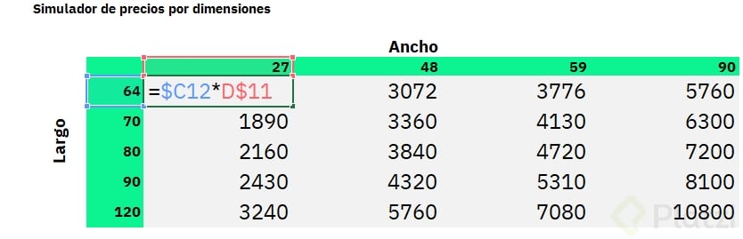 Usar referencias mixtas agiliza la elaboración de tablas que requieren cálculos cruzados, como simuladores de precios por dimensiones o comisiones diferenciadas. Por ejemplo: