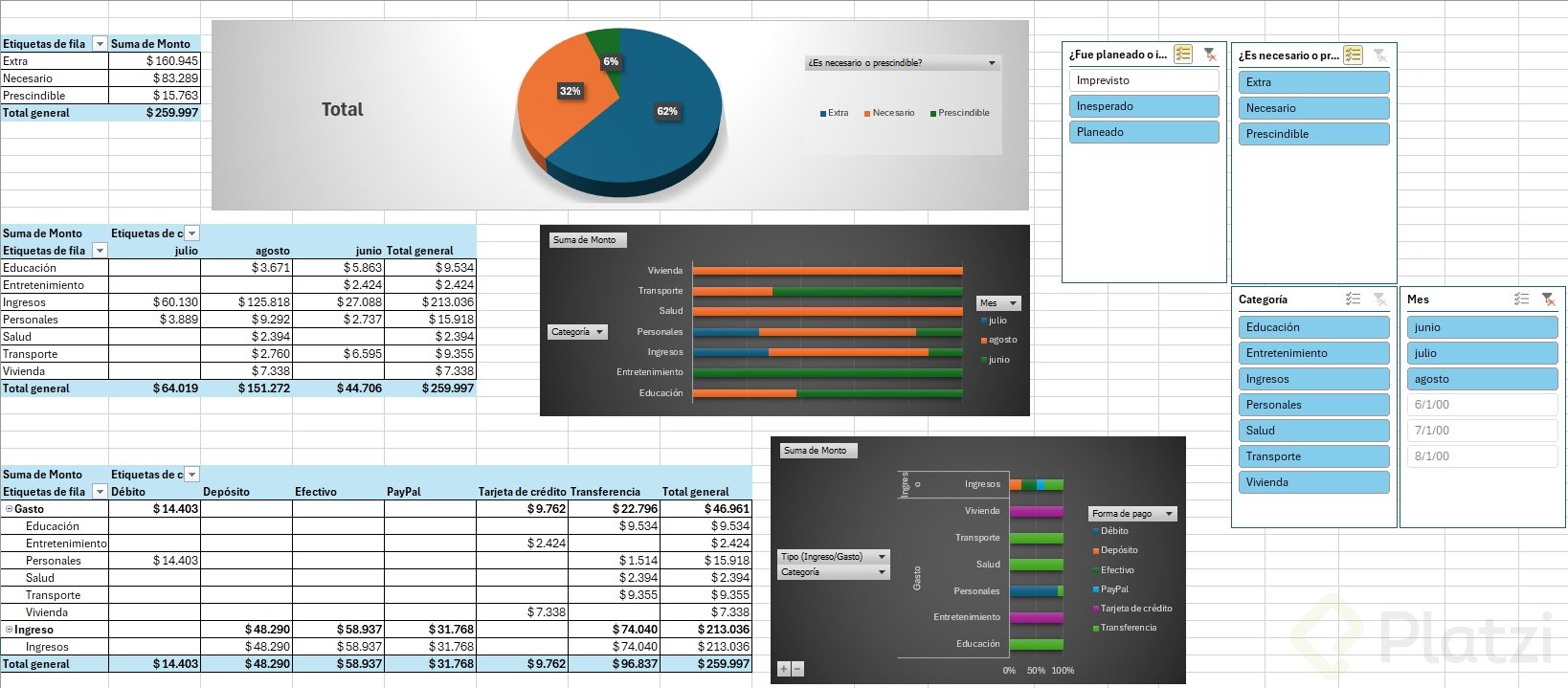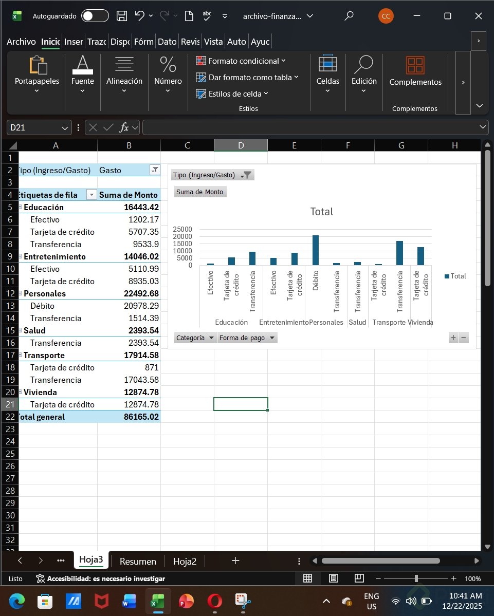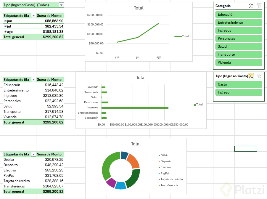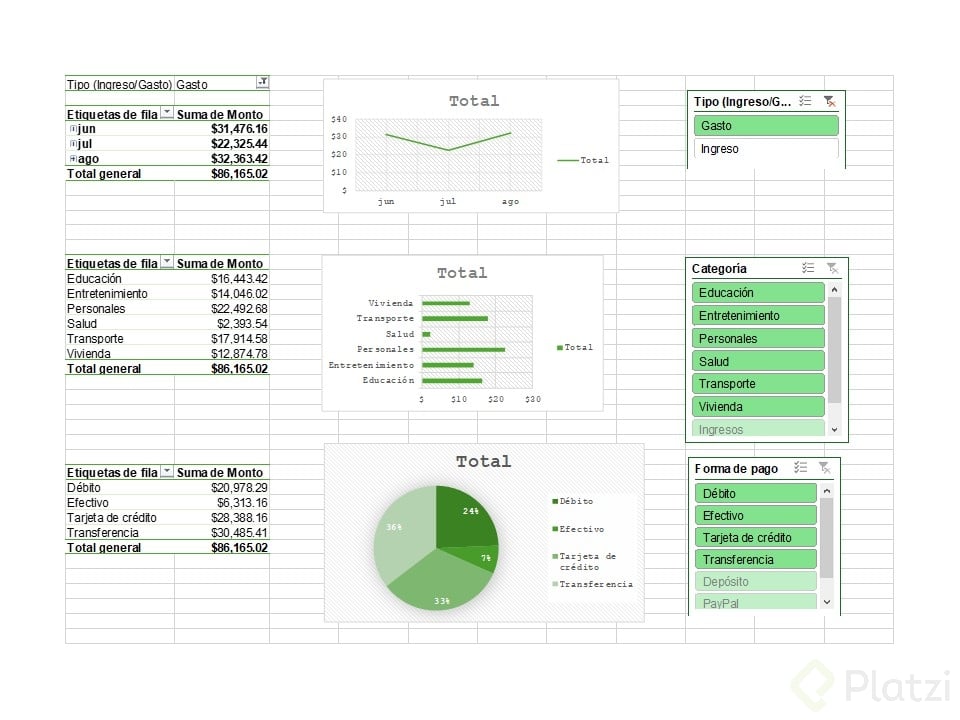 - Colocar los elementos deseados (mes, tipo, monto, categoría, forma de pago) en filas, columnas y valores.
