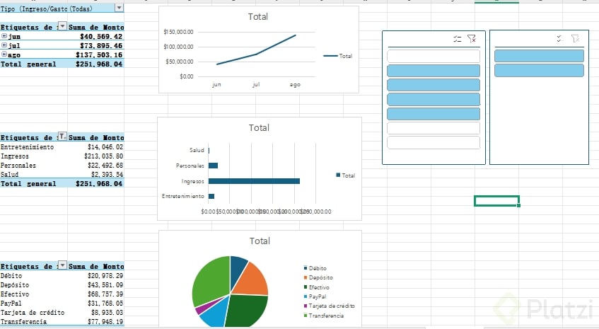 - Agrega segmentadores de datos para filtrar la información por categoría, tipo de ingreso o gasto de modo flexible.