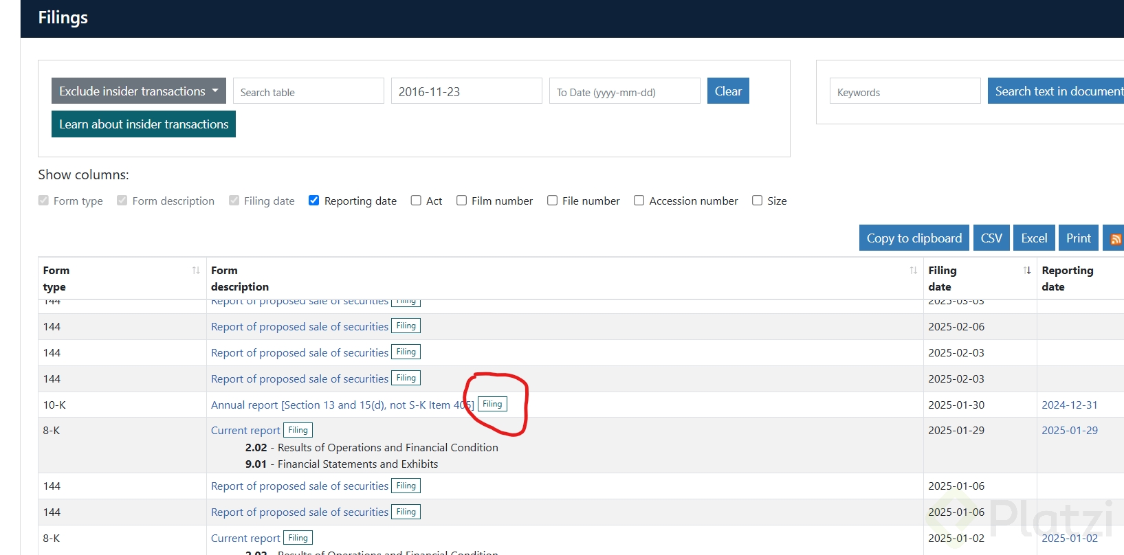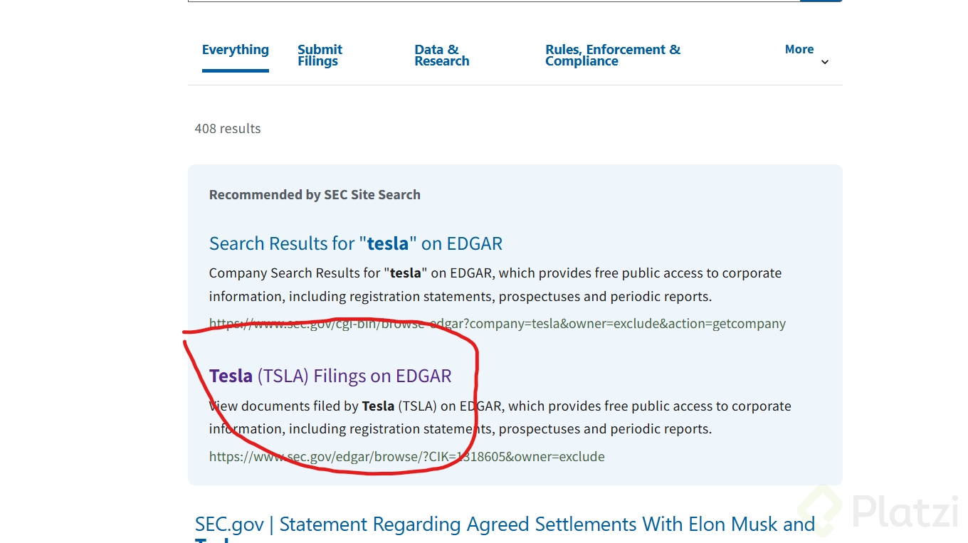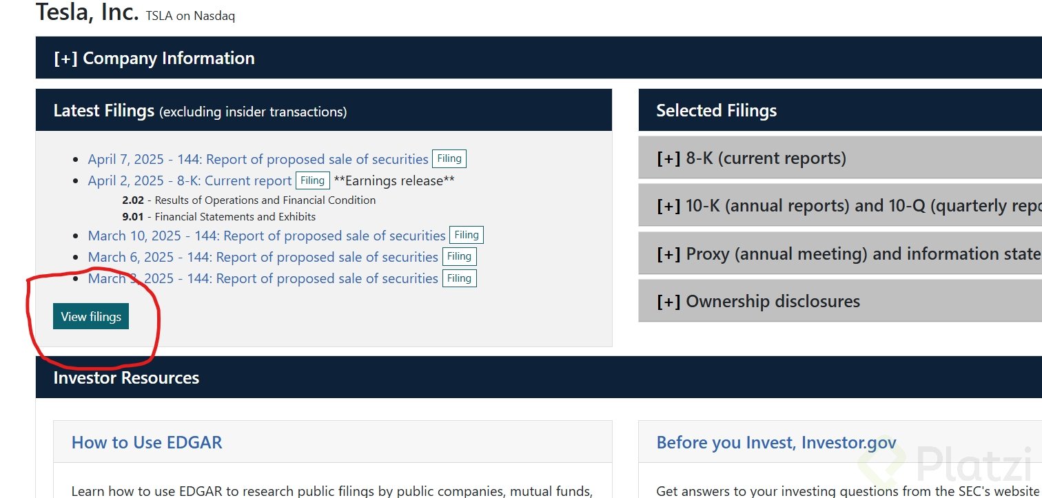En la página de la Comisión de Bolsa y Valores de EE. UU. (SEC): A través de la sección "Company Filings", donde también están disponibles los informes 10-Q trimestrales de Tesla. Este formato es más fácil de manejar y nos permite obtener información de otras empresas americanas.