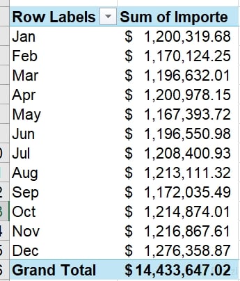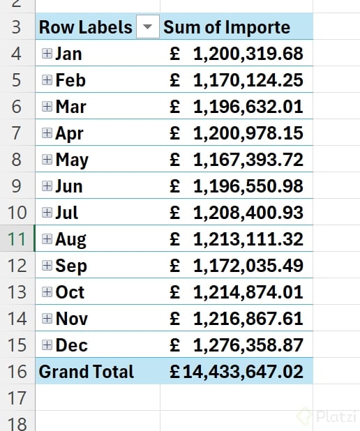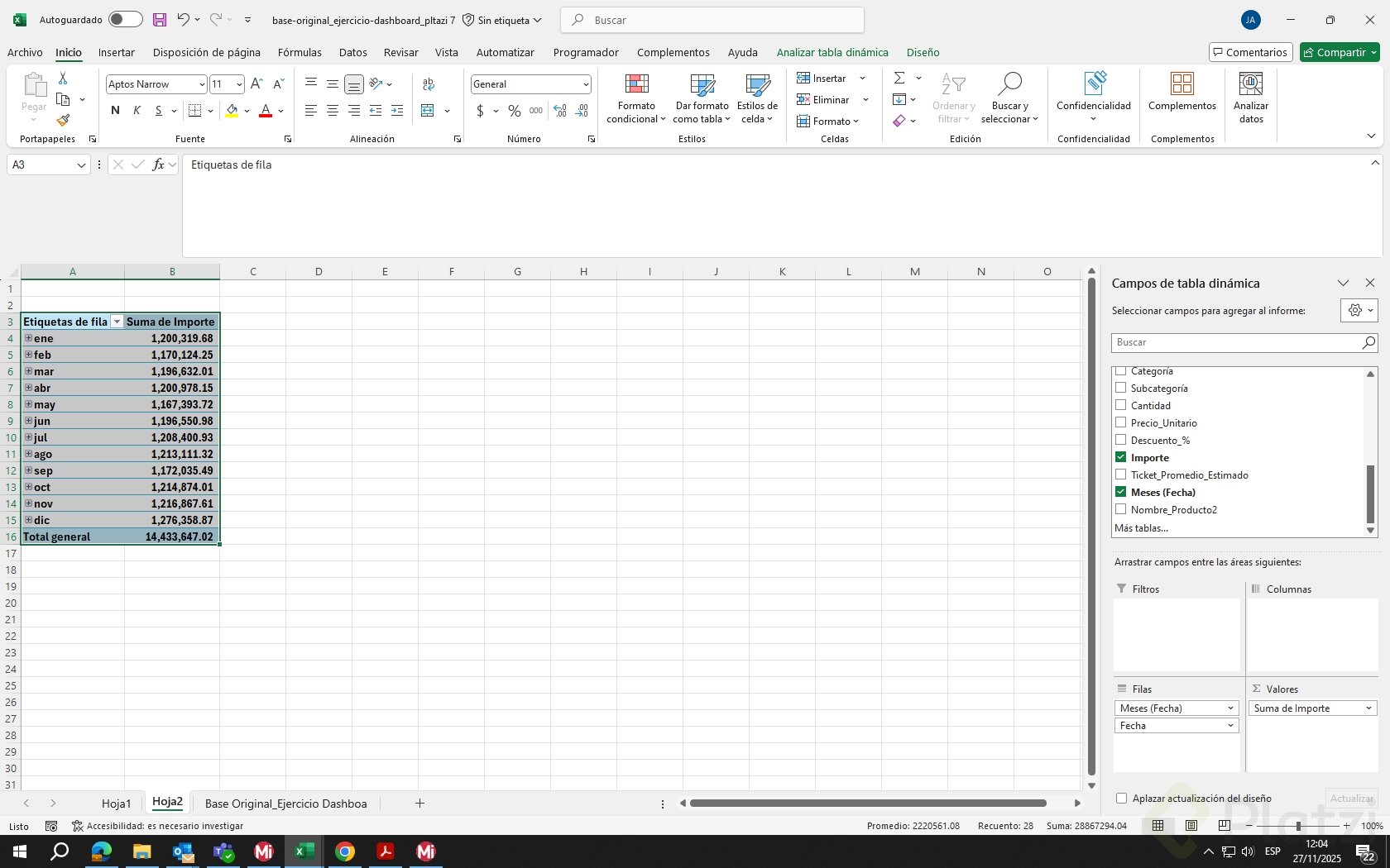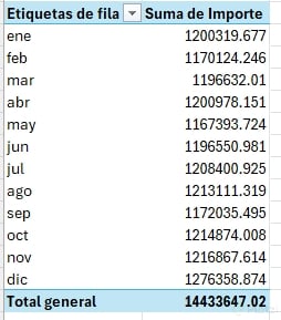 Tu reto práctico: - Crea una nueva hoja. - Inserta una tabla dinámica que muestre únicamente meses y el Importe correspondiente. - Esta vista será la base del proyecto de dashboard.