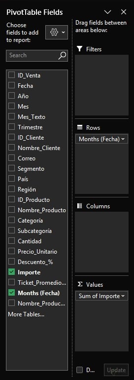 Prácticas rápidas: - Si solo necesitas años, selecciónalos y acepta: verás el total del periodo seleccionado. - Para quitar días y quedarte con meses, marca meses y desmarca días. - Agrega Importe al área de valores para obtener totales por periodo.