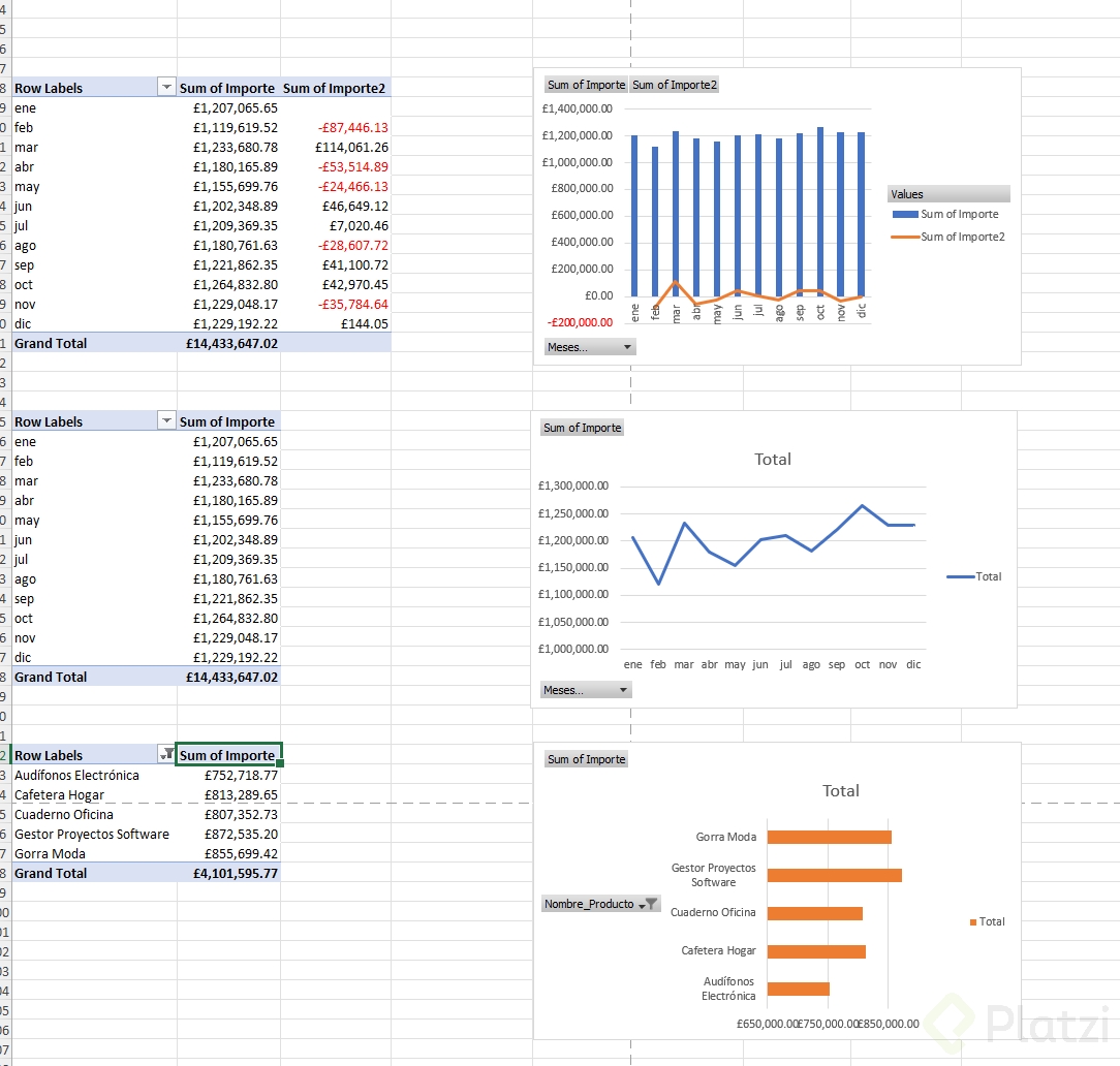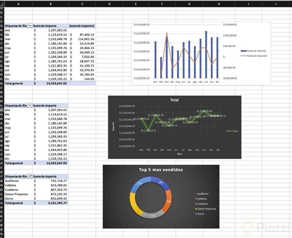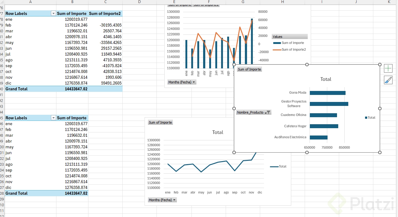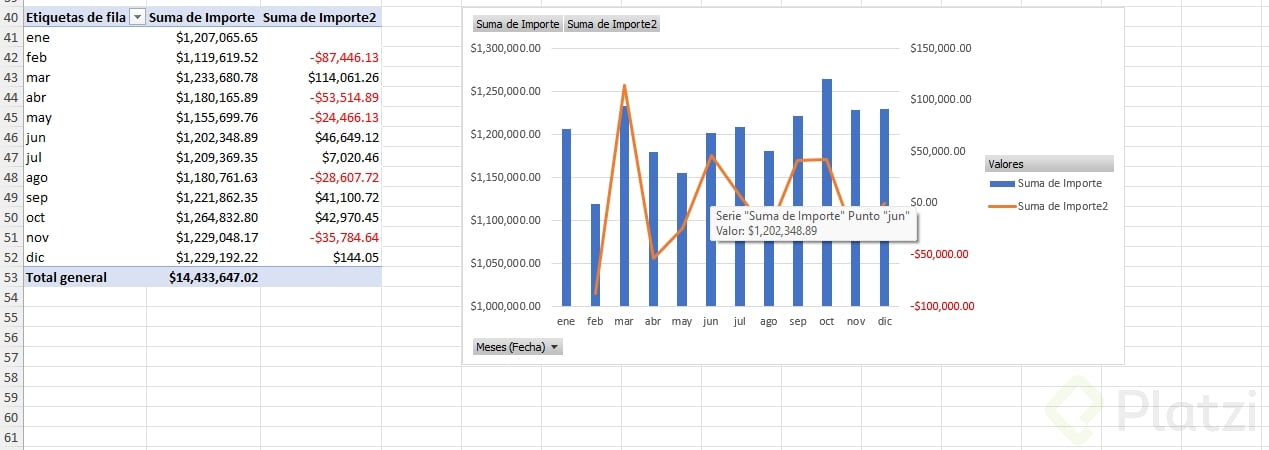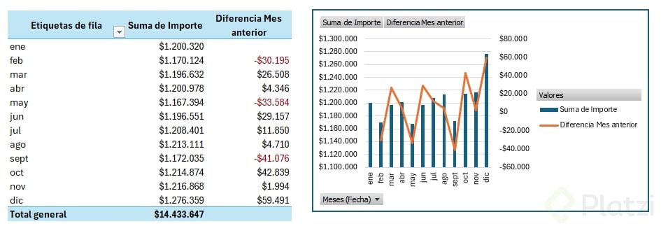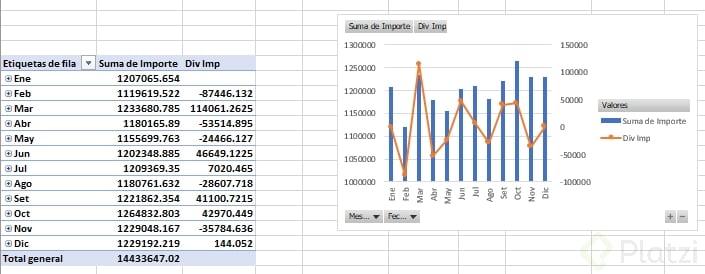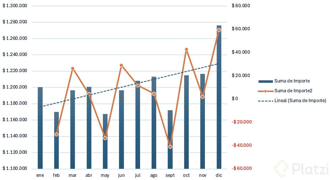 - Replica el último ejemplo y añade su gráfico combinado para comparar importe y variaciones.