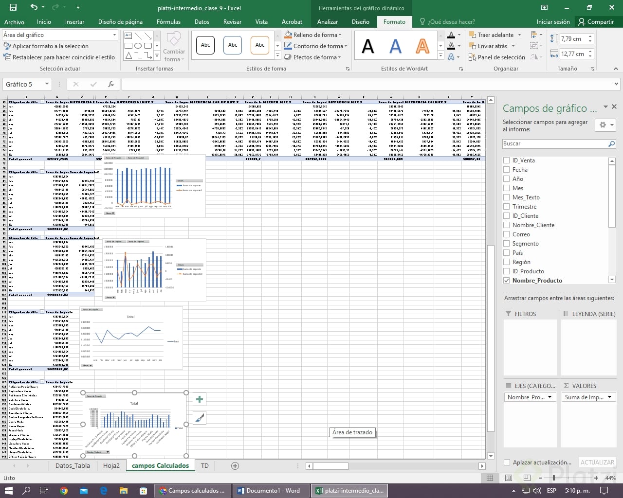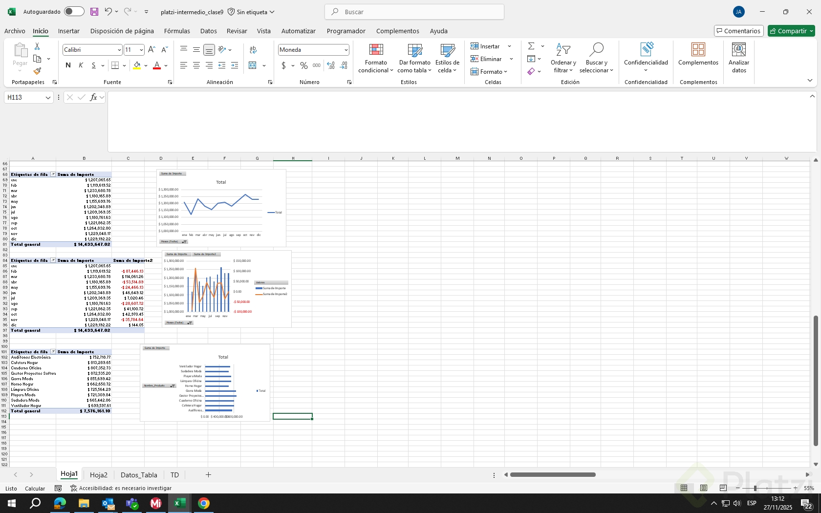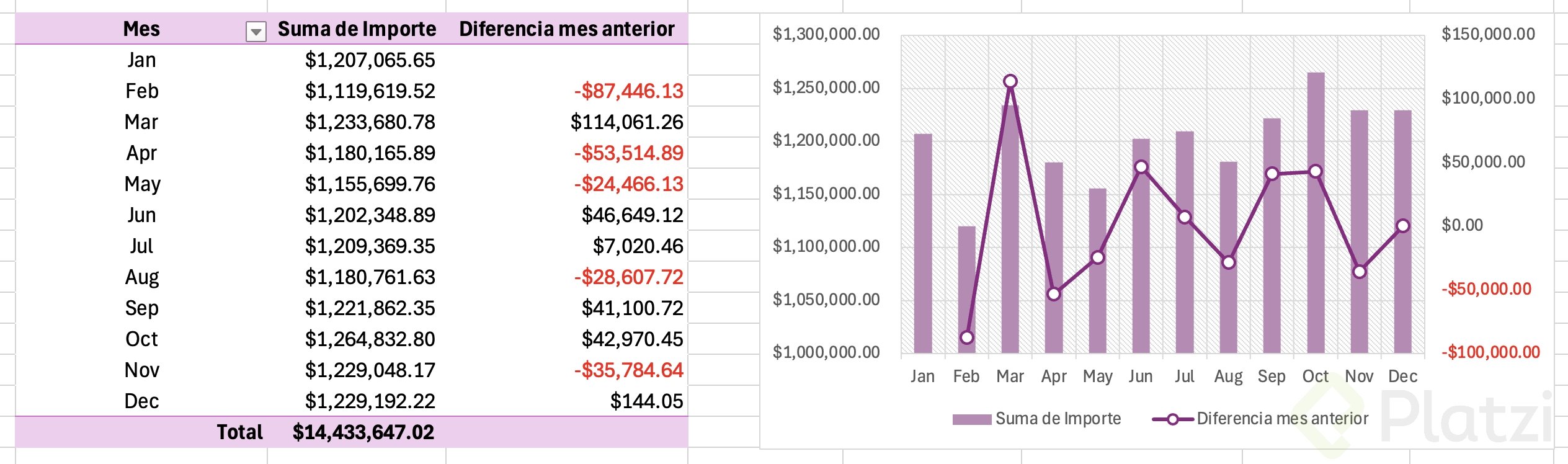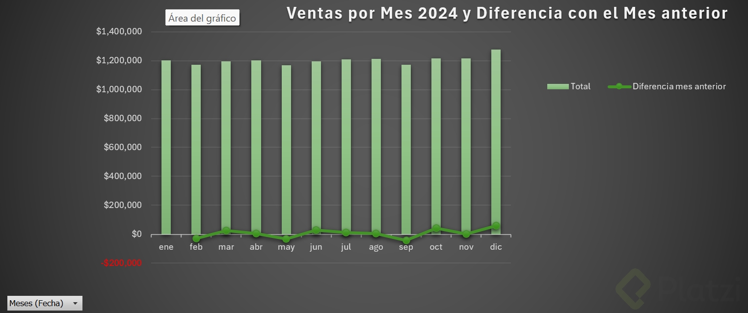 - Replica el último ejemplo y añade su gráfico combinado para comparar importe y variaciones.