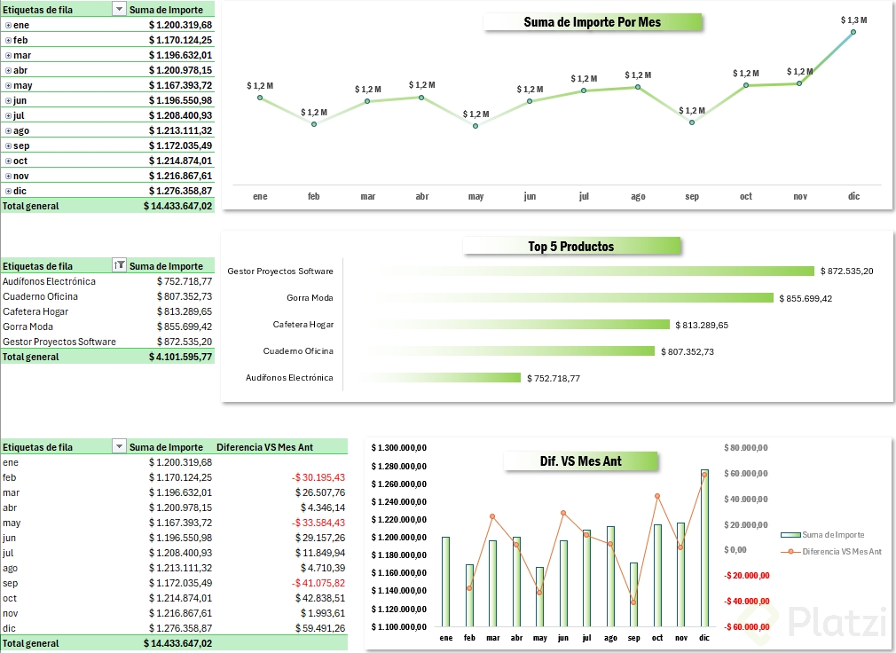 Domina comparaciones mes a mes con tablas dinámicas: calcula la diferencia vs el periodo anterior, el porcentaje de crecimiento/decrecimiento y crea gráficos dinámicos combinados que potenciarán tu dashboard. Todo con pasos claros, atajos útiles y sin fórmulas complejas.