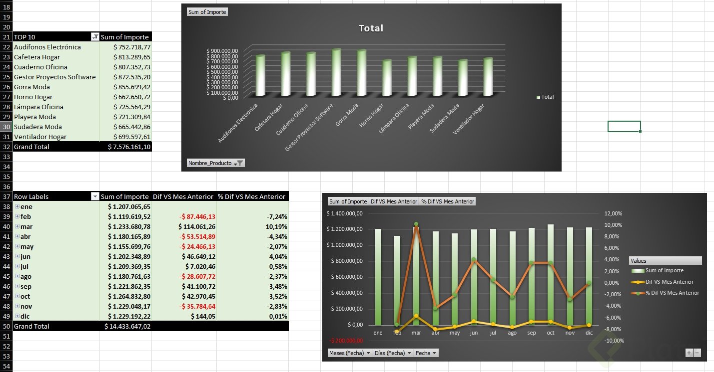 - También puedes crear gráfico de líneas para tendencia mensual y gráfico de barras para el top de productos.