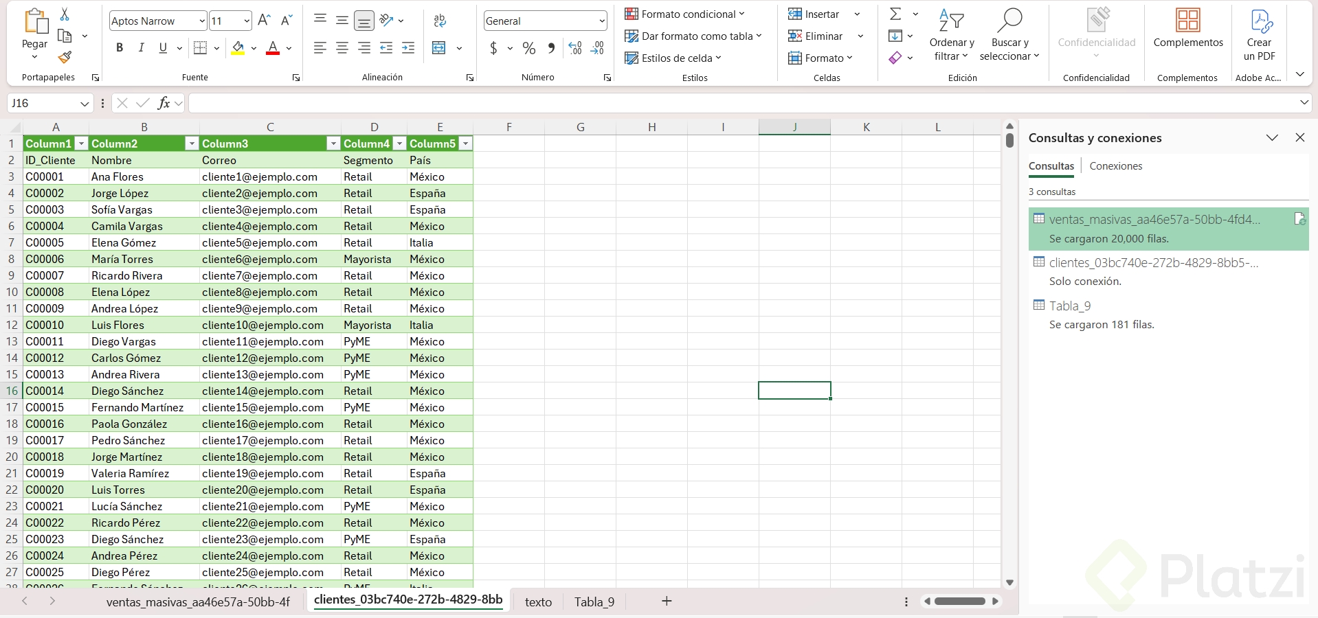 - Verificar el mensaje de confirmación: se cargaron veinte mil filas cuando corresponde a tu archivo.