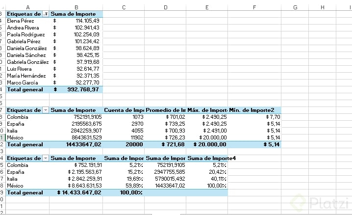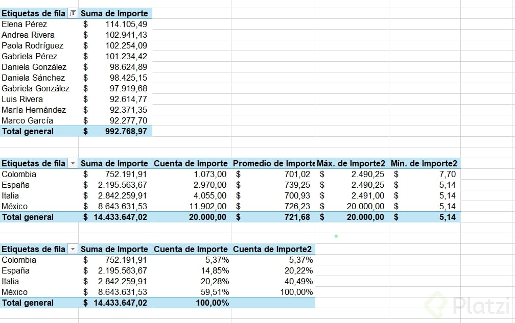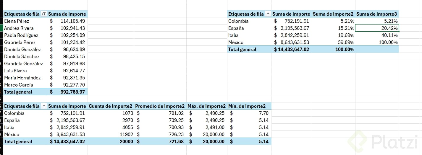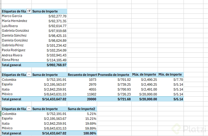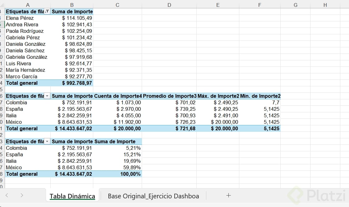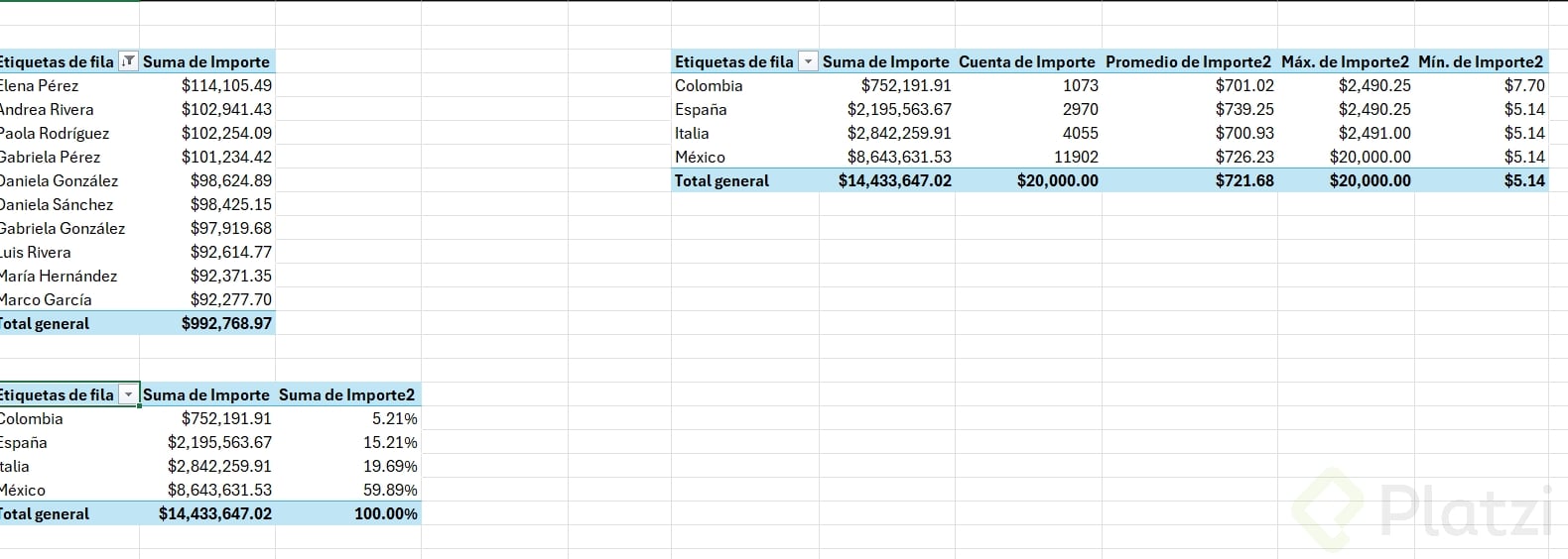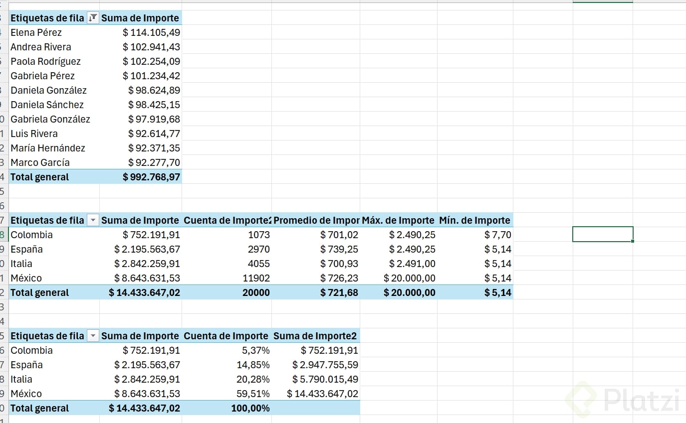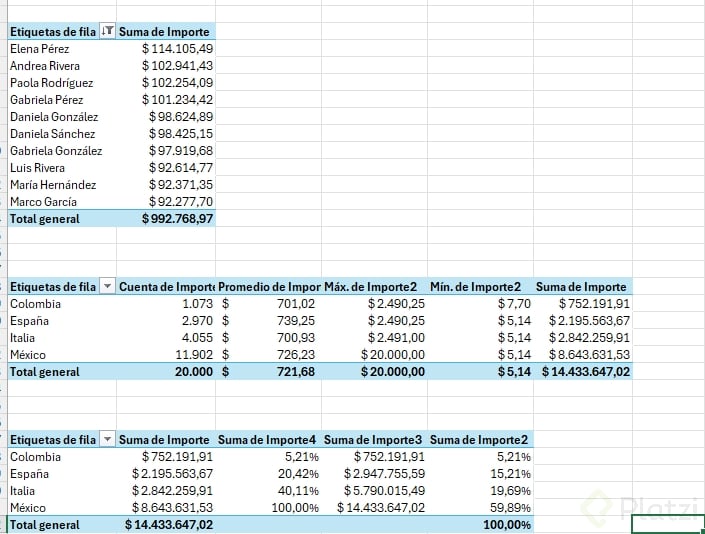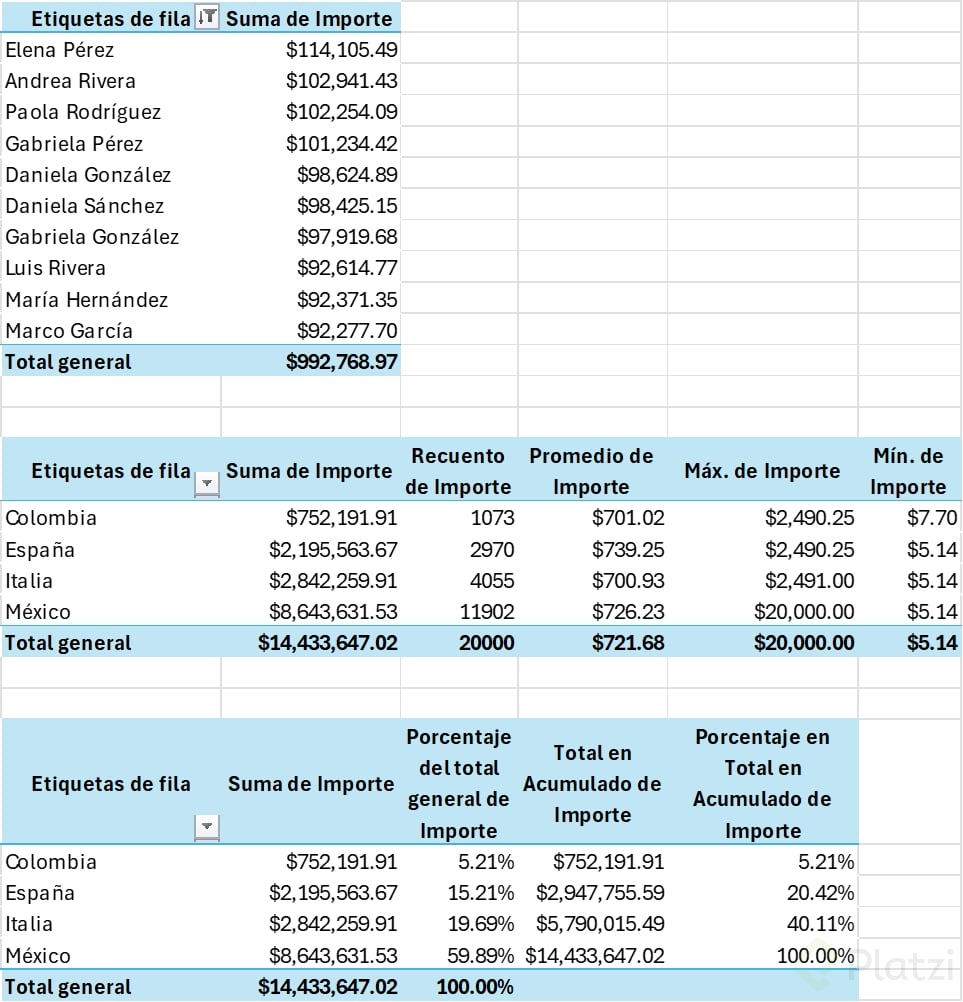 - Usa ordenación descendente por Suma de Importe para lectura inmediata.