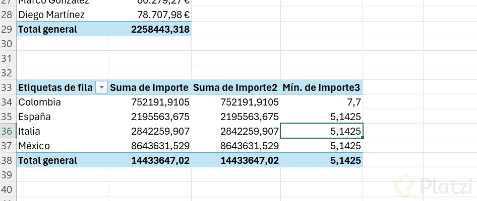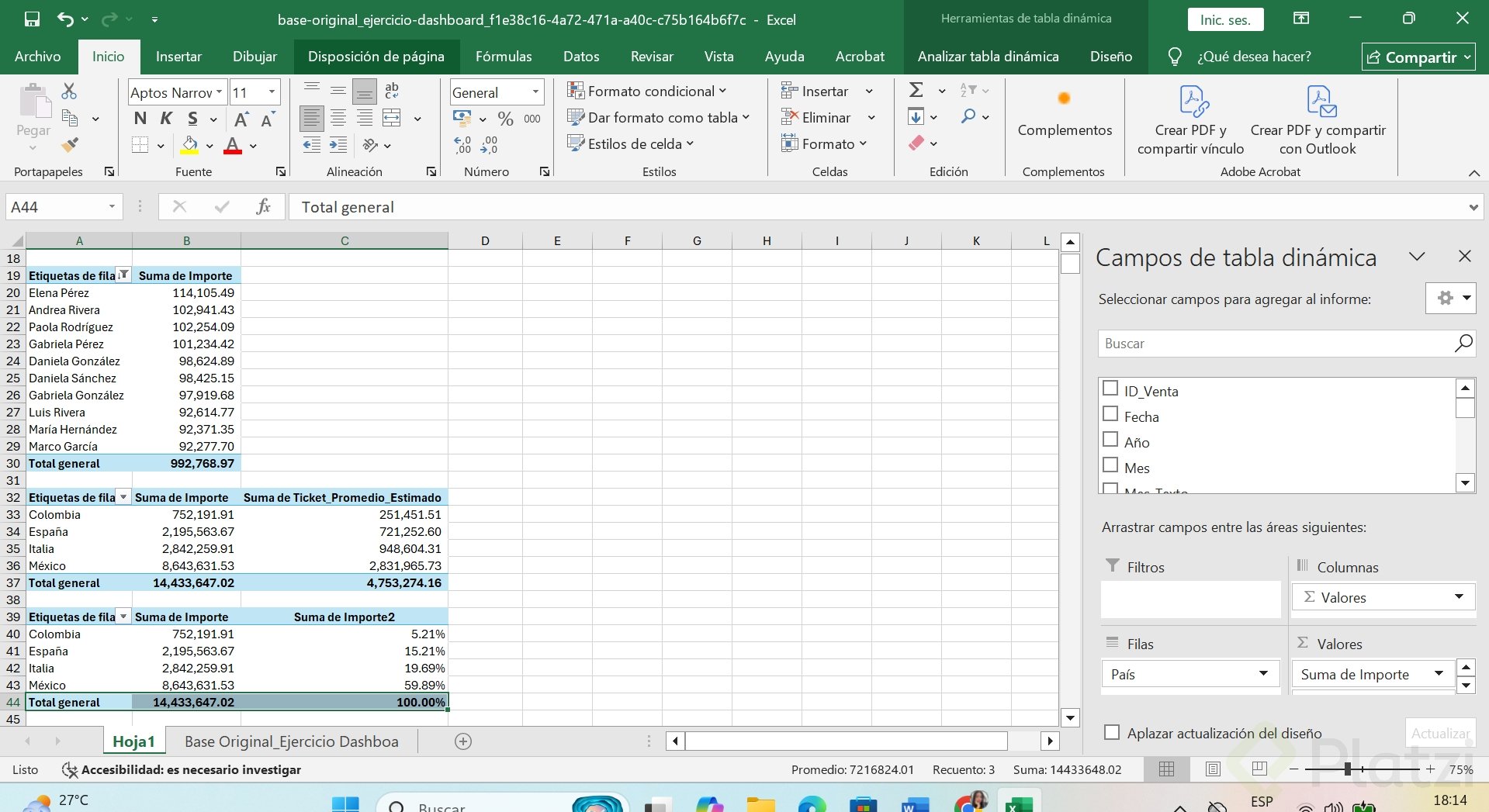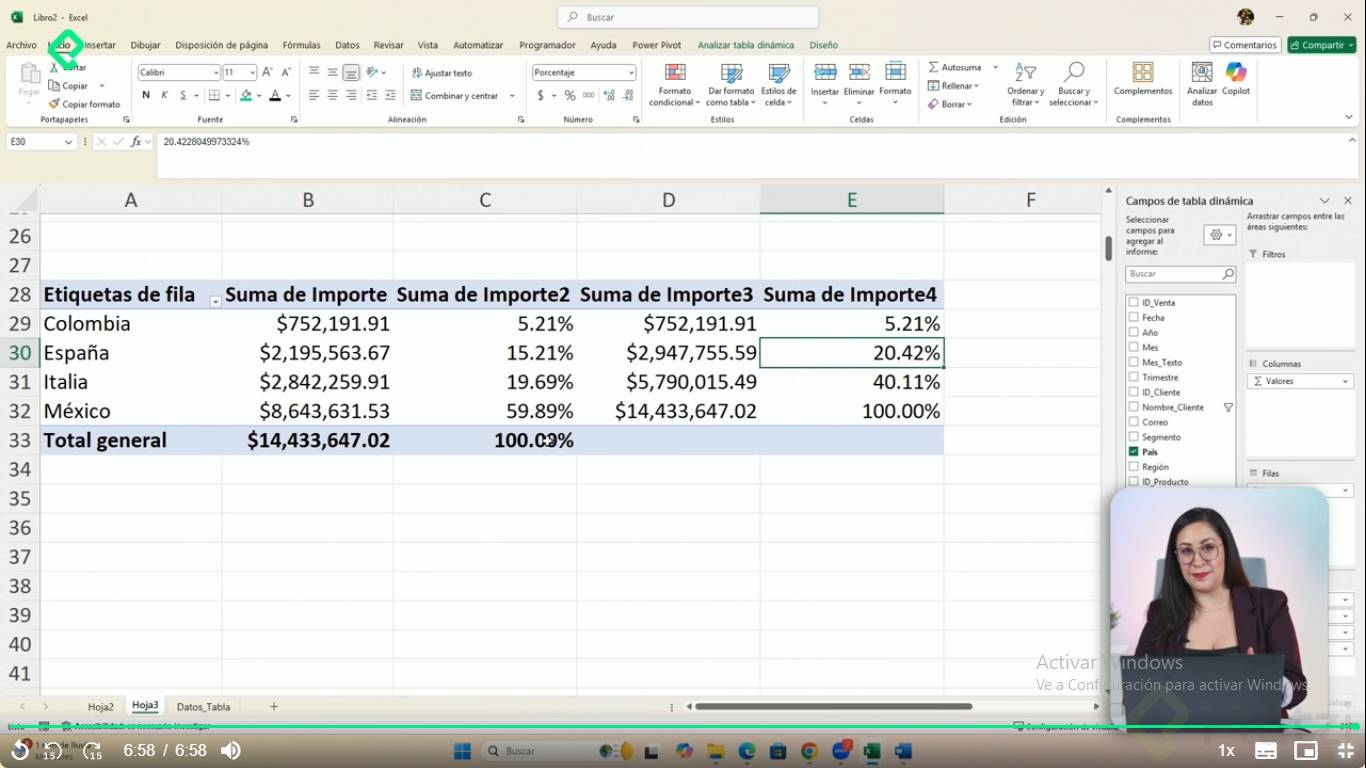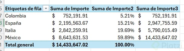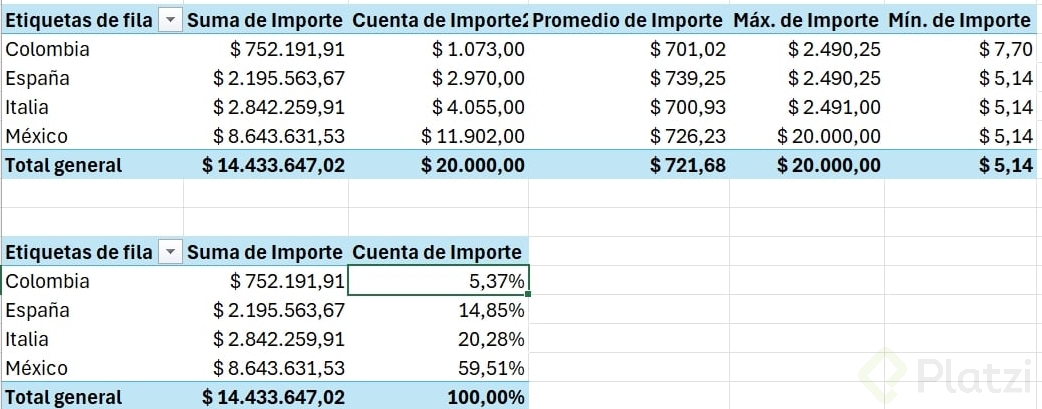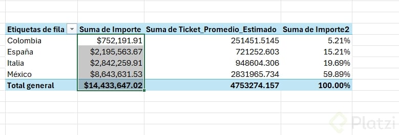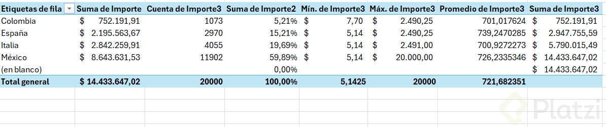 - Cambia el campo de filas a País si buscas un nivel más agregados.