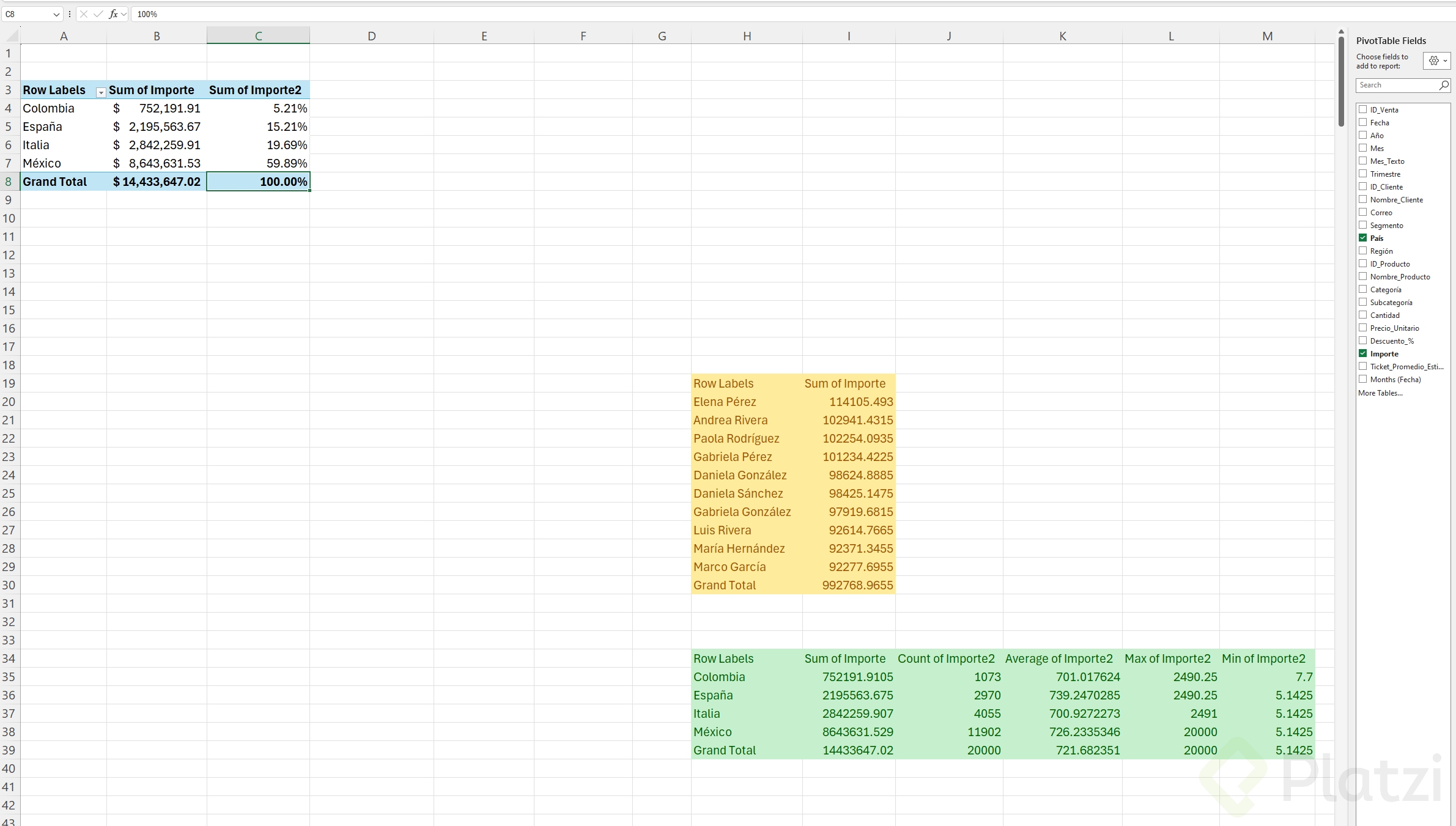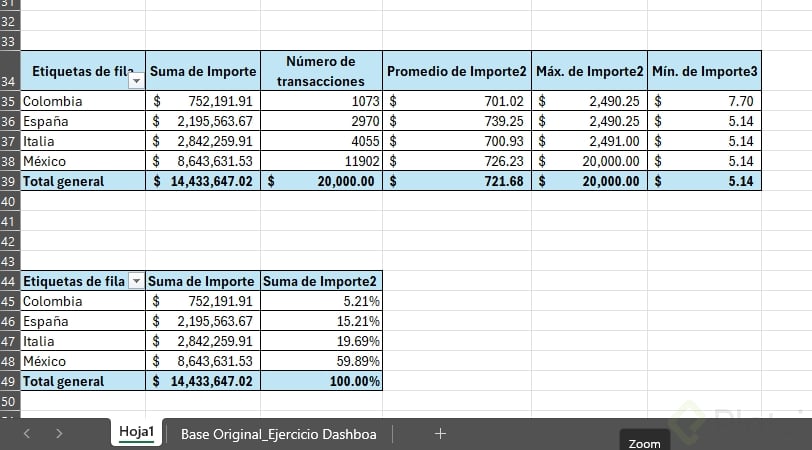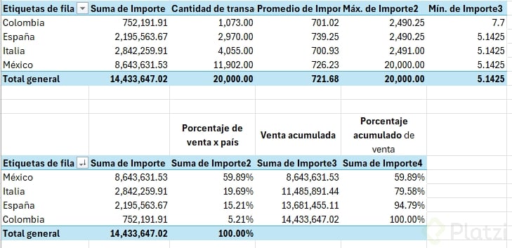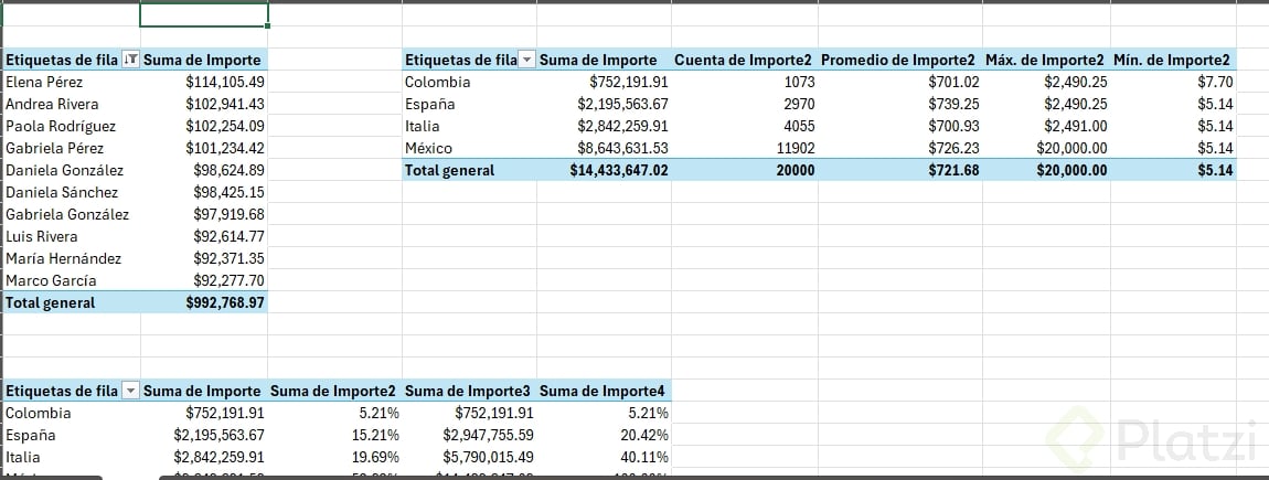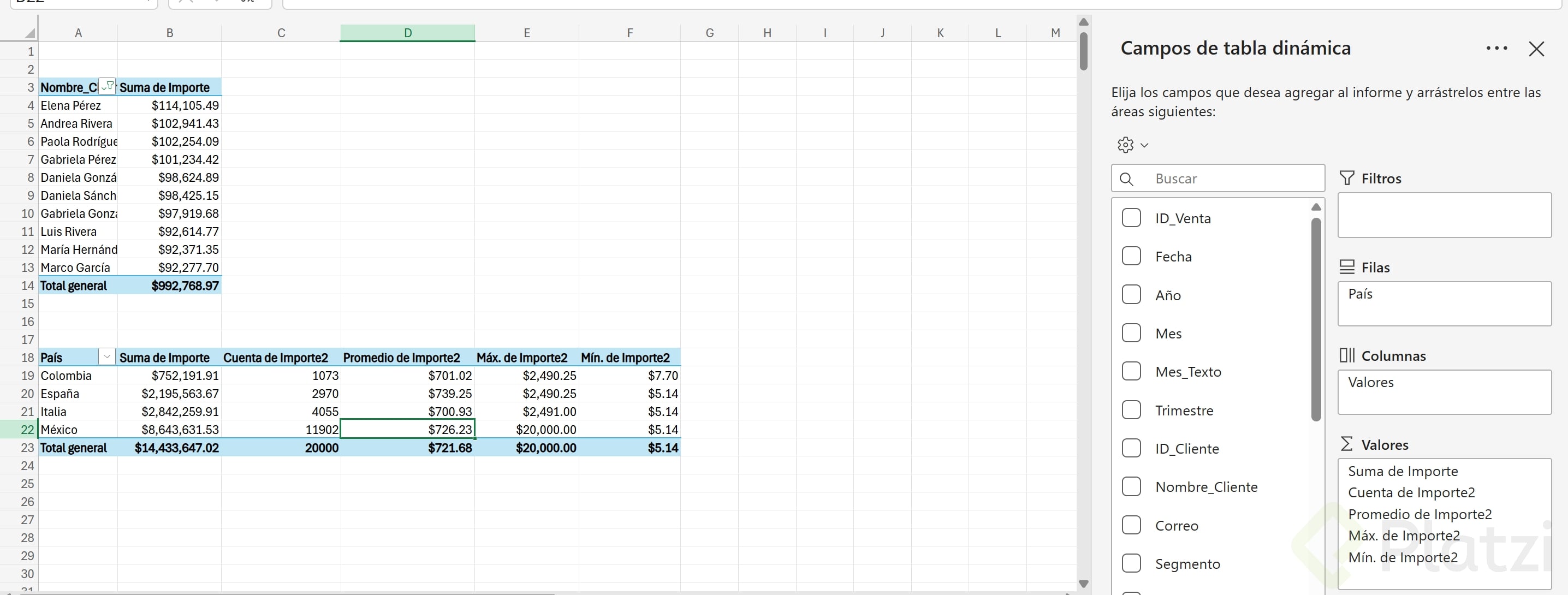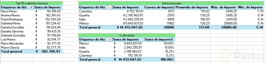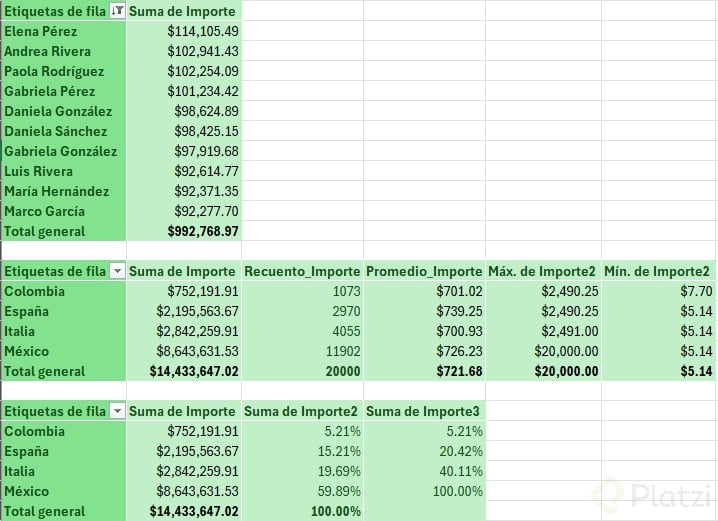 Un mismo campo, como Importe, puede duplicarse y resumirse de distintas maneras para obtener KPIs útiles por país o cliente.