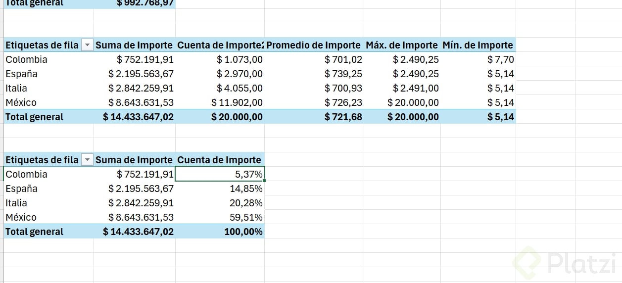 - Convierte a porcentaje: clic derecho sobre el segundo valor > Mostrar valores como > Porcentaje del total general. Verás el 100 % distribuido automáticamente.