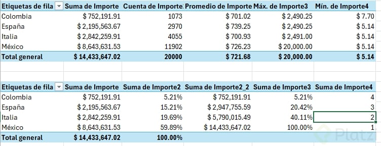- Configura el segundo Importe: clic derecho > Configuración de campo de valor > Recuento. Cambia formato a General si no son montos.