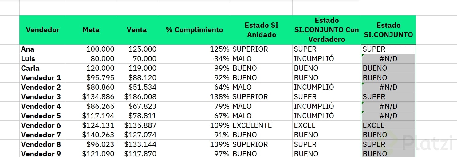 Con si conjunto aplicas varias reglas en una sola fórmula. Ejemplo de clasificación por cumplimiento: >= 120% “super estrella”, >= 100% “cumplido”, >= 80% “en riesgo”. Cierra siempre tus paréntesis para evitar errores.