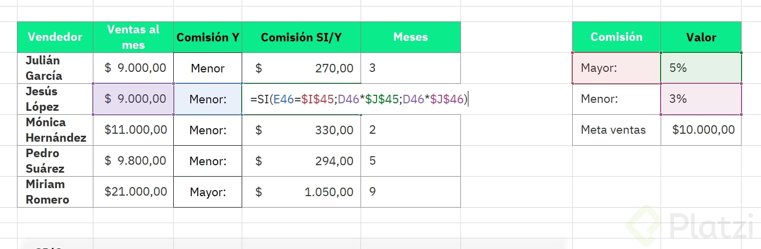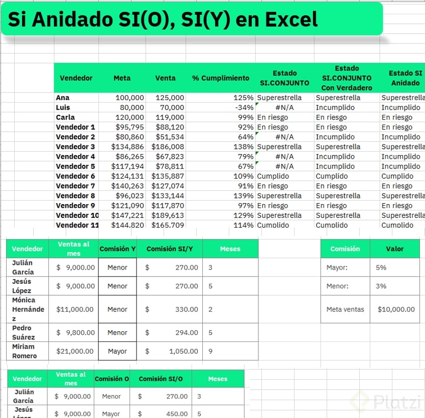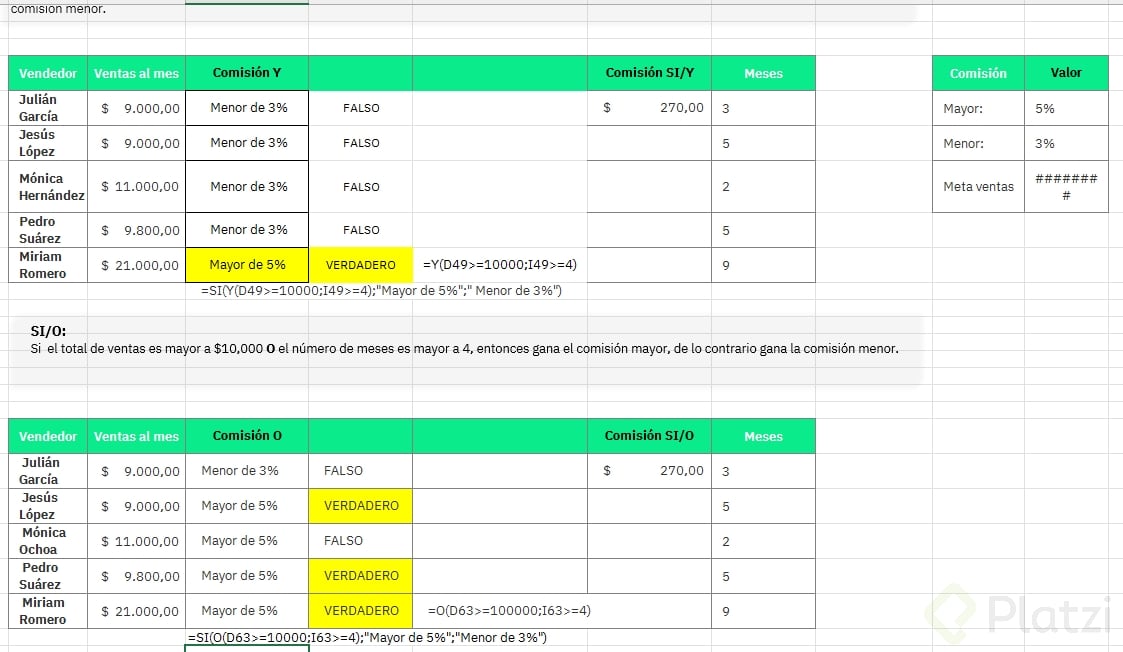 - Estructura: si(y(condición_ventas, condición_meses), “comisión mayor”, “comisión menor”).