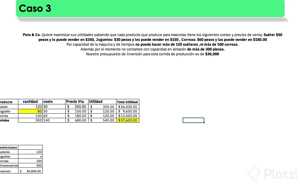 - Interpretación del óptimo: produce el máximo de plátano permitido y 55 de zarzamora para alcanzar la ganancia máxima.