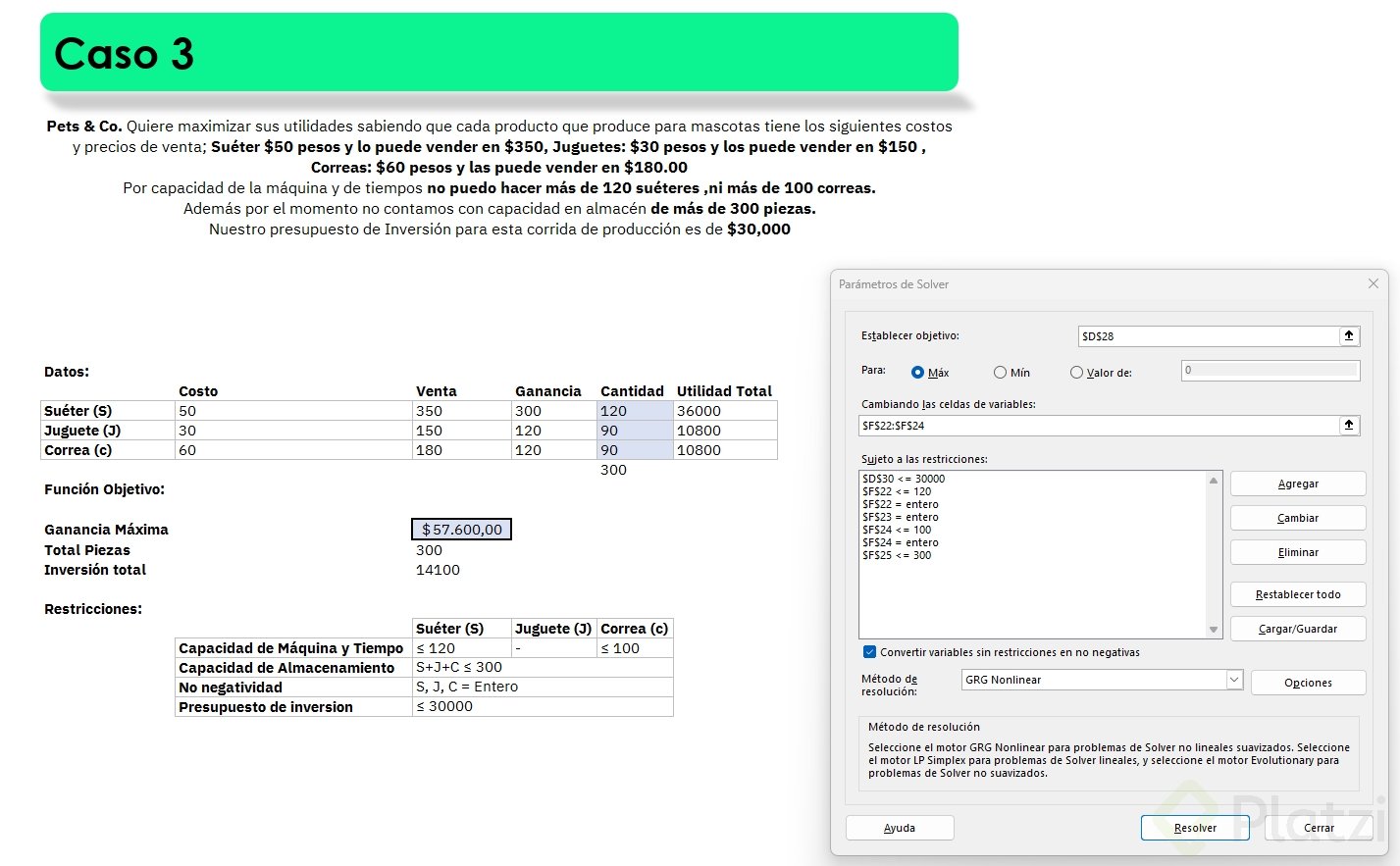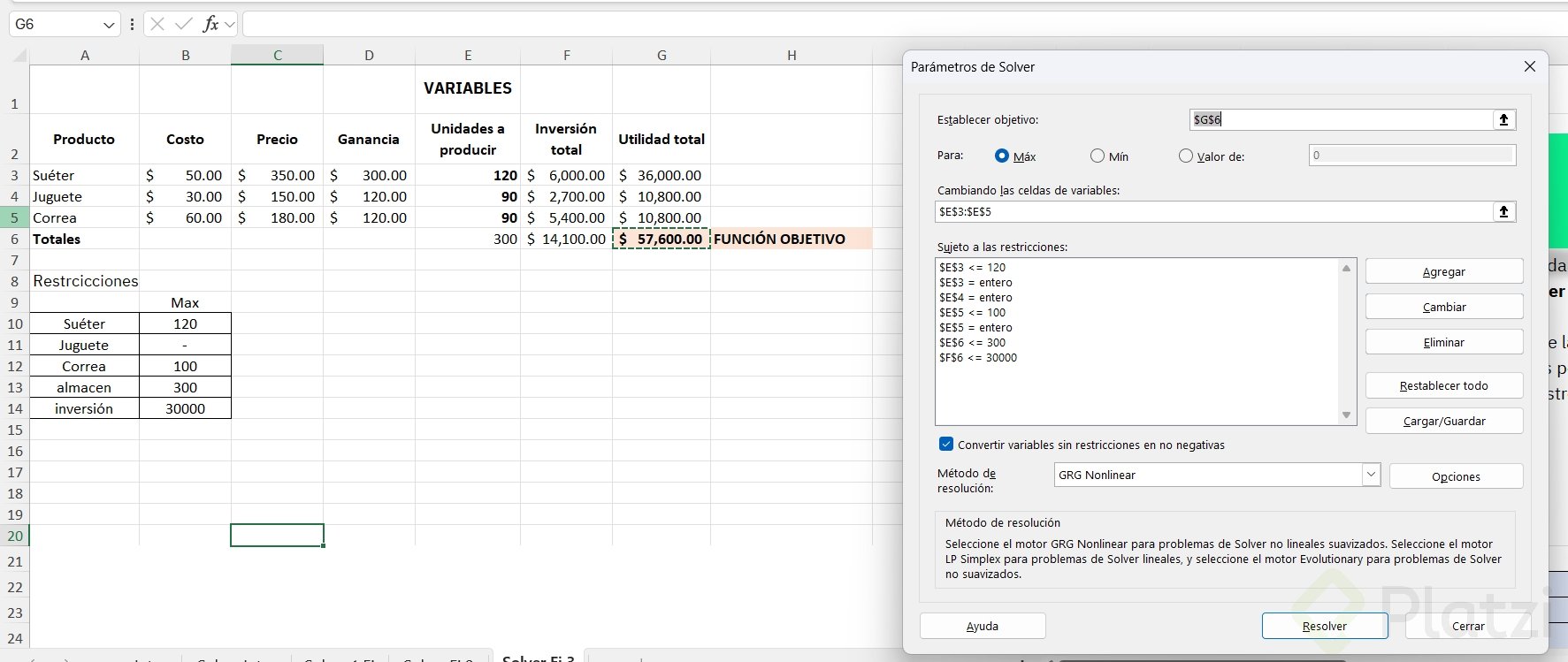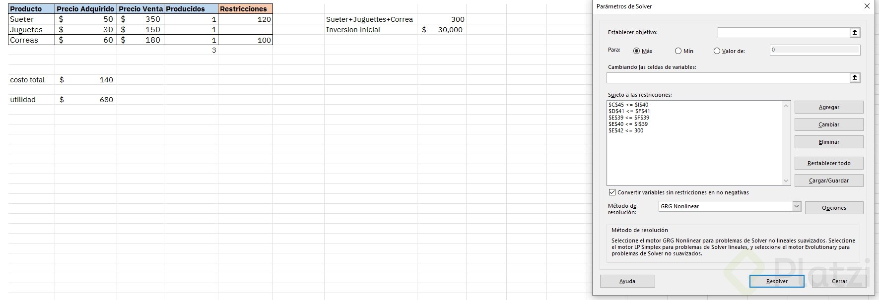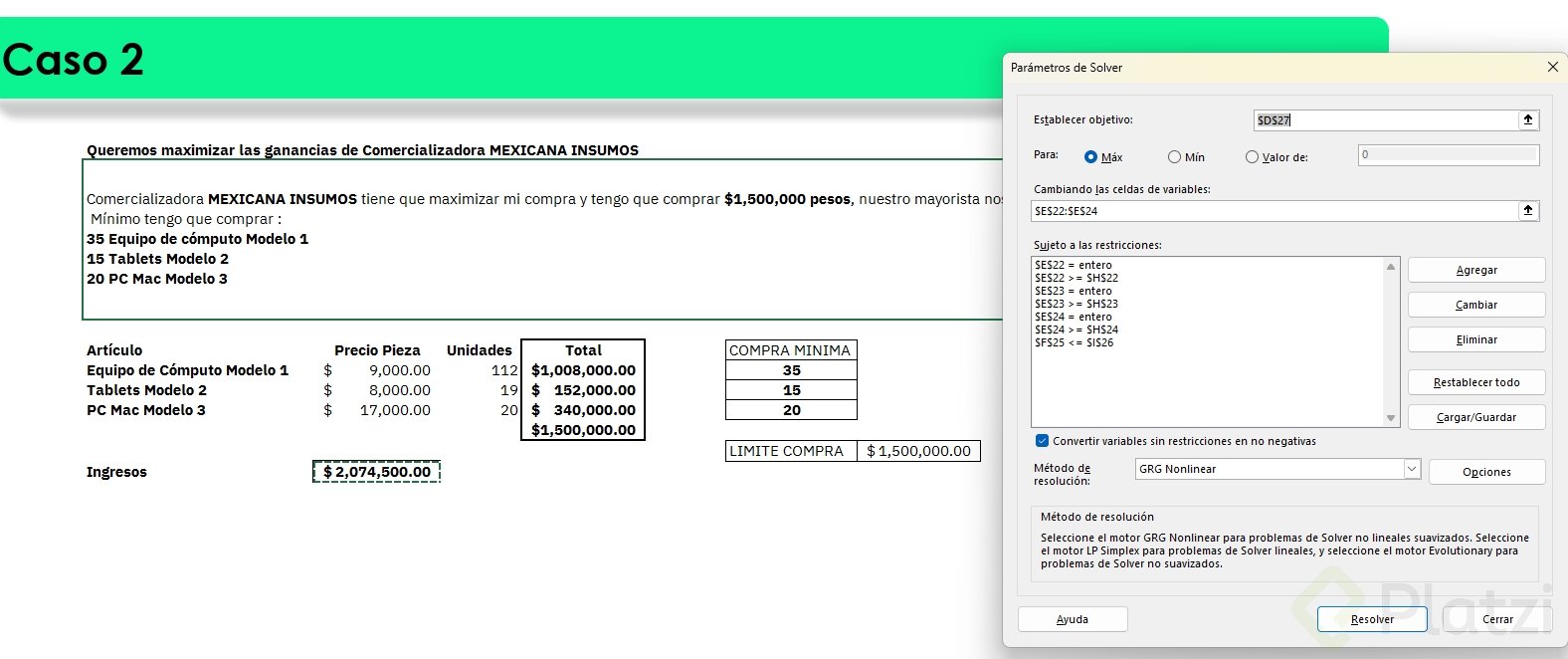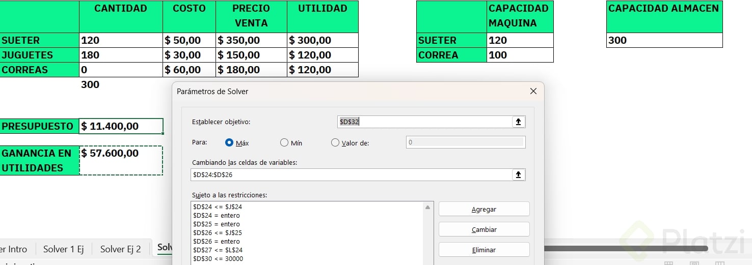 - Para agregar restricciones: pulsa agregar, selecciona la celda y elige la condición adecuada.