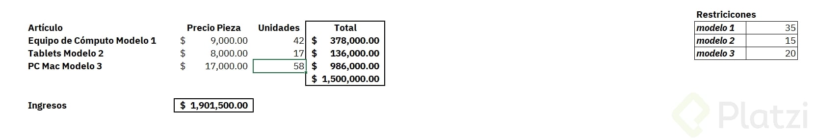 - Fórmula: ganancia plátano por cantidad de plátano + ganancia zarzamora por cantidad de zarzamora.
