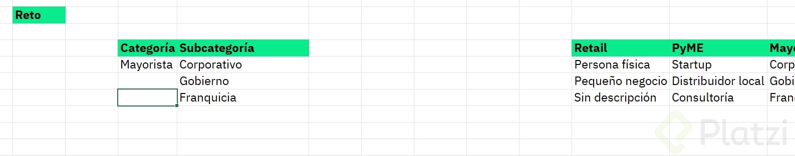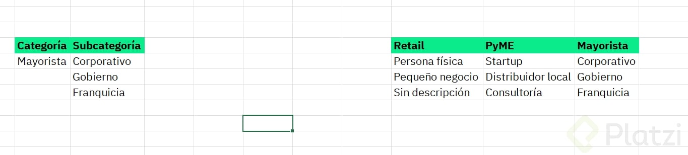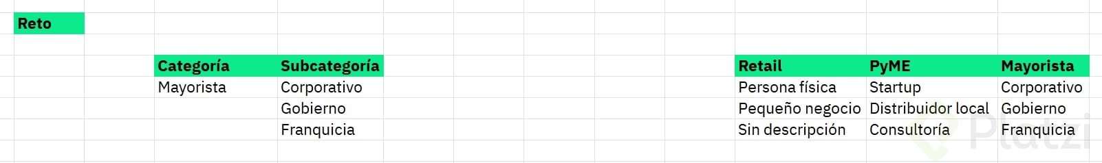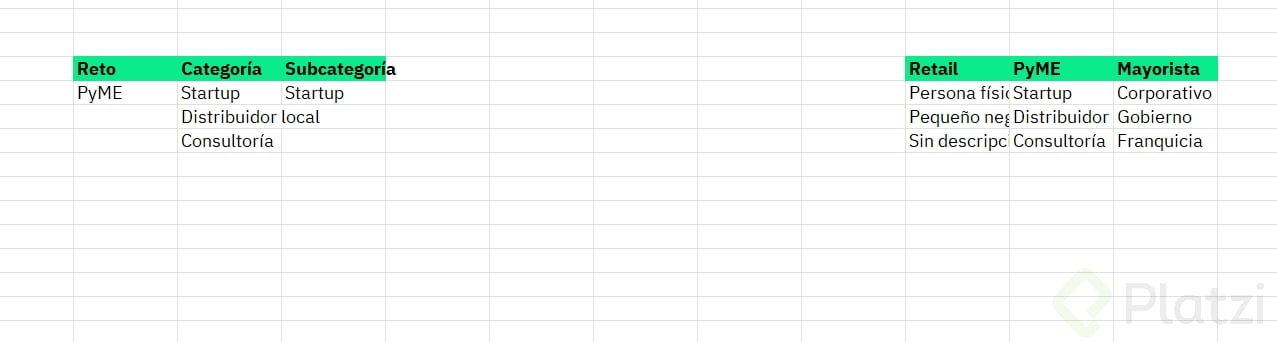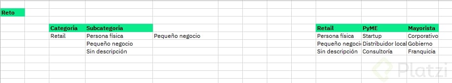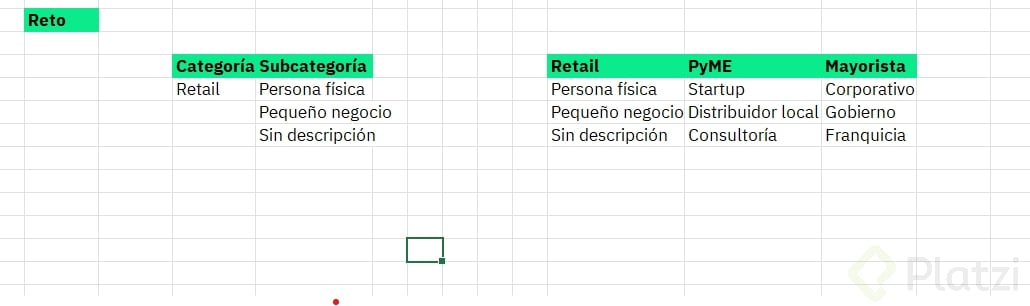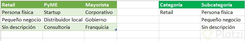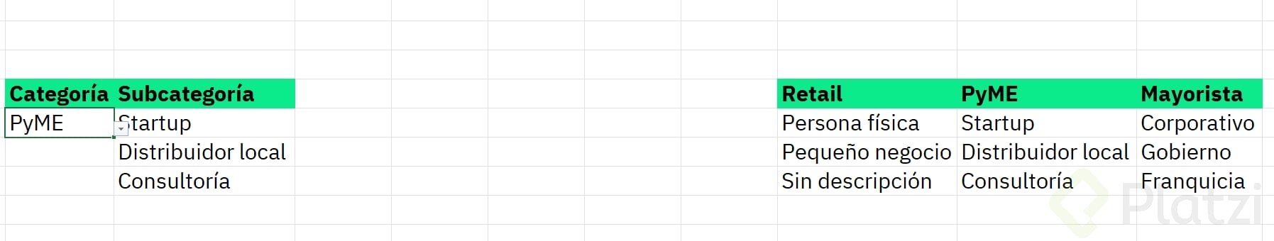- Matriz: tu tabla completa de categorías y subcategorías.