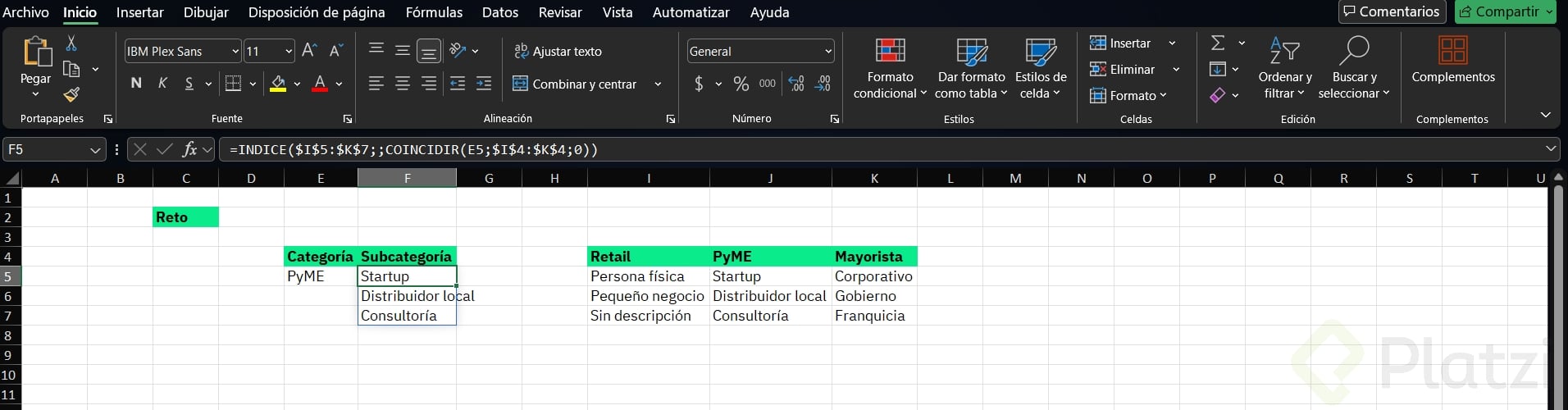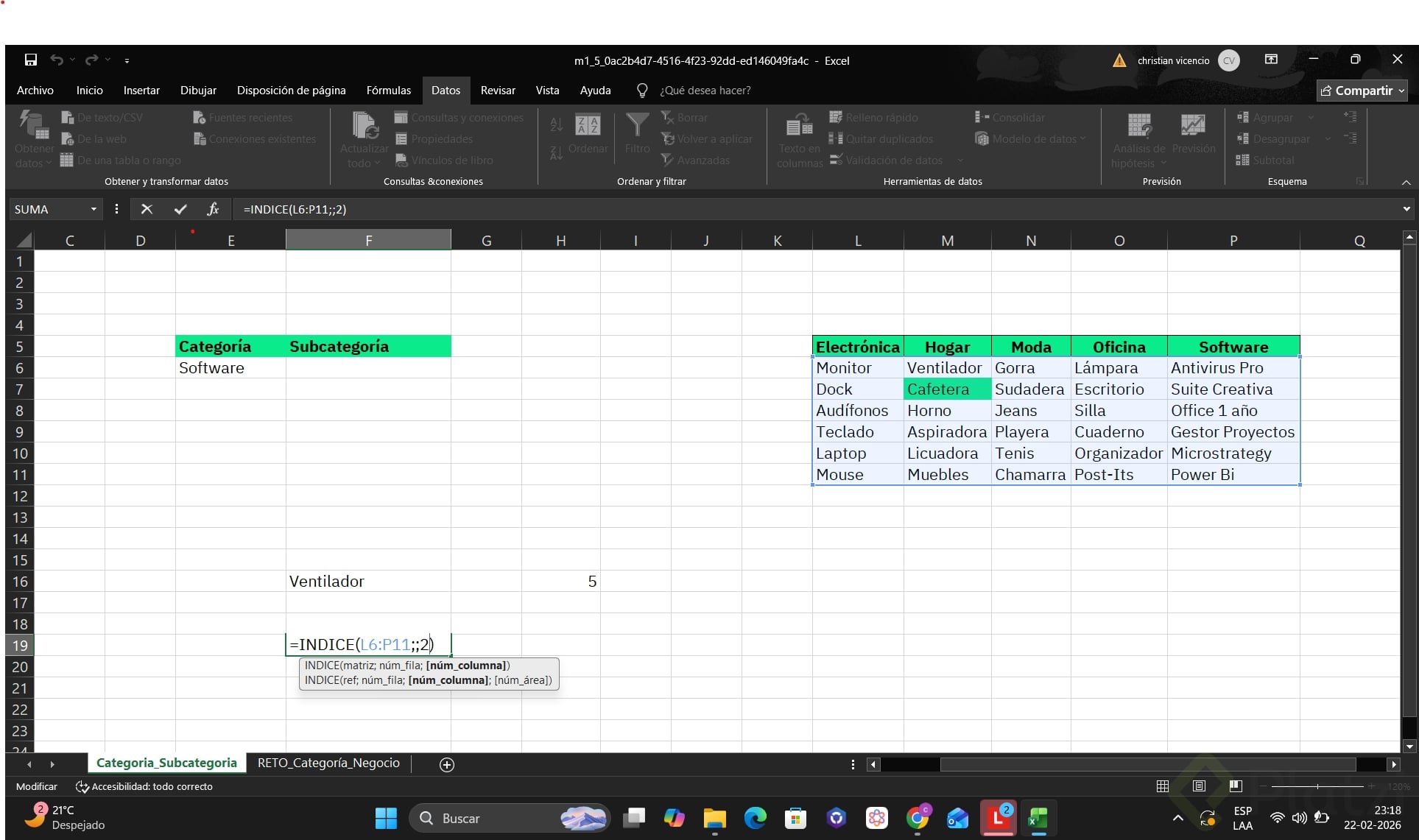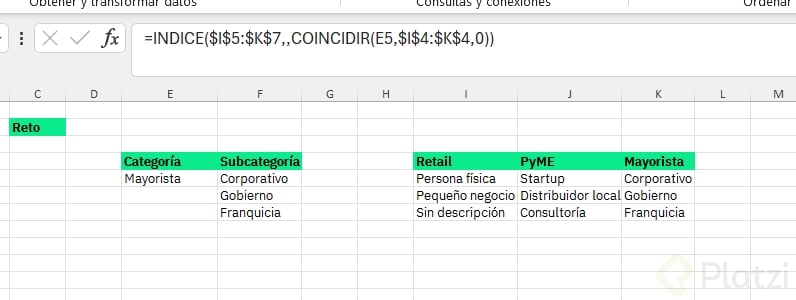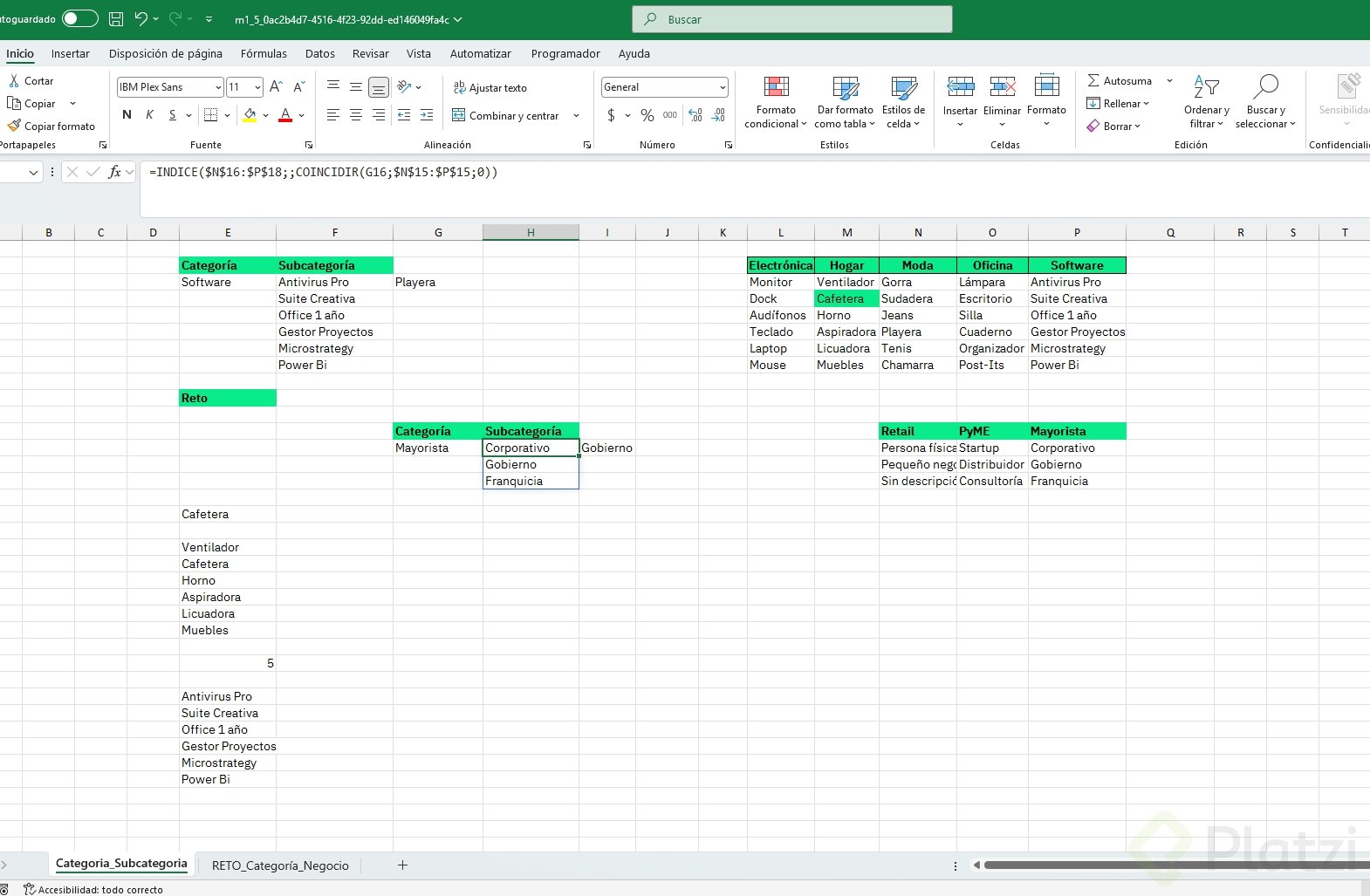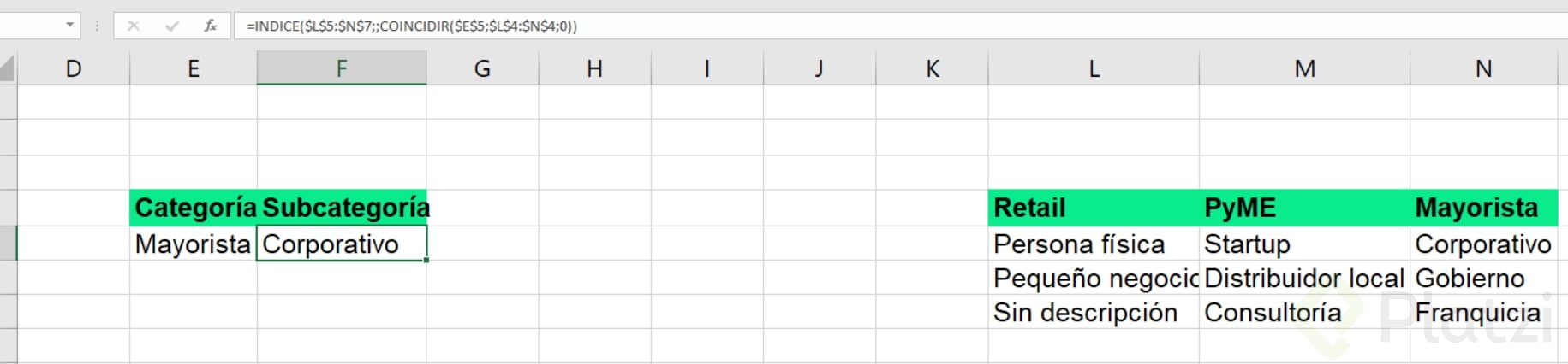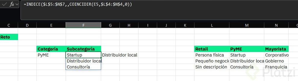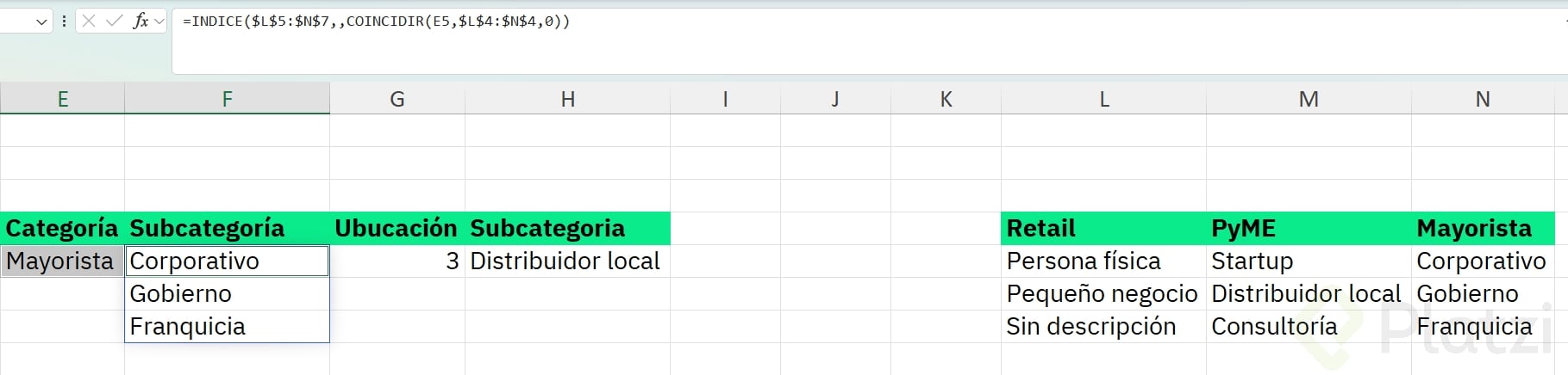 Integración práctica: índice usa la matriz completa; coincidir calcula la columna según la categoría seleccionada. Si cambias de “software” a “moda”, las subcategorías cambian en automático.