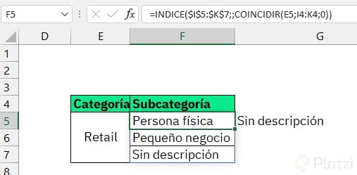 Índice recibe una matriz, un número de fila y un número de columna. Si apuntas a toda la matriz y dejas el número de fila en blanco para traer todas las filas, podrás devolver una columna completa de subcategorías. Cuando se especifica una fila y columna, devuelve una sola celda; por ejemplo, fila dos y columna dos devuelve “cafetera”.