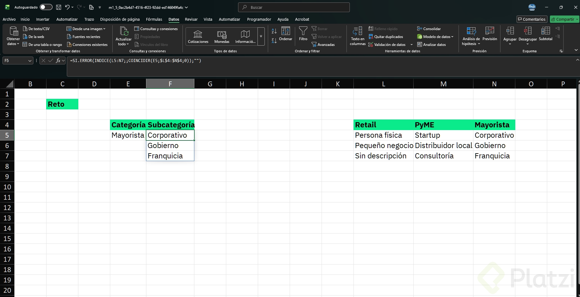 Habilidades que refuerzas: validación de datos para listas, uso de índice para devolver matrices por columna, coincidir con coincidencia exacta (0) y fijación de rangos con F4. Viene perfecto para el siguiente módulo de tablas dinámicas avanzadas. ¿Qué parte te gustaría practicar más o qué duda quieres resolver?