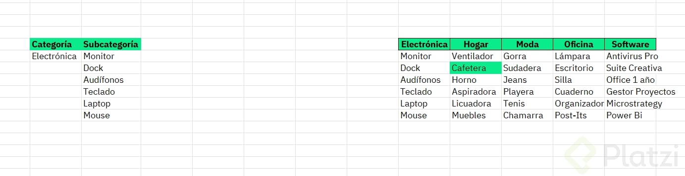 Una lista anidada conecta dos menús: eliges una categoría y, automáticamente, el segundo menú muestra sus subcategorías. Por ejemplo: hogar, moda u oficina activan opciones distintas. Esto evita mostrar todo a la vez y facilita el análisis.