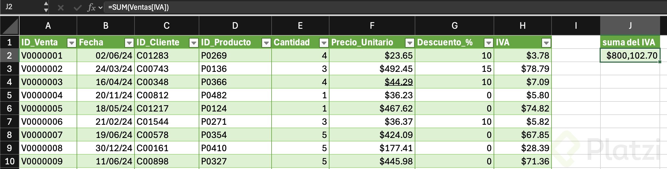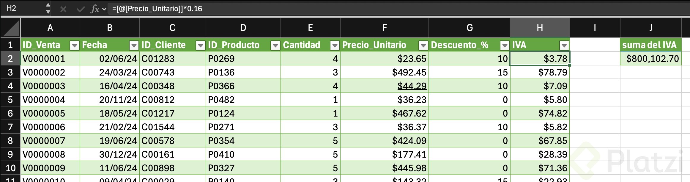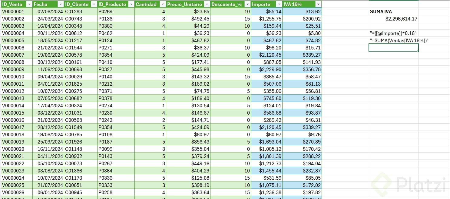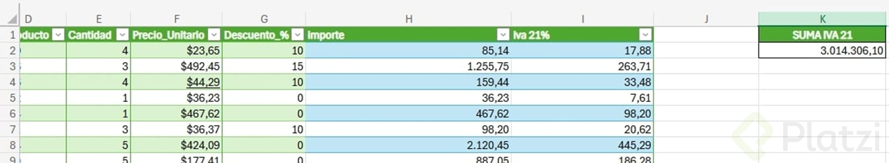 Todo lo anterior son referencias dinámicas en tablas. Ahora, un reto práctico: crea el IVA con referencia dinámica dentro de tu tabla y luego calcula la suma solo del IVA también con referencias dinámicas. ¿Te animas? Comparte tu captura de pantalla en comentarios y cuéntame cómo te fue.