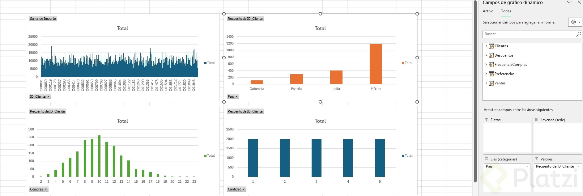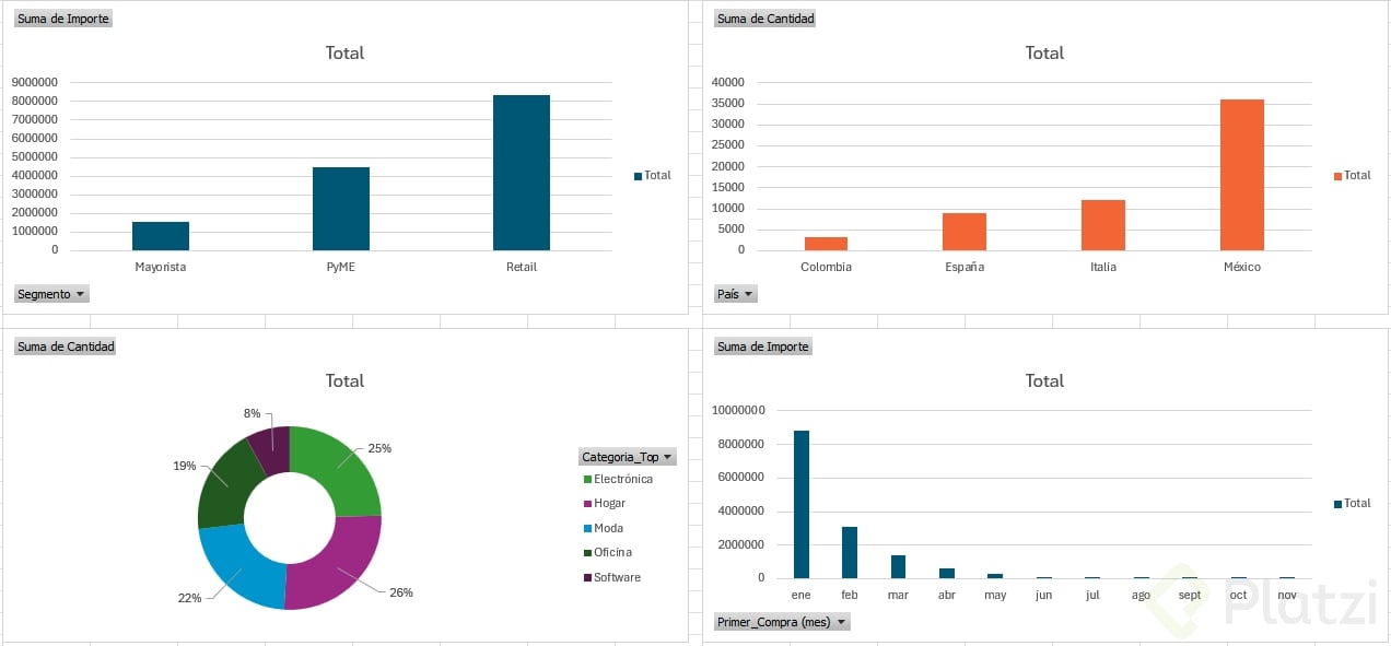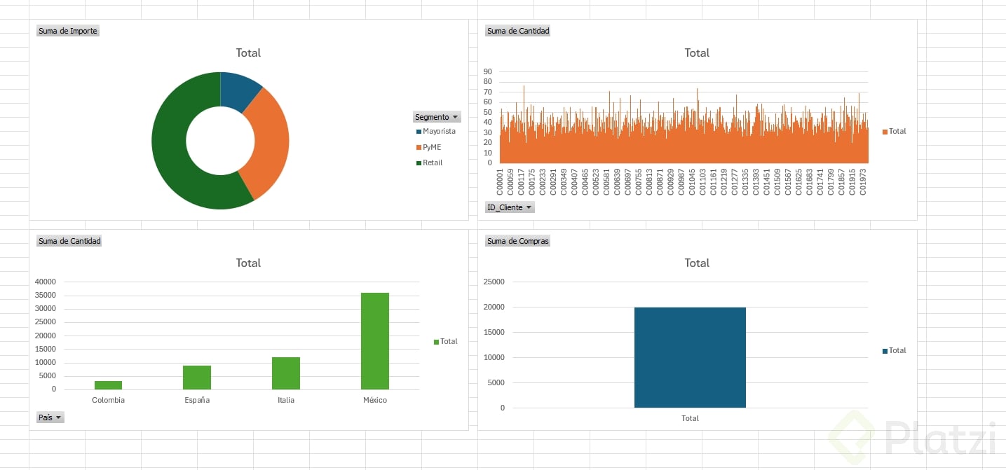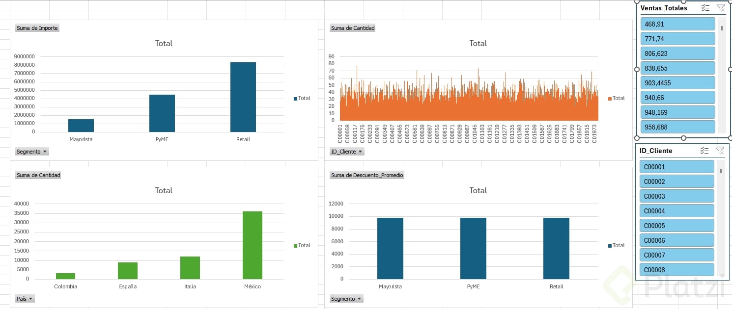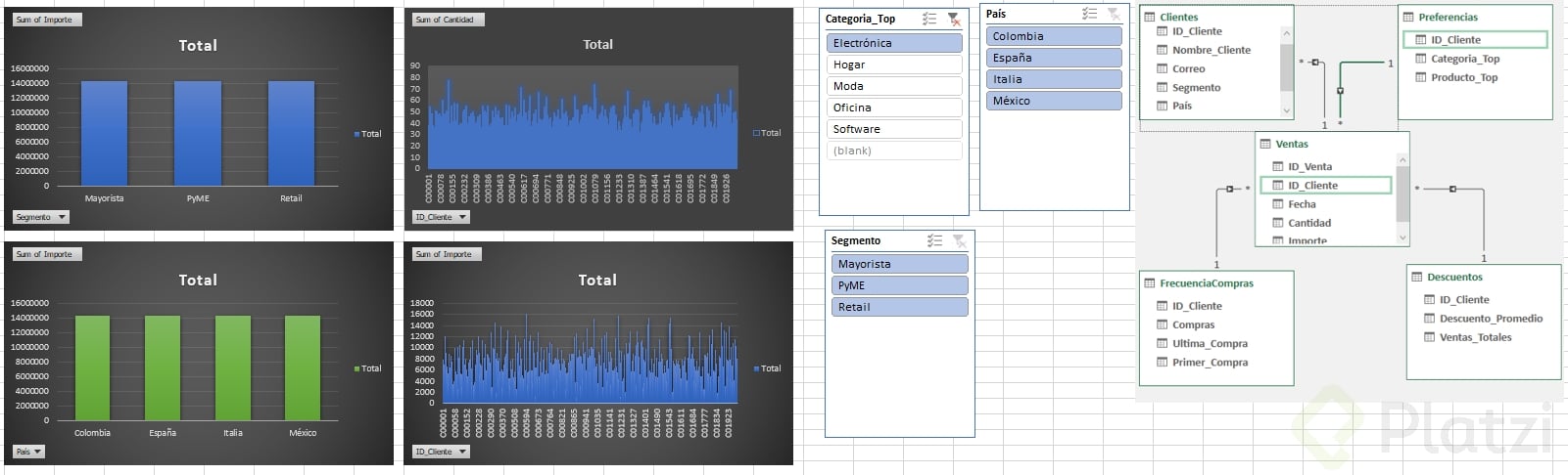 - Crea visualizaciones cruzando tablas: por ejemplo, ventas por segmento, ventas por preferencias o suma de compras.