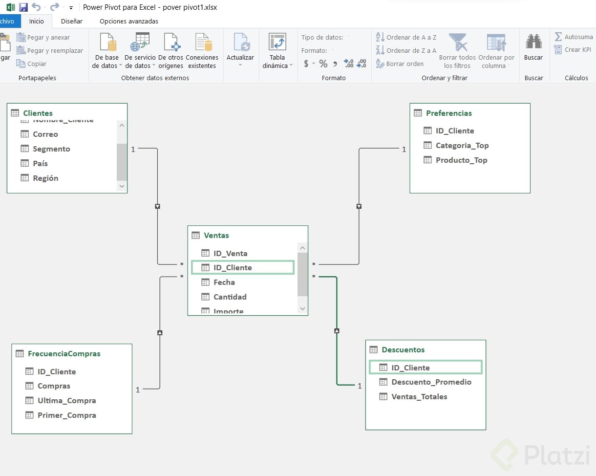 - Identifica un campo llave (por ejemplo, ID cliente) que se repite entre tablas.