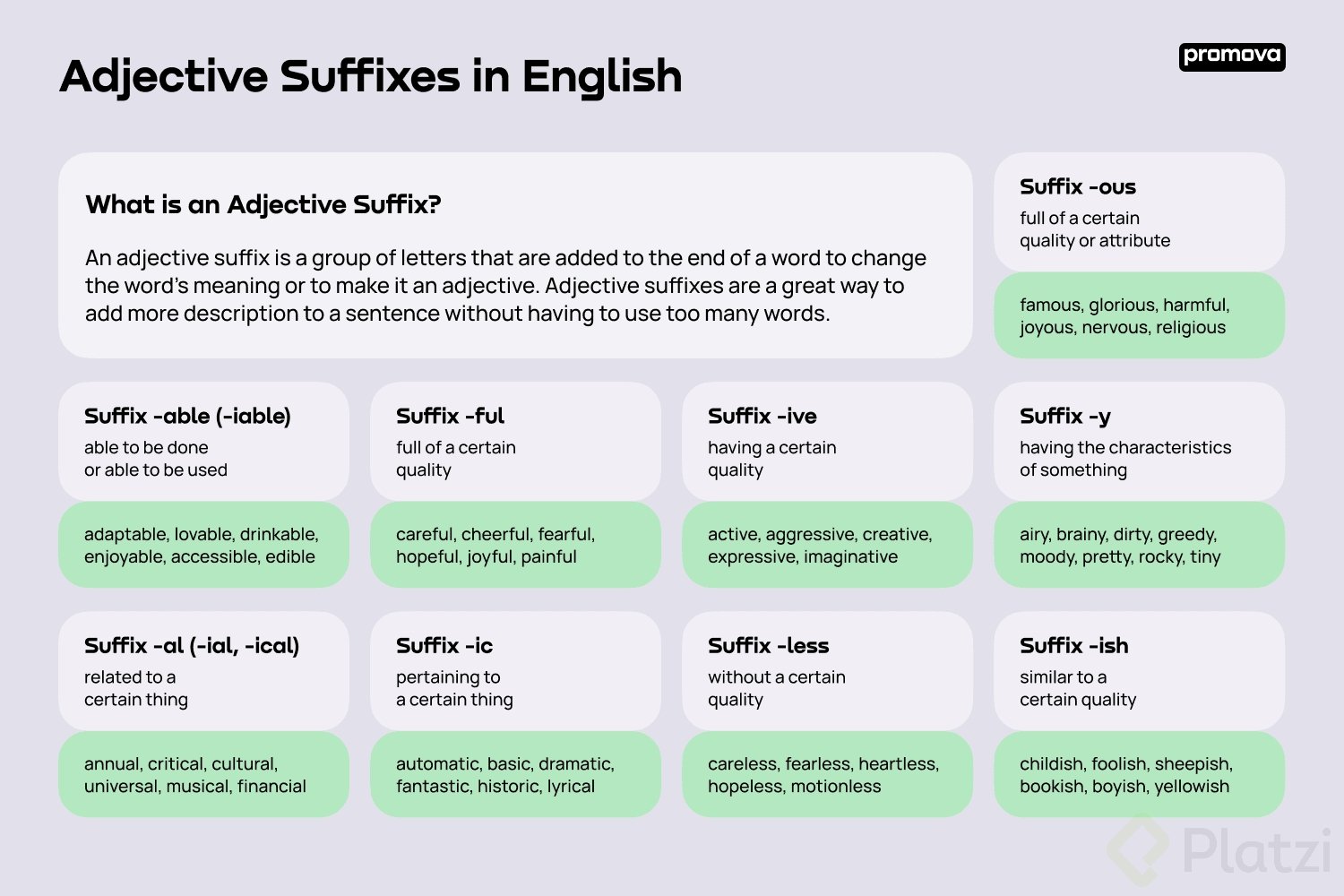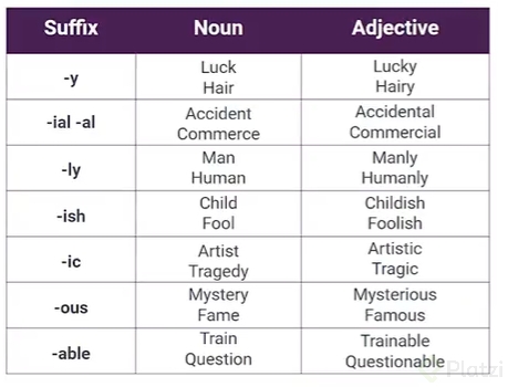 Presta atención a la siguiente tabla en la que encontrarás cómo puedes ir añadiendo unos sufijos a sustantivos normales, los convertimos en adjetivos. Muchos parecidos a los que usamos en español.